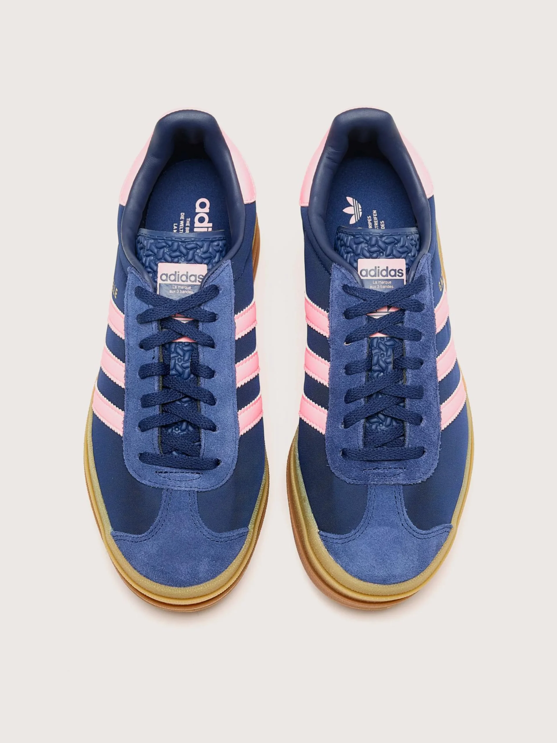 De Adidas Gazelle Bold heritage sneakers hebben een drielagen rubberen zool en een suède bovenwerk.