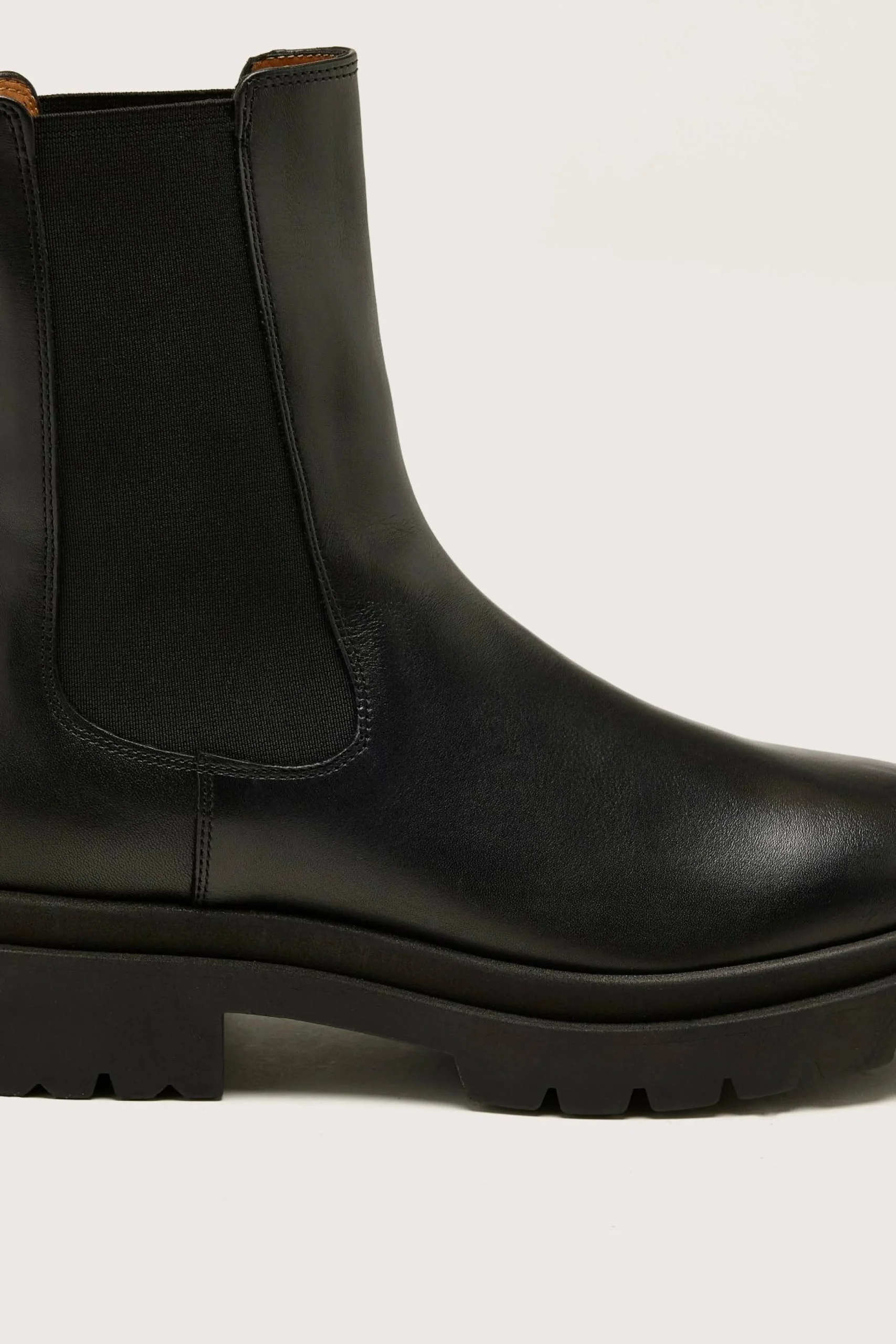 The Anthology Paris Senia boots in black Seda leather are classic Chelsea boots with modern, thick rubber soles and an elevated heel.