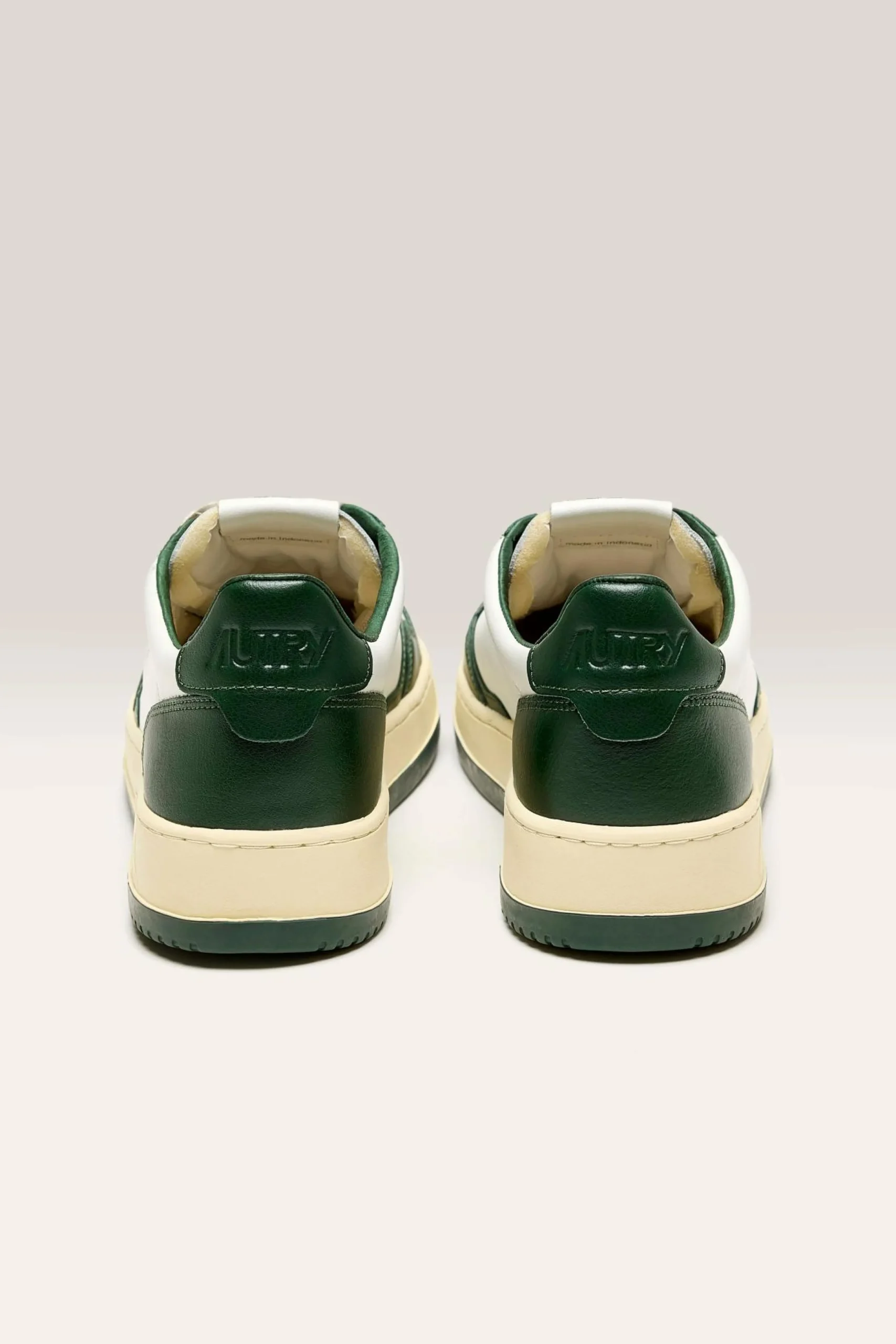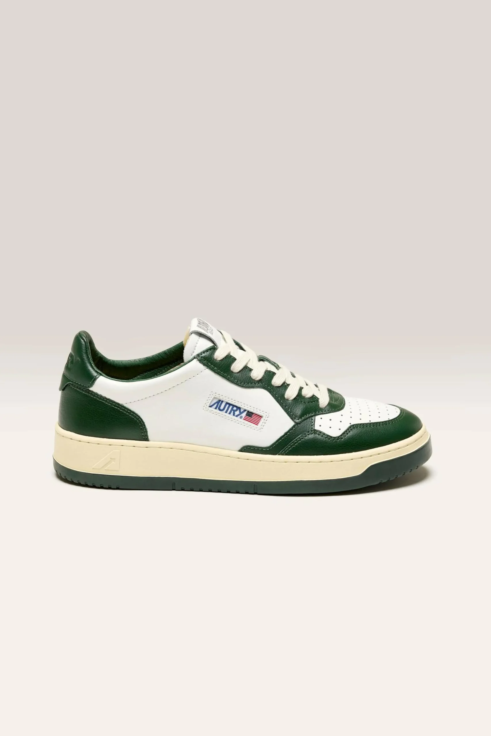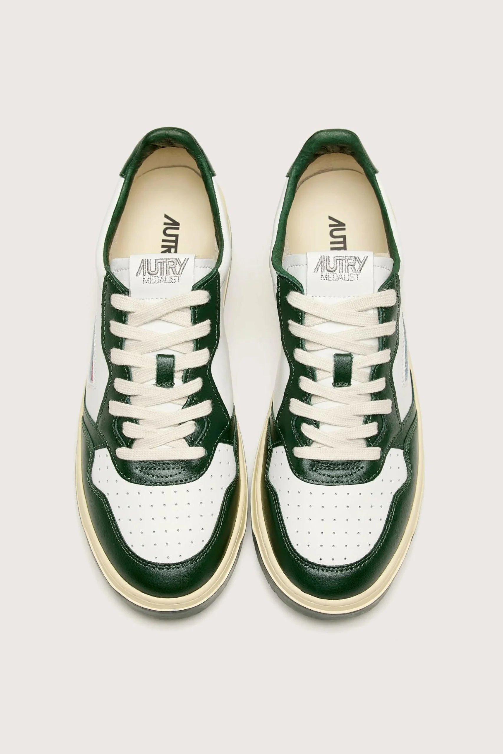 The Autry Medalist Low Bicolor sneaker features a white and green supple leather upper with a perforated toe.