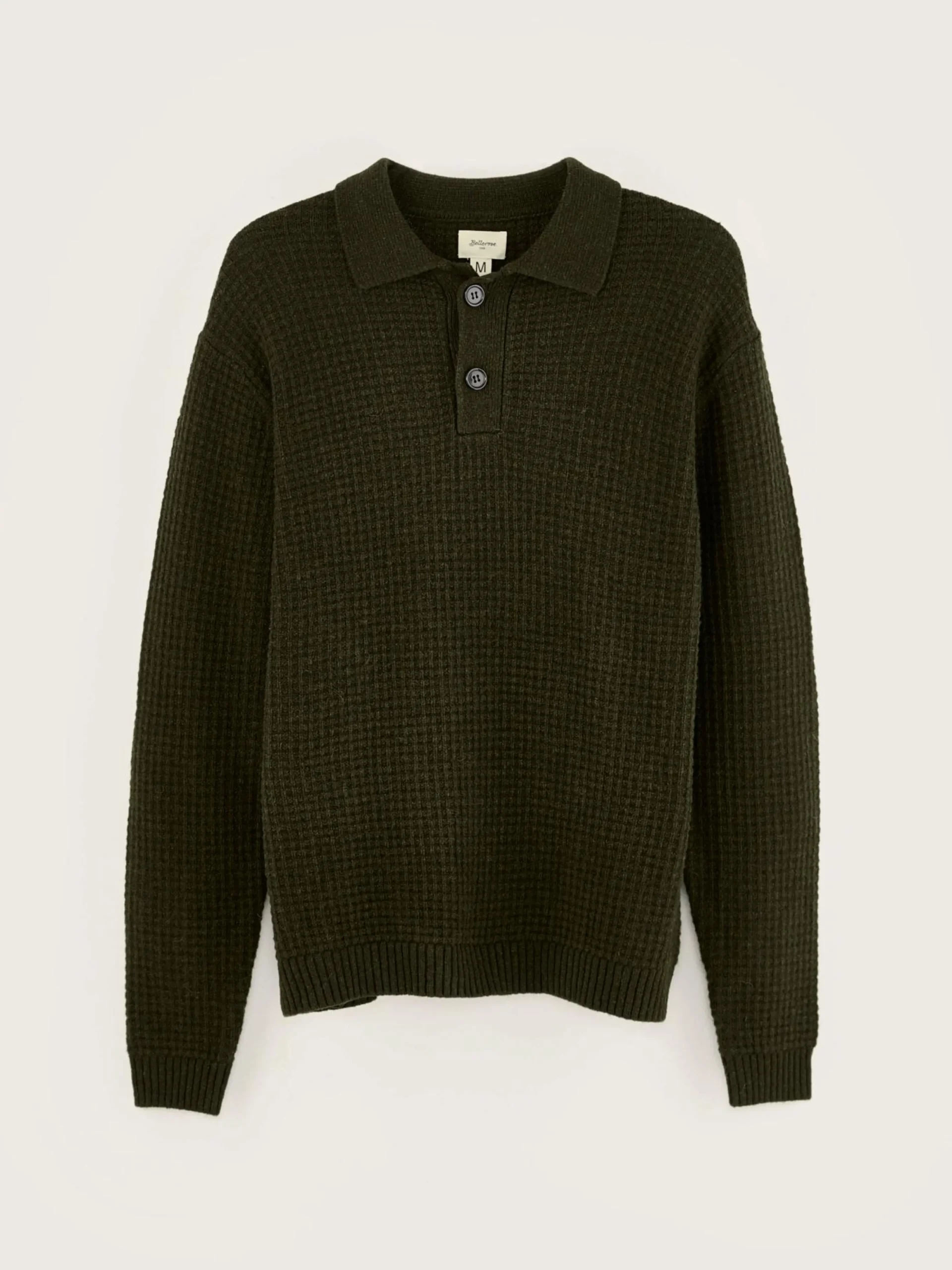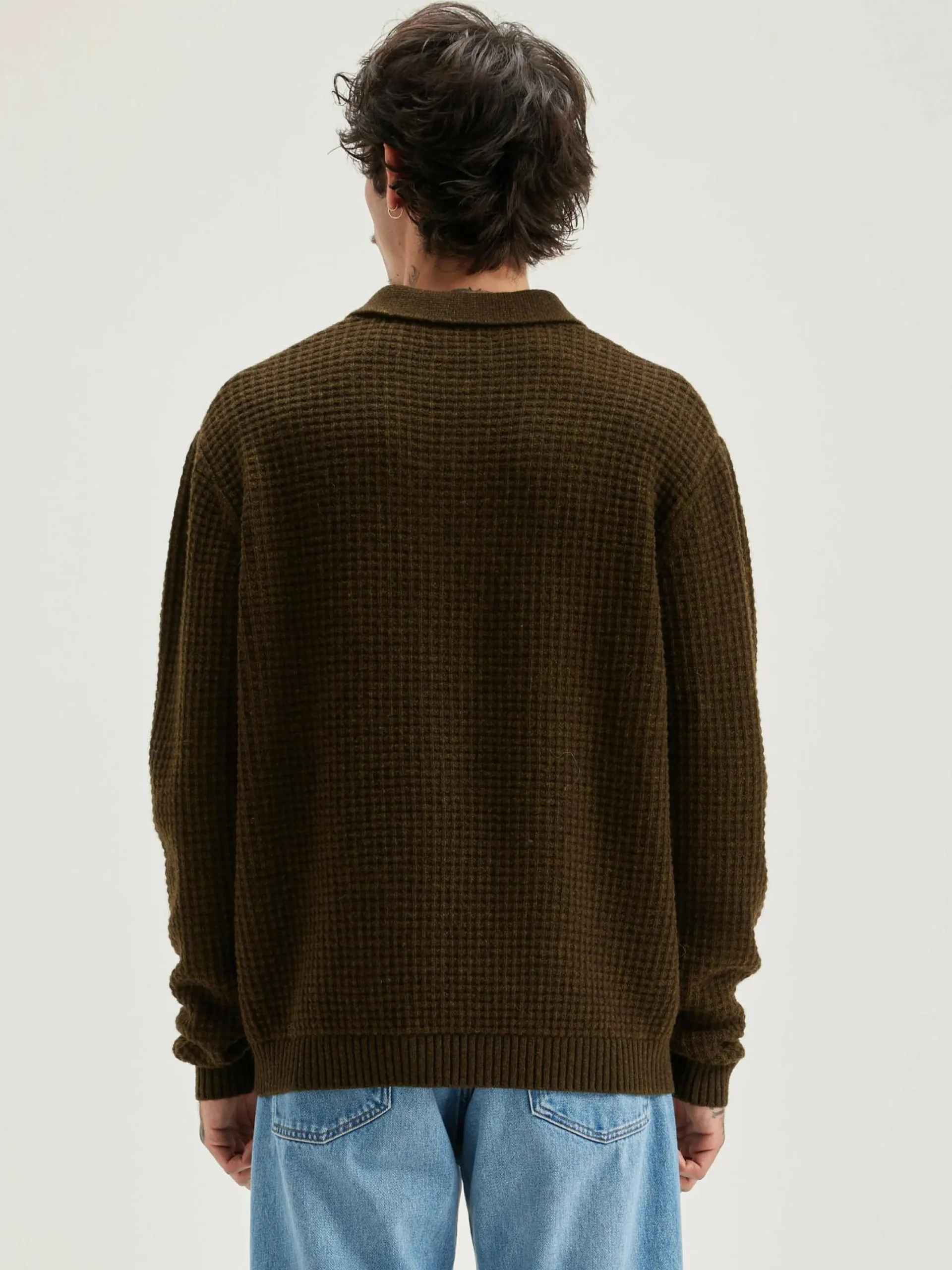 Comfortabele sweater in polostijl, van wafeltricot met olijfgroene wol.