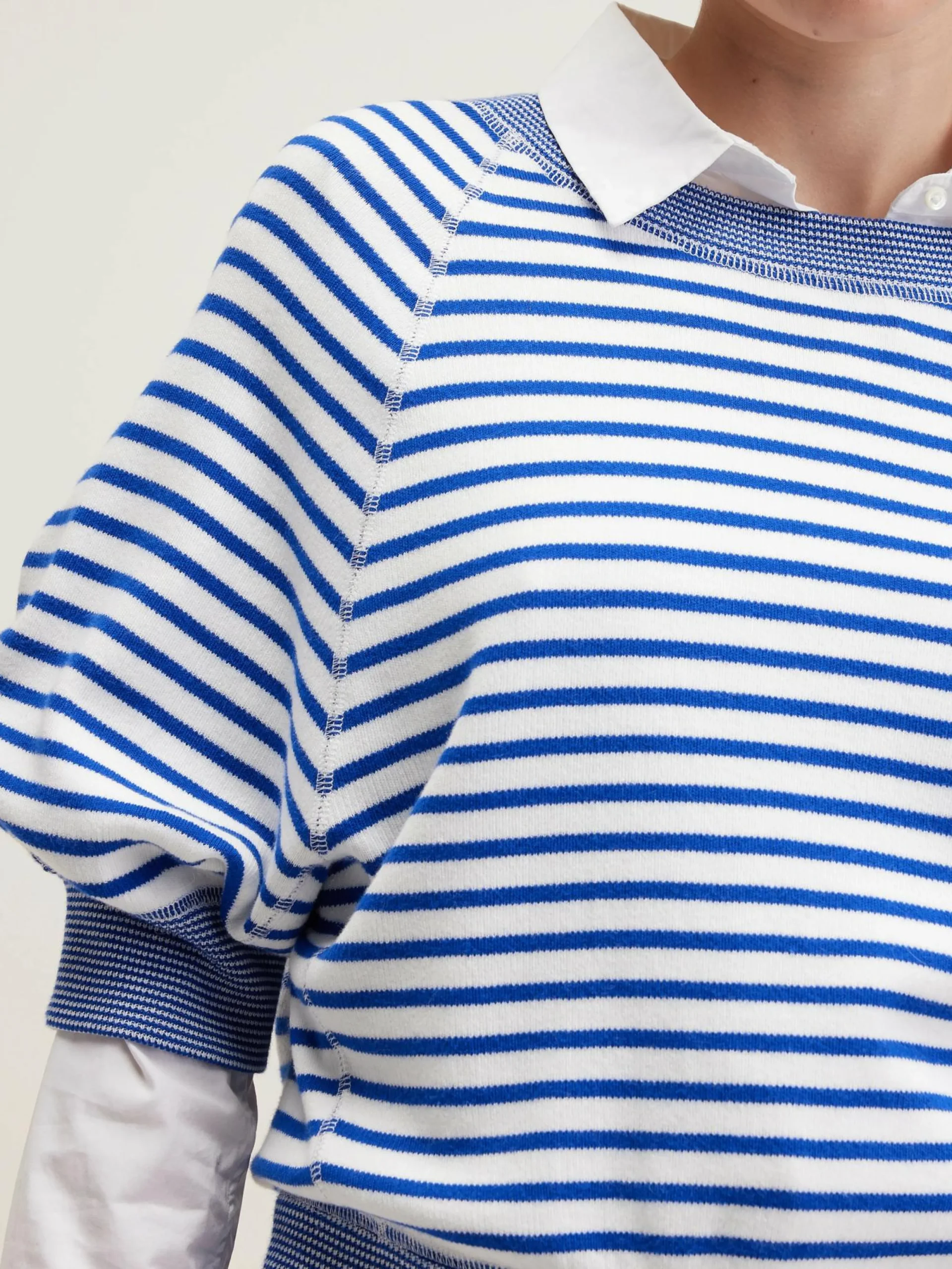 Oversizede crewneck trui met 3/4 mouwen en geribde boorden in ecru katoen met blauwe strepen.