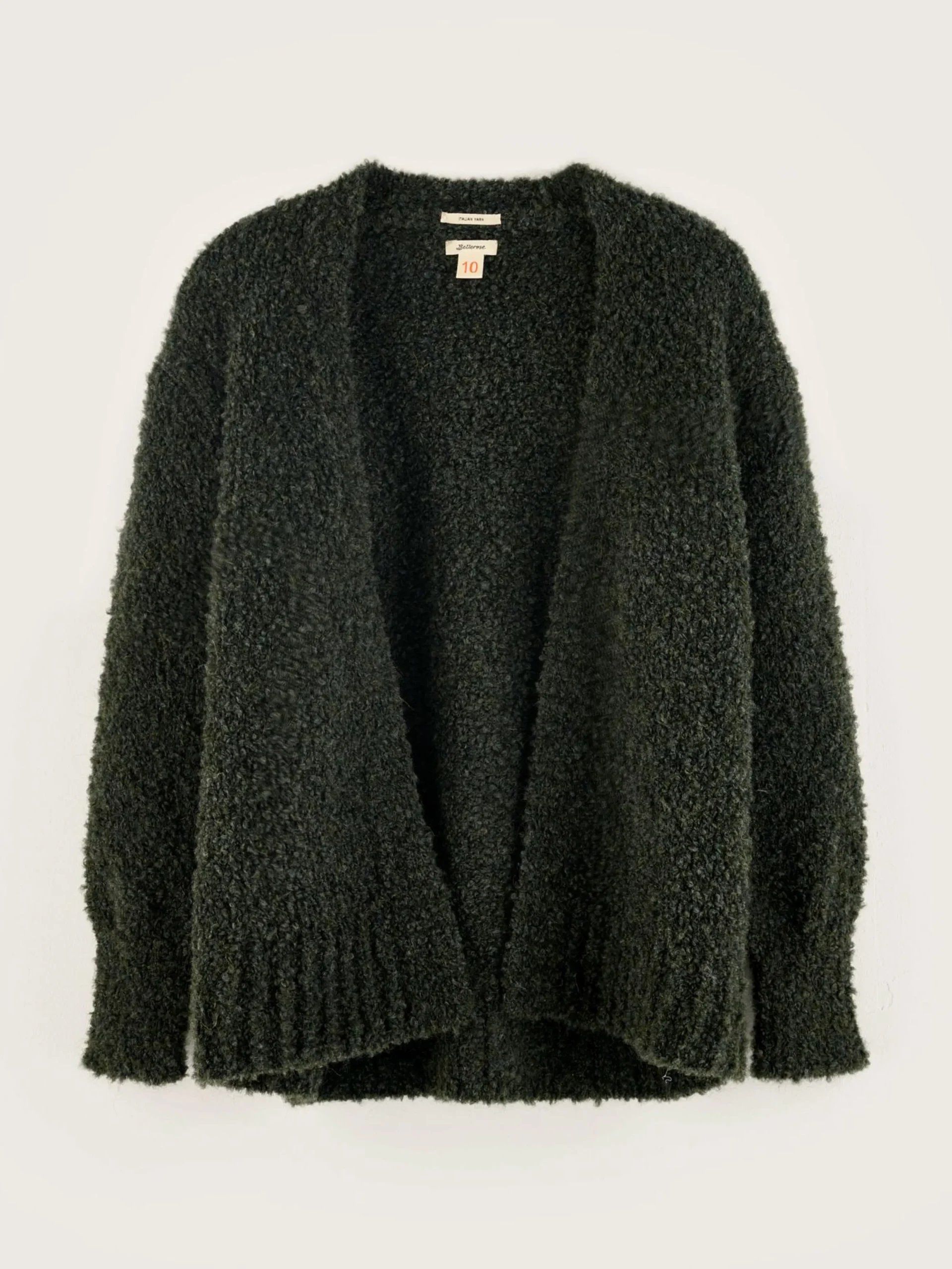 Mosgroene rechte, lange cardigan van bouclé garen.
