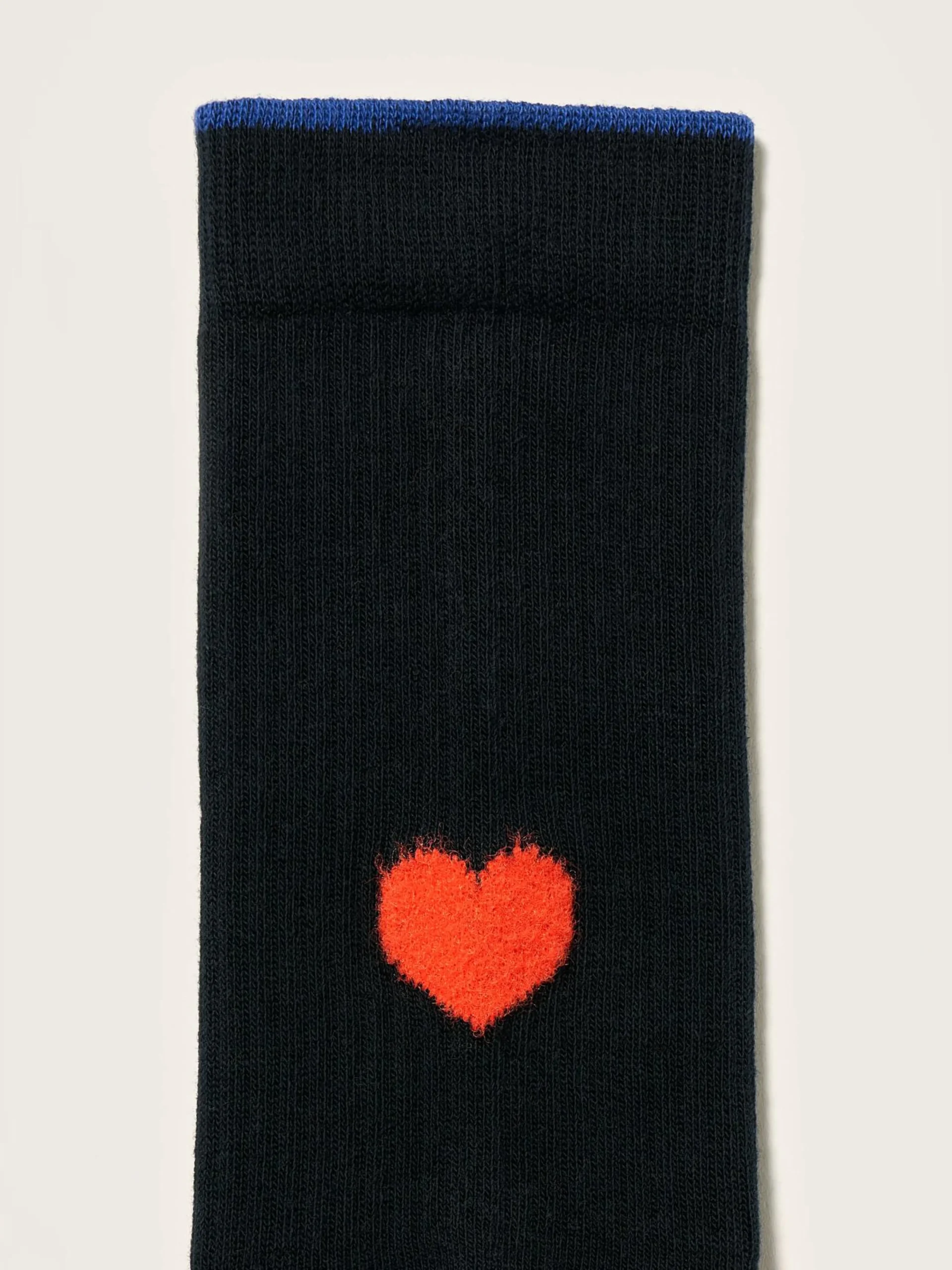Klassieke, marineblauwe sokken met een contrasterend hart op de hiel