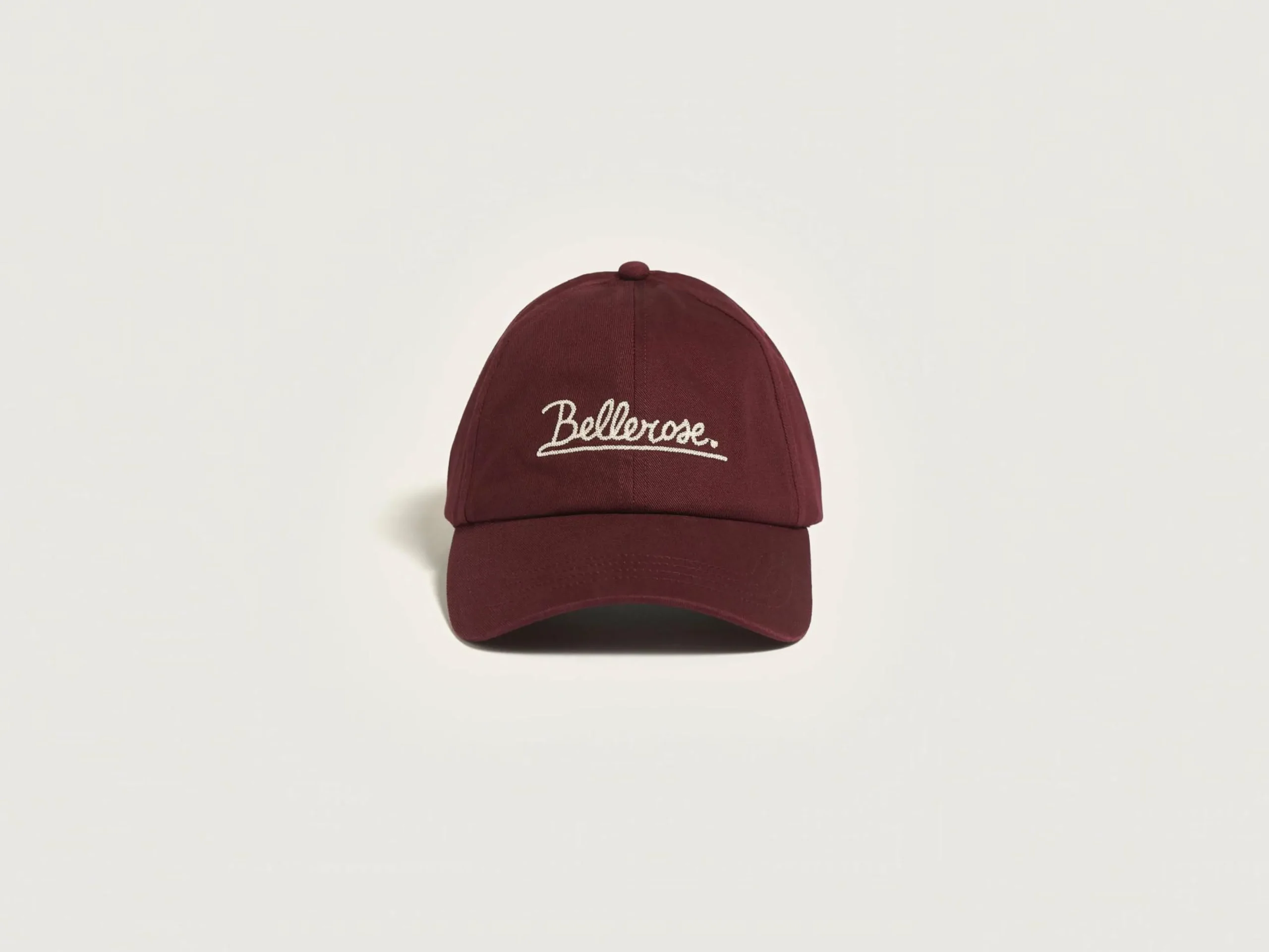 Klassieke 6-panel pet van bordeauxrood katoen met ecru Bellerose borduursel op de voorkant.