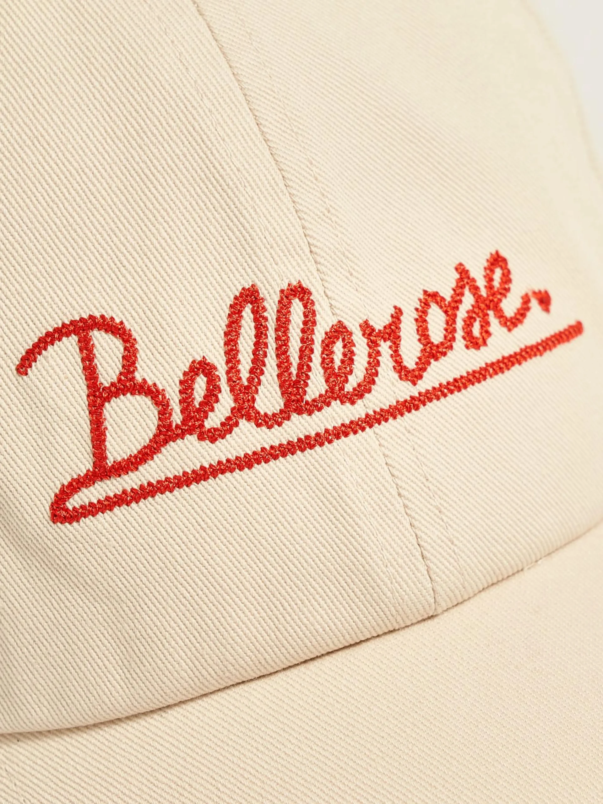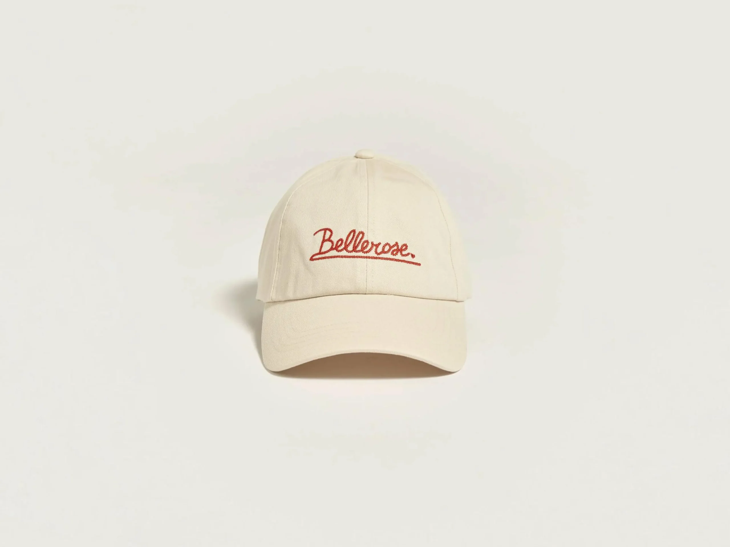 Klassieke 6-panel pet van ecru katoen met rood Bellerose borduursel op de voorkant.