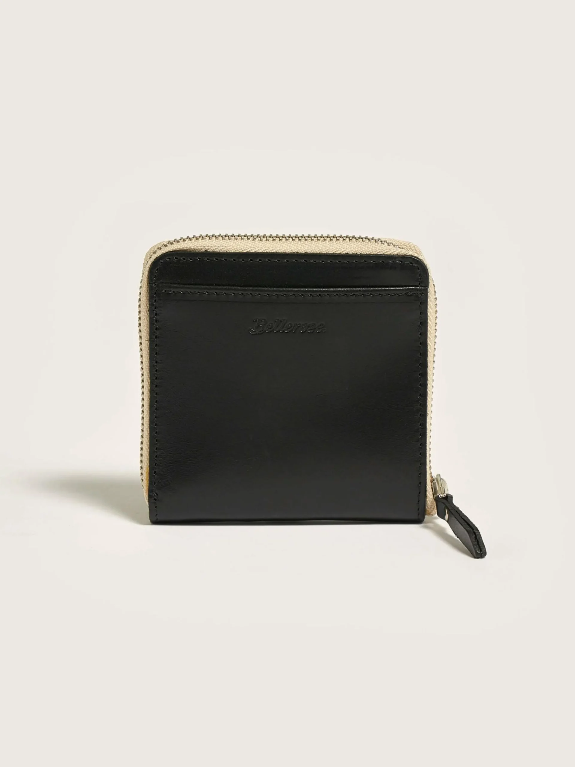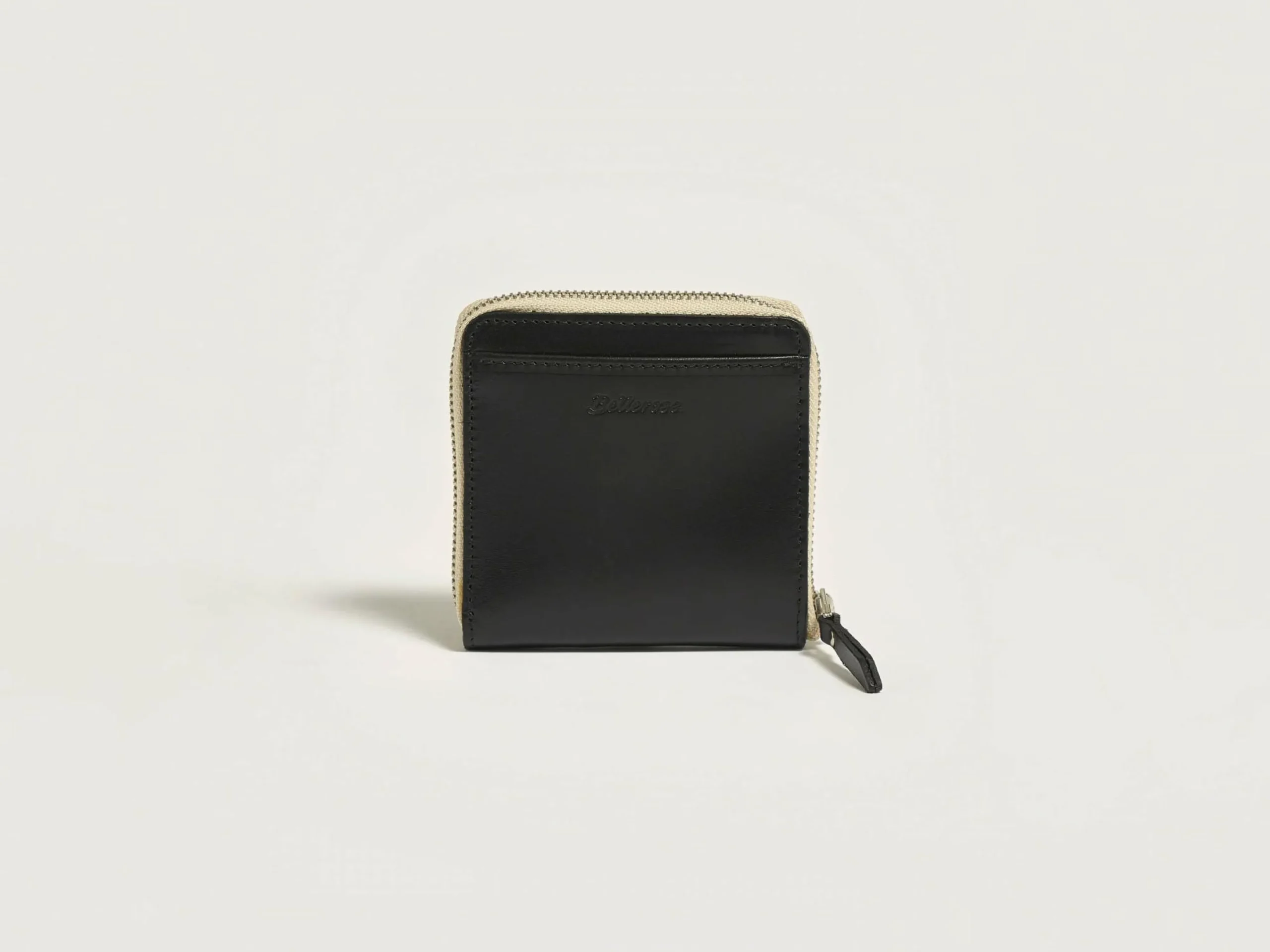 Vierkante portemonnee van glad zwart leer met rits, meerdere kaartsleuven en een muntvak.