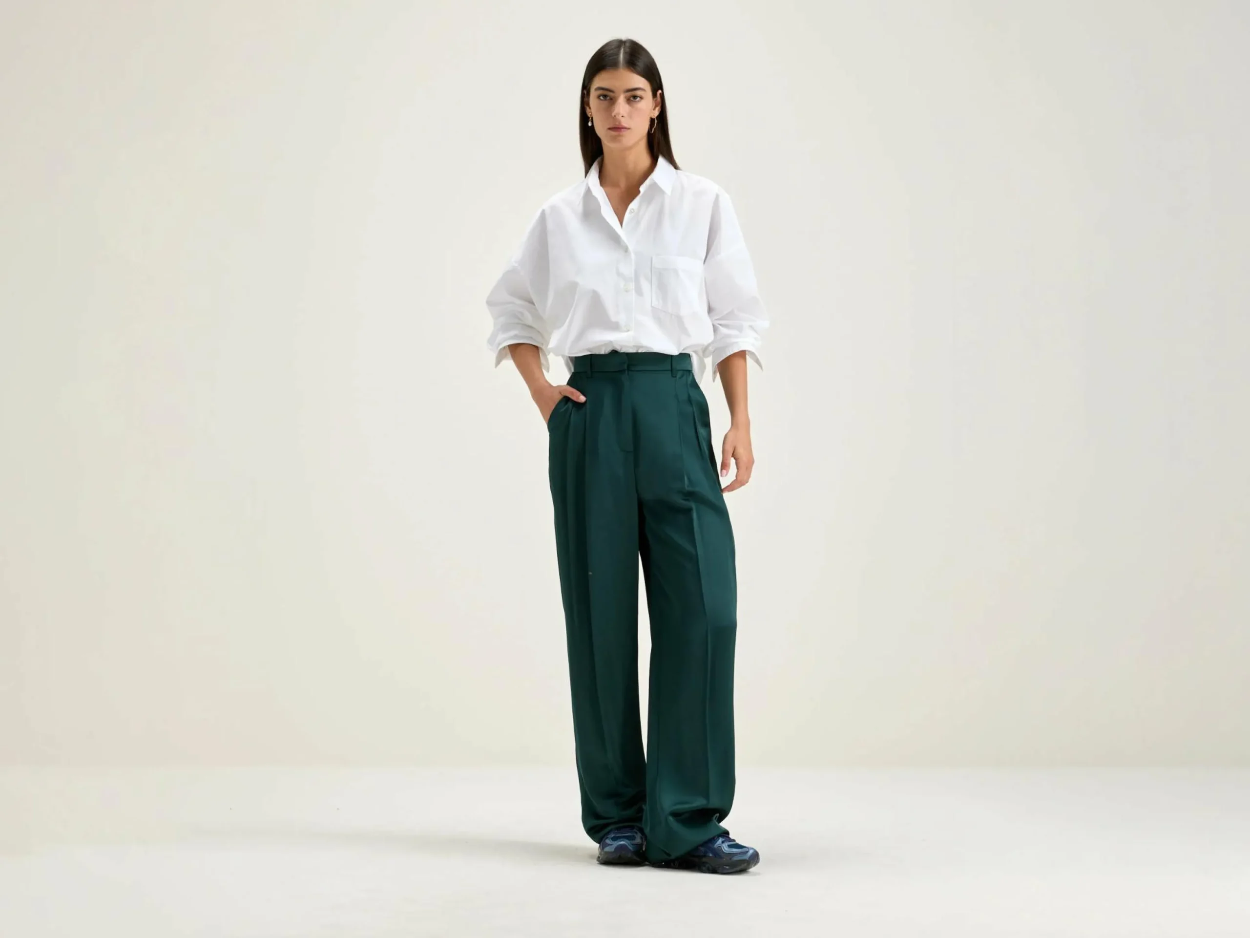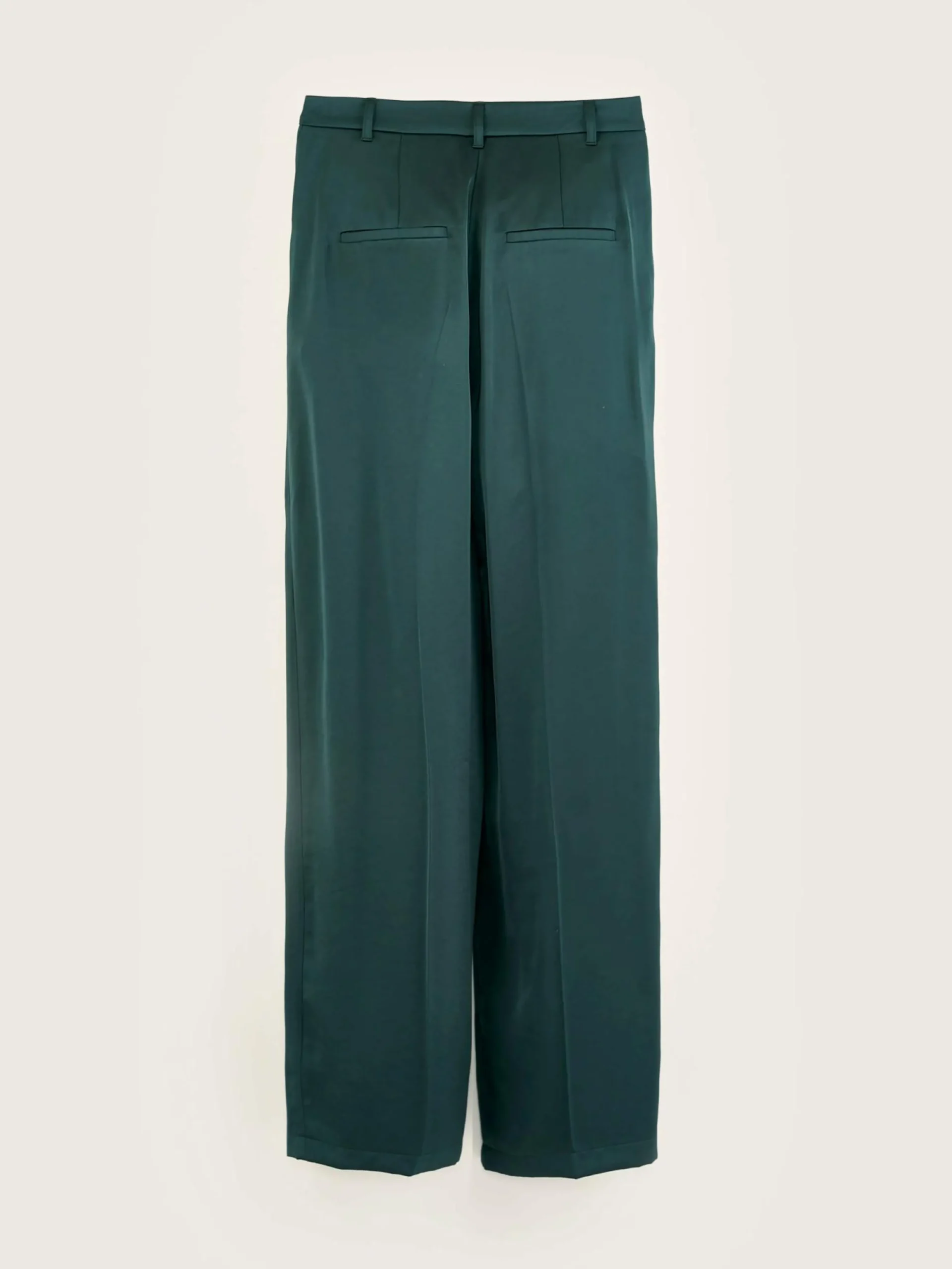 Elegante, donkergroene high-waist broek met brede pijpen en plooien aan de voorkant.