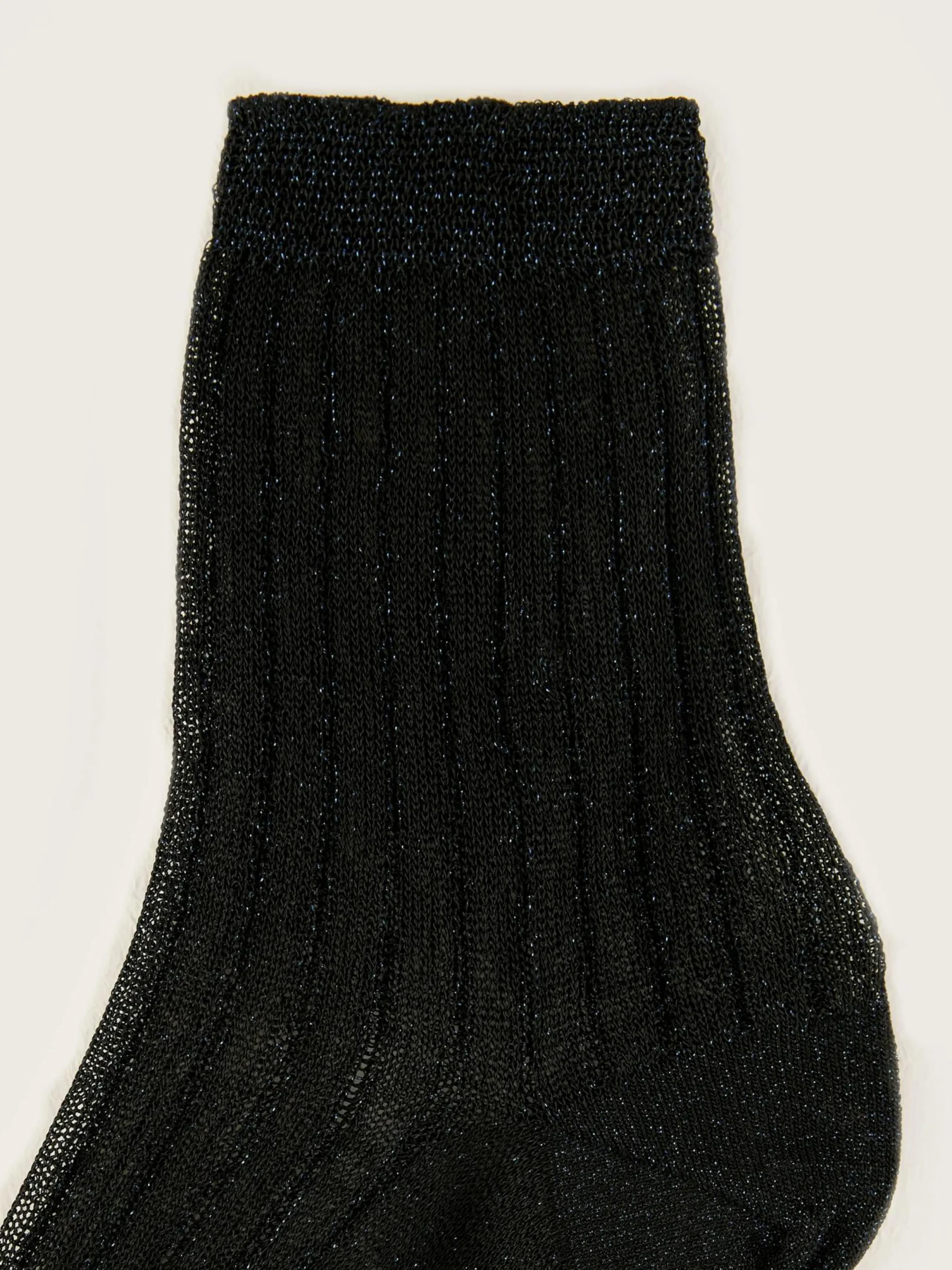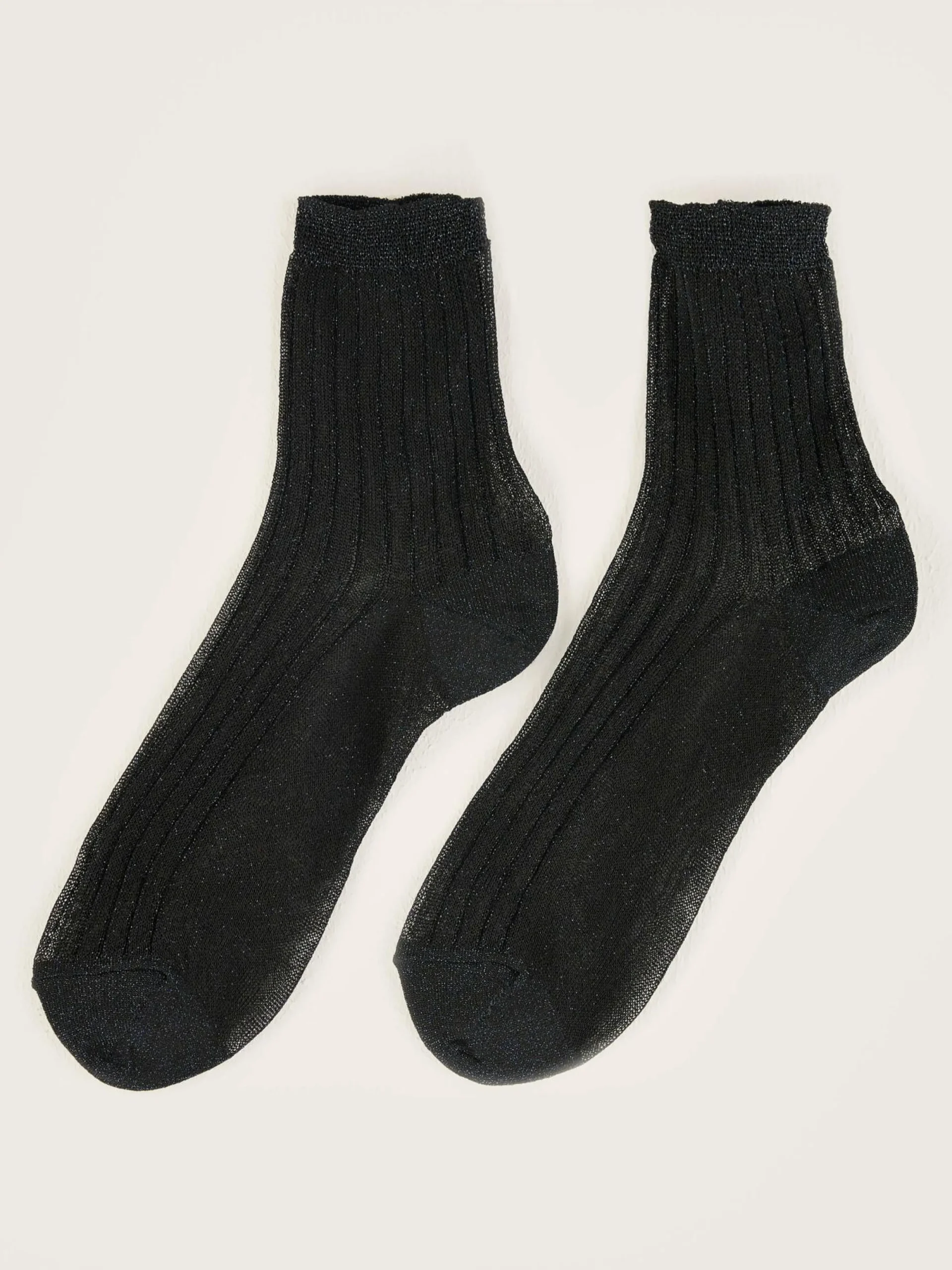 Korte sokken met een geribbelde textuur en een transparante, metallic look. Een subtiel en toch speels accent aan je voeten, dat zijn ze!