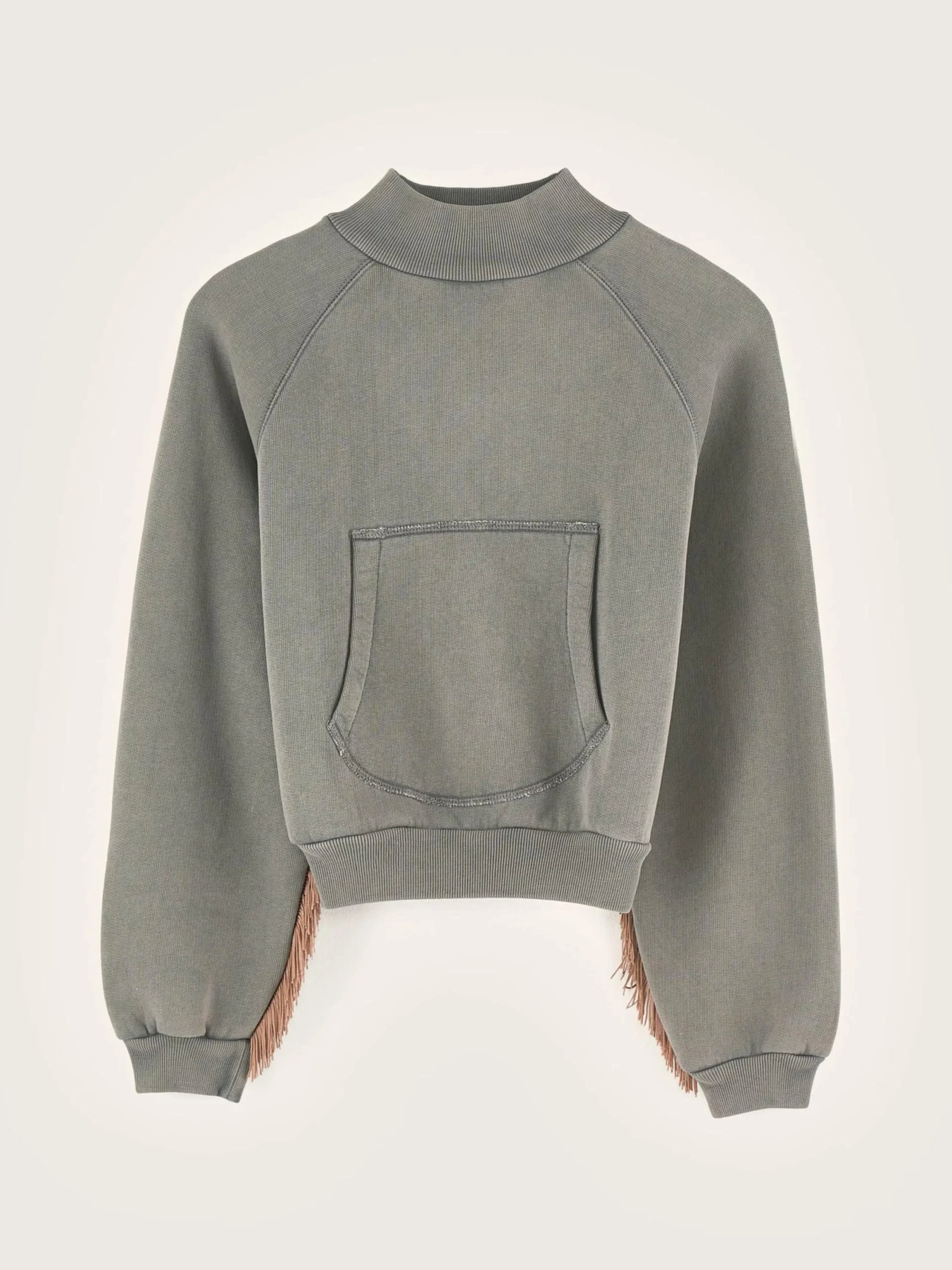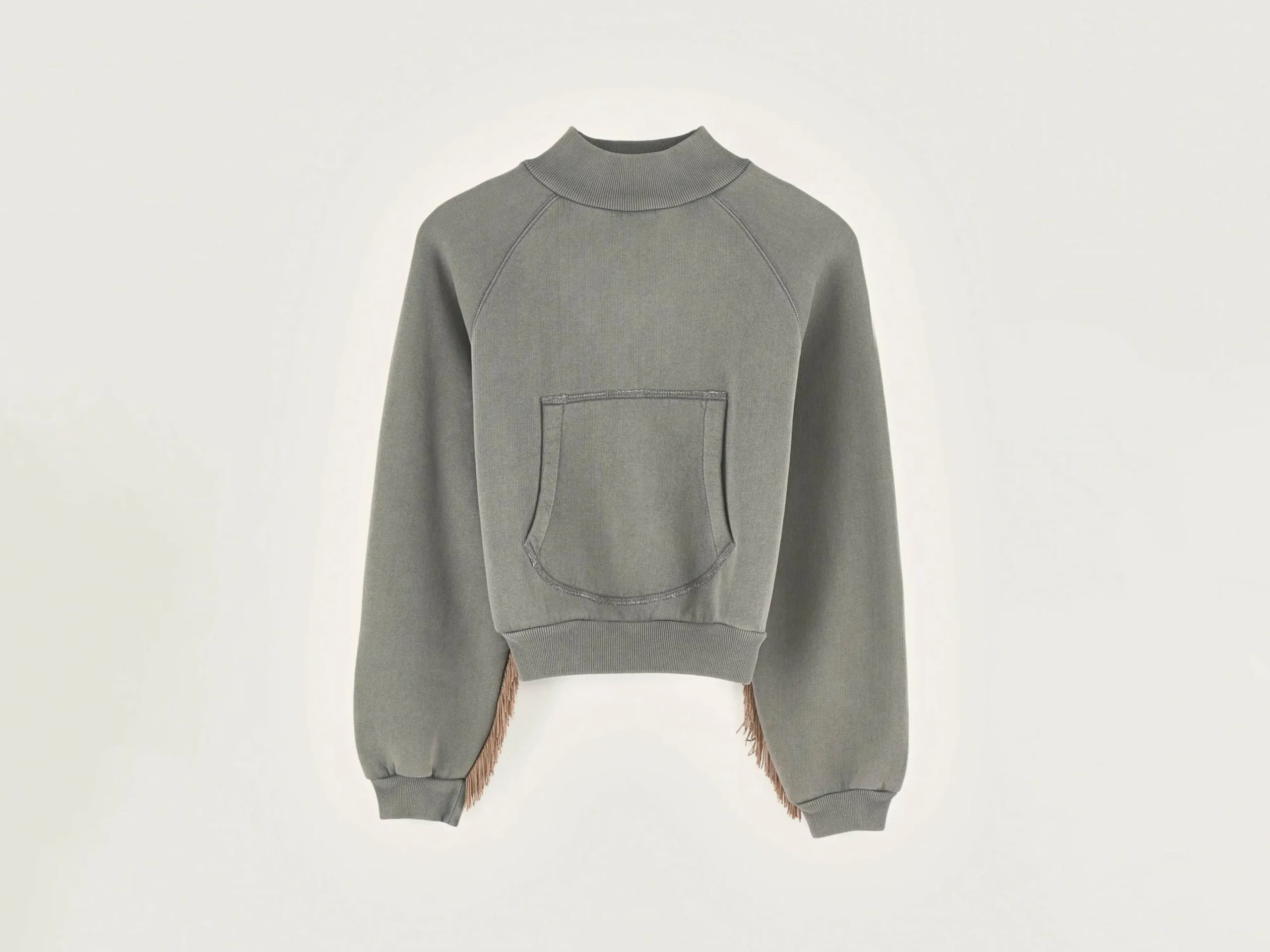 Donkergrijs, comfortabel sweatshirt met franjes en een opstaande kraag.