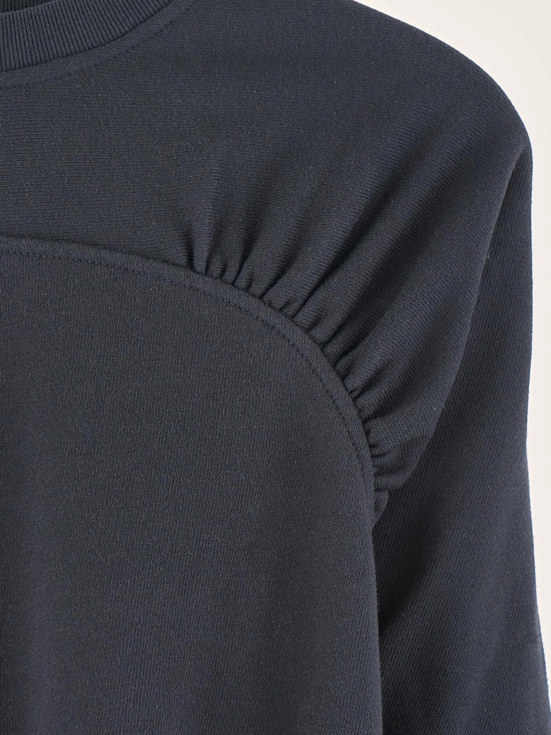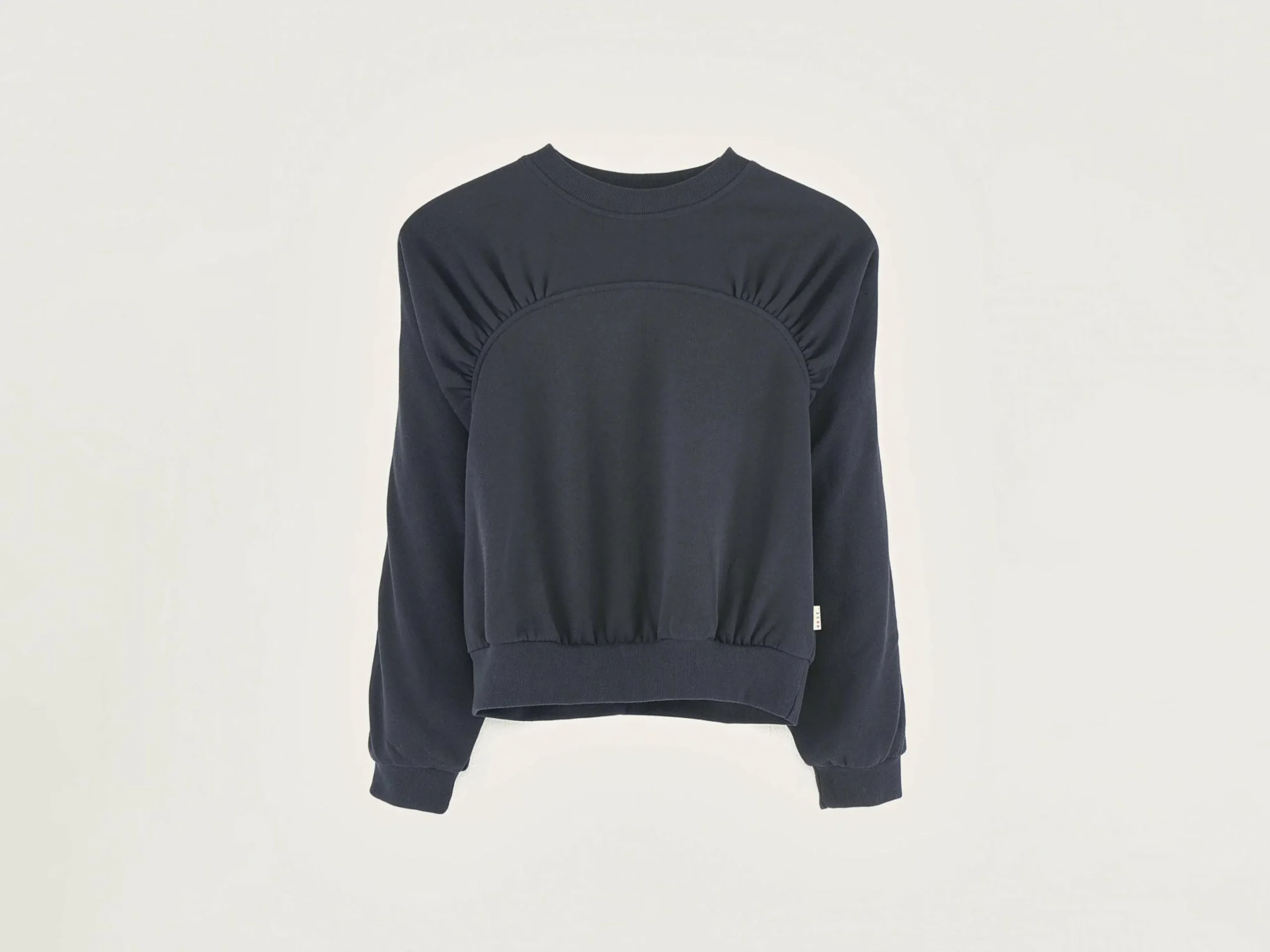 Donkerblauw, comfortabel sweatshirt van geborstelde sponsfleece, met gefronste details.
