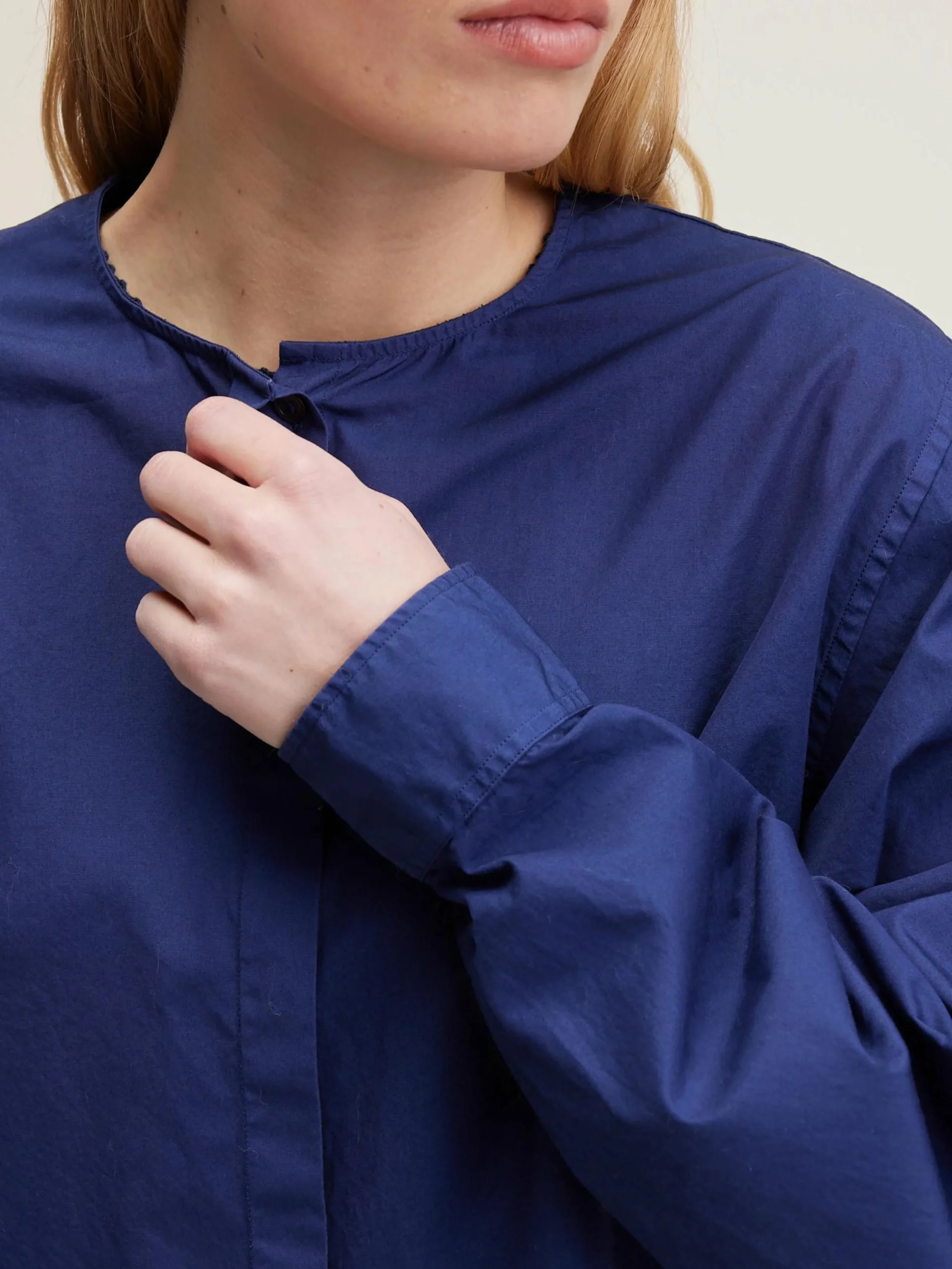 Overhemd met ronde hals en lange mouwen met ruches, van marineblauwe katoenpopeline.