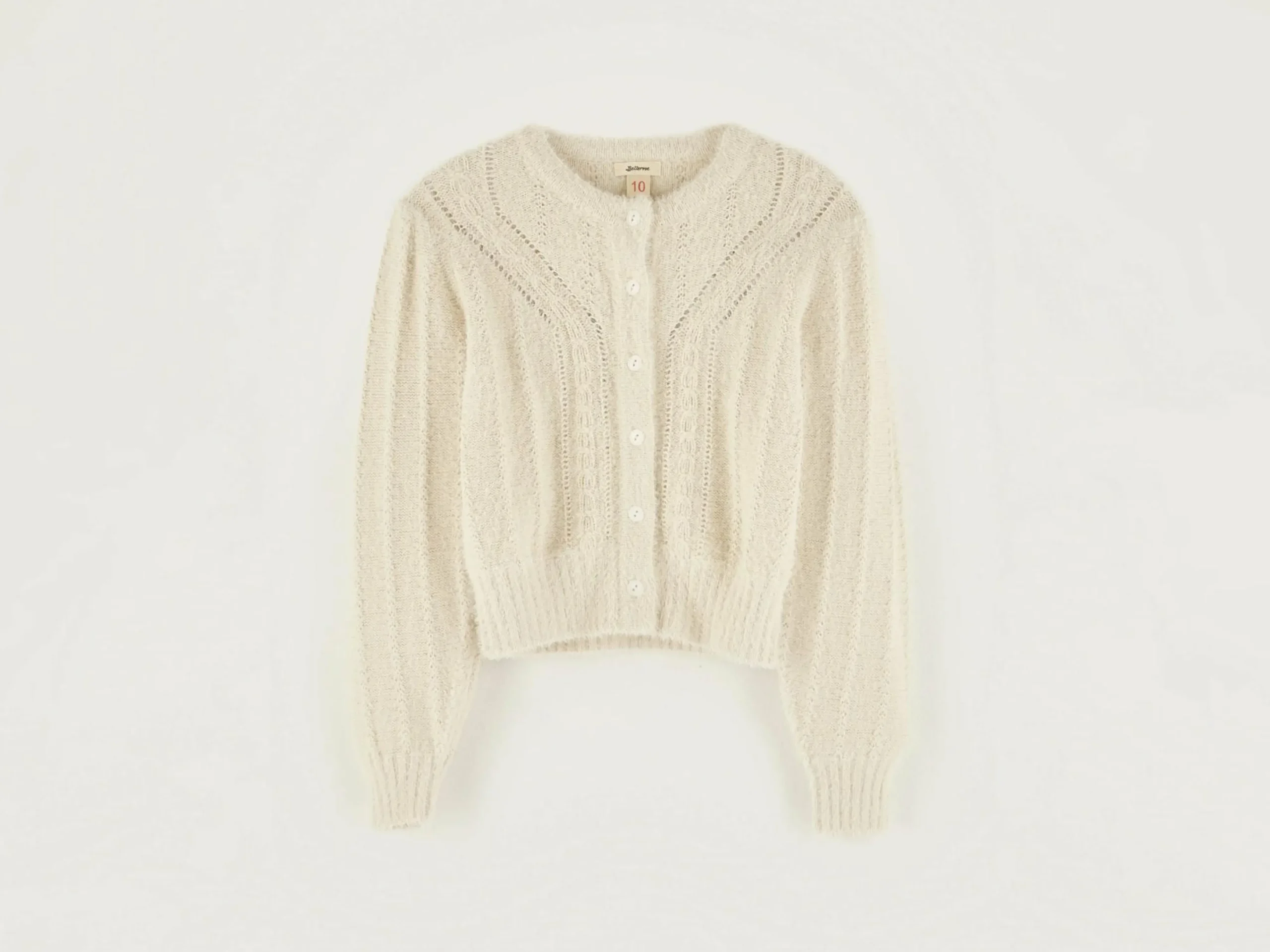Lichtbeige, klassieke cardigan van fluwelig garen.