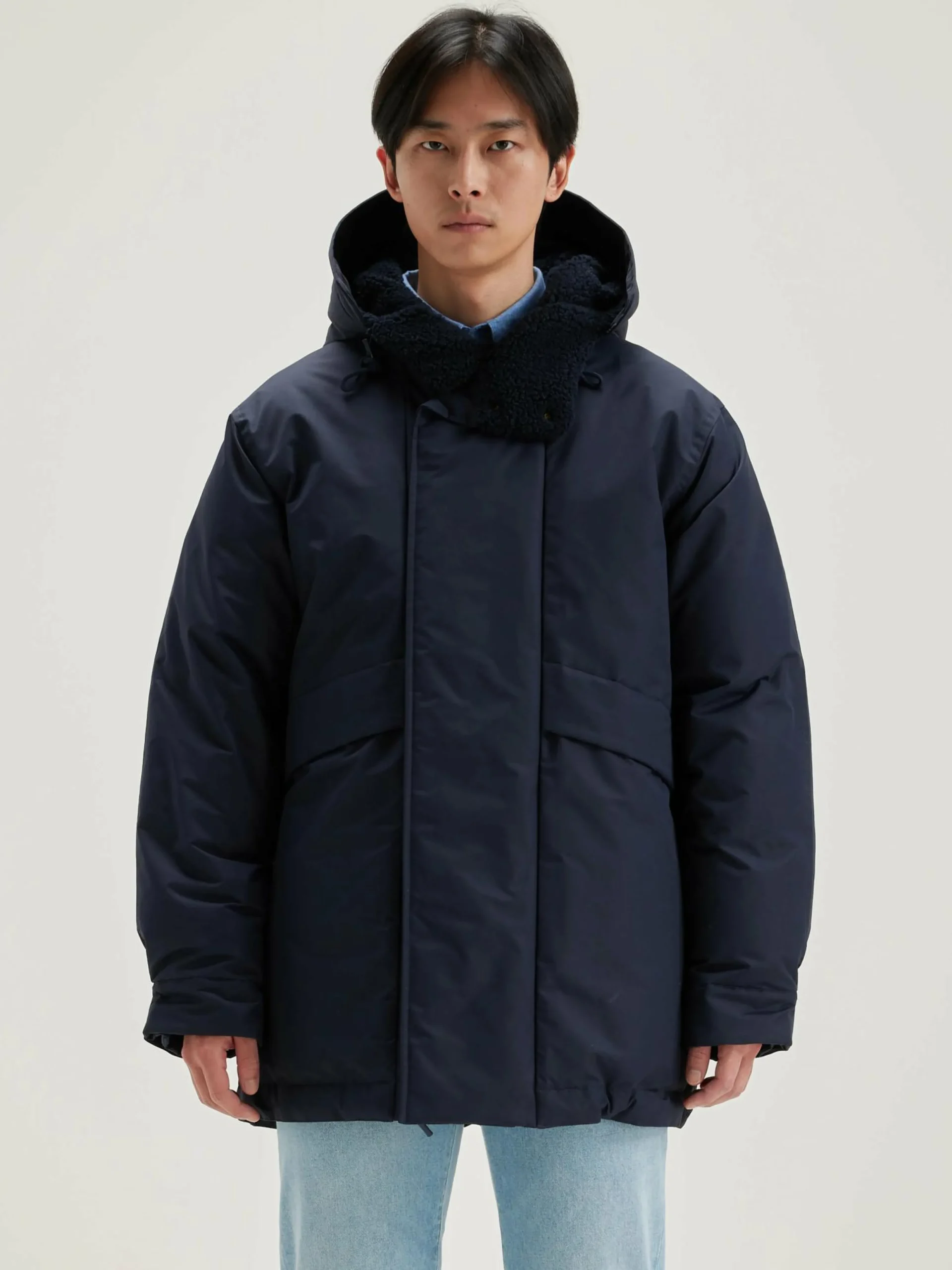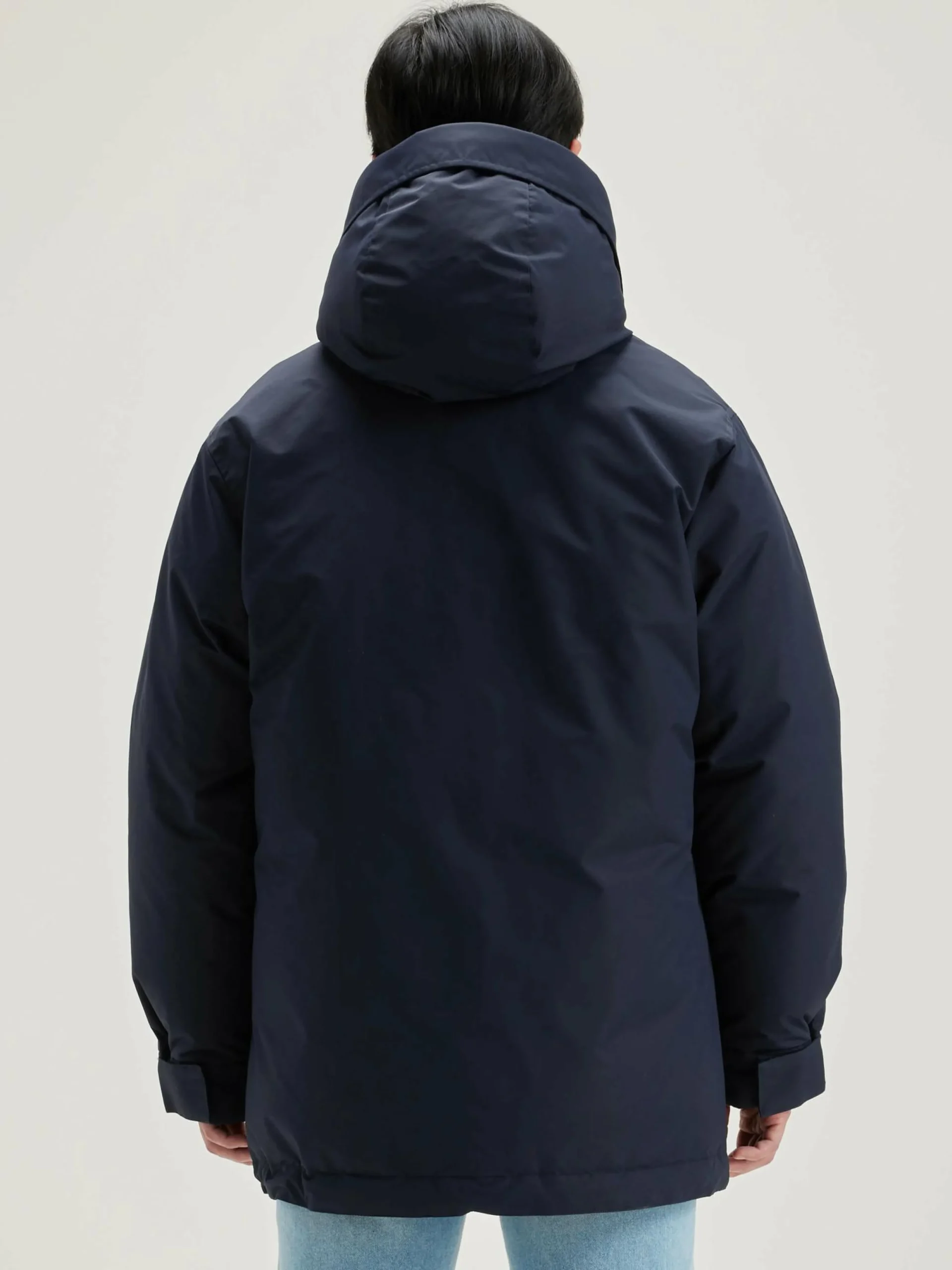 Parka met capuchon met klassieke pasvorm, van donkerblauw, waterafstotend nylon.