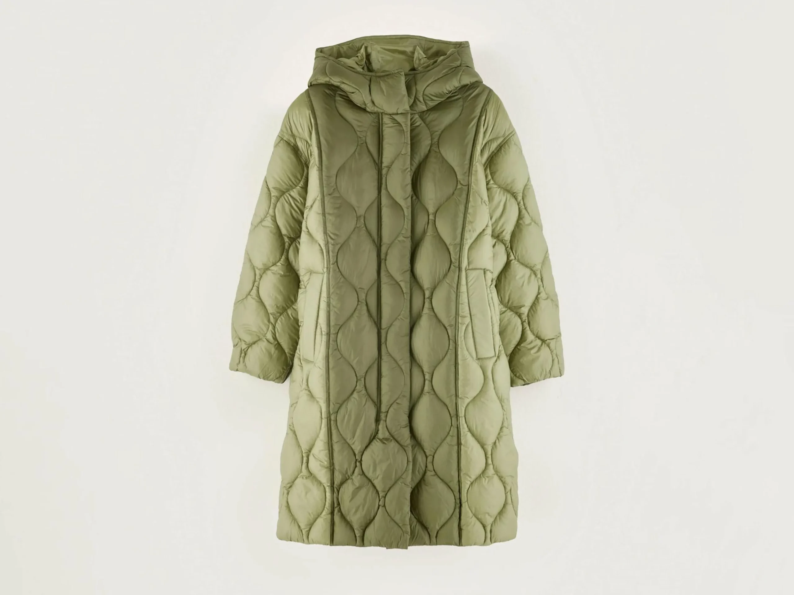 Tweekleurige, gewatteerde, kakigroene oversizede parka met capuchon.