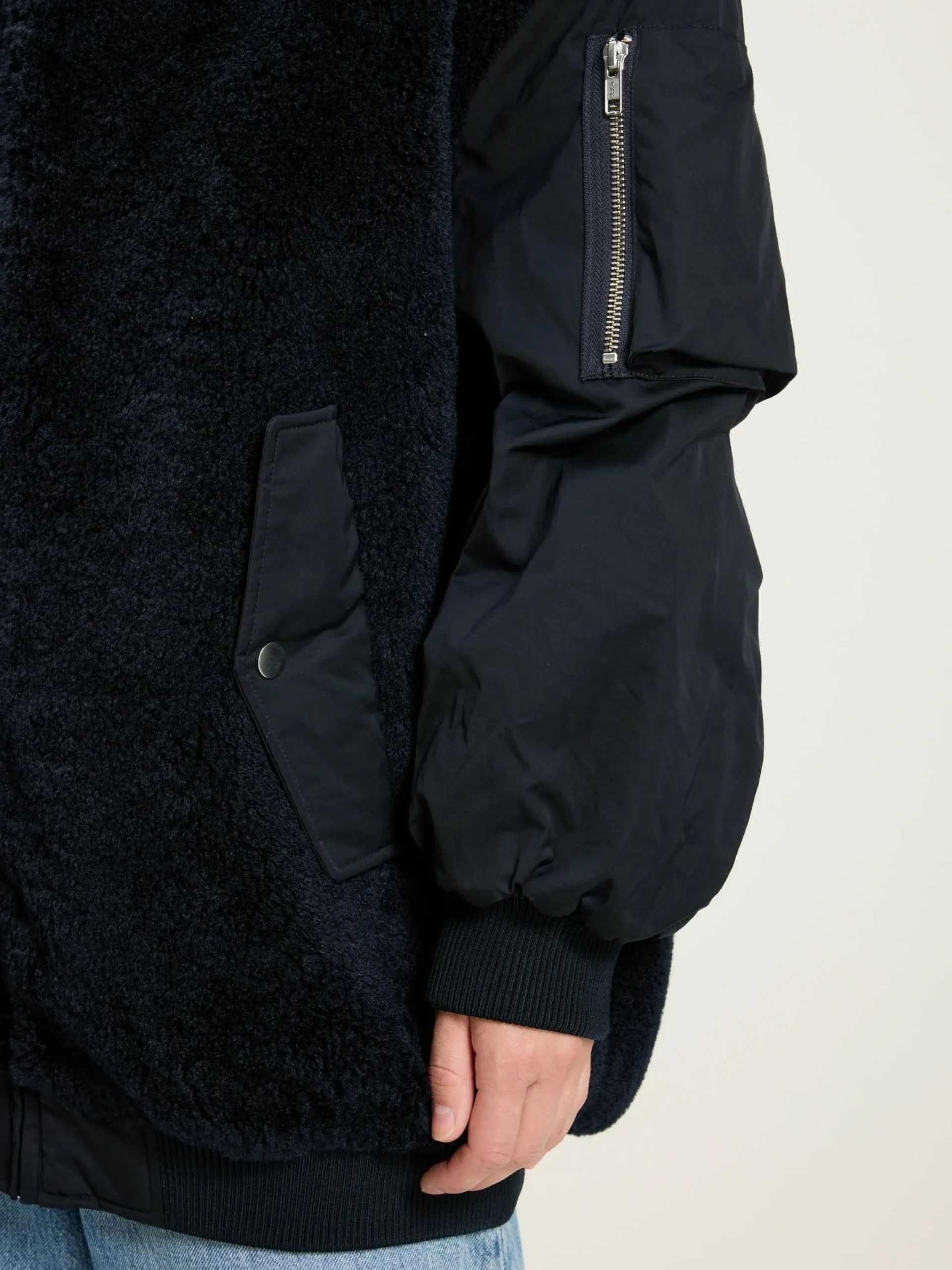 Oversizede, marineblauwe bomberjas met een body van nepbont en mouwen van satijncanvas.
