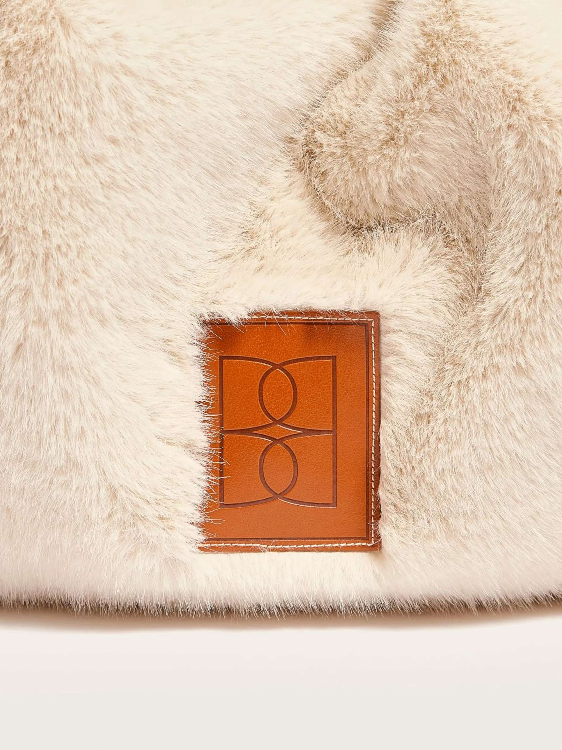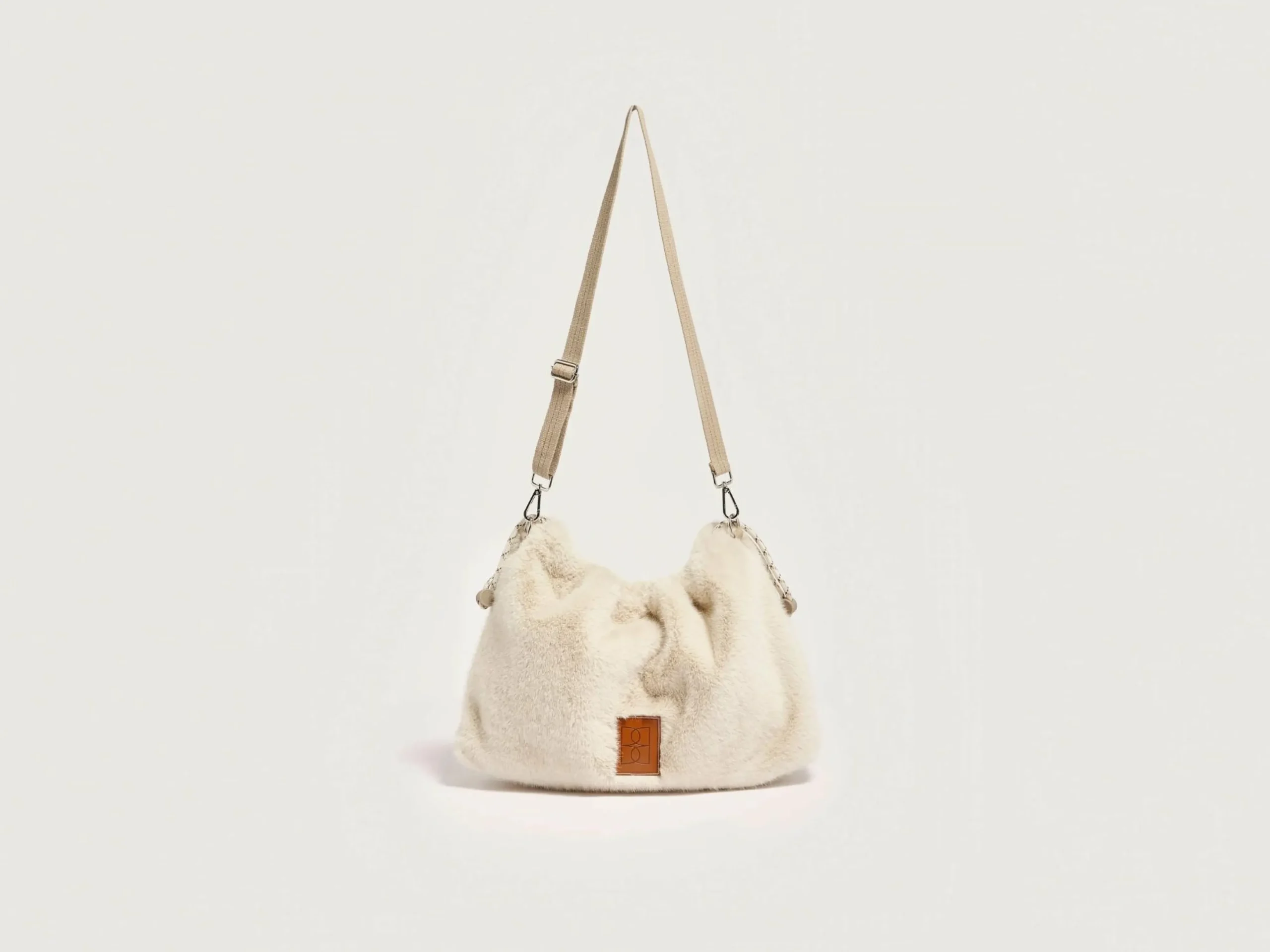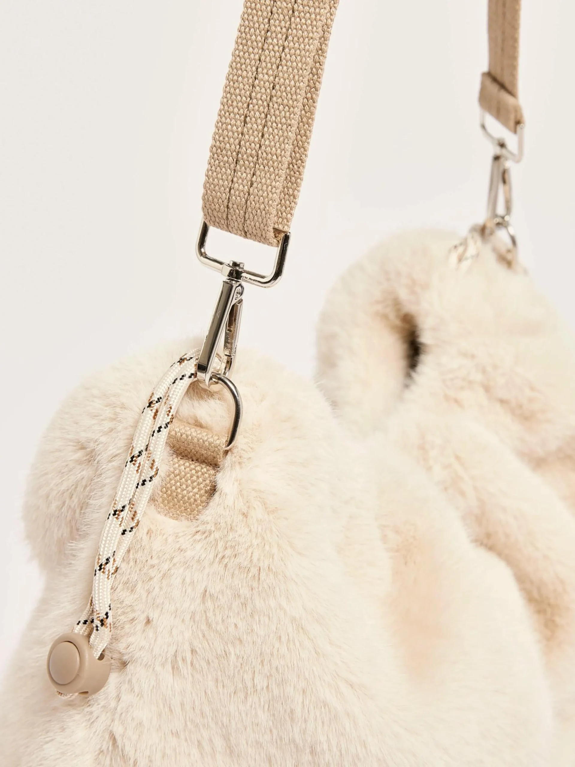 Tas in ecru nepbont met trekkoordsluiting bovenaan en een afneembare schouderriem.