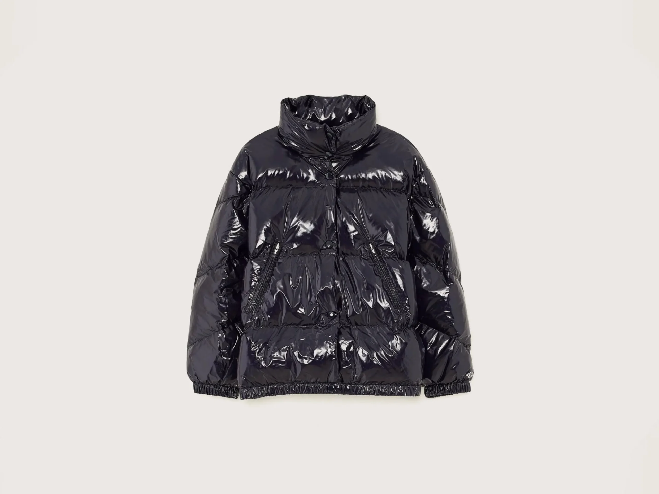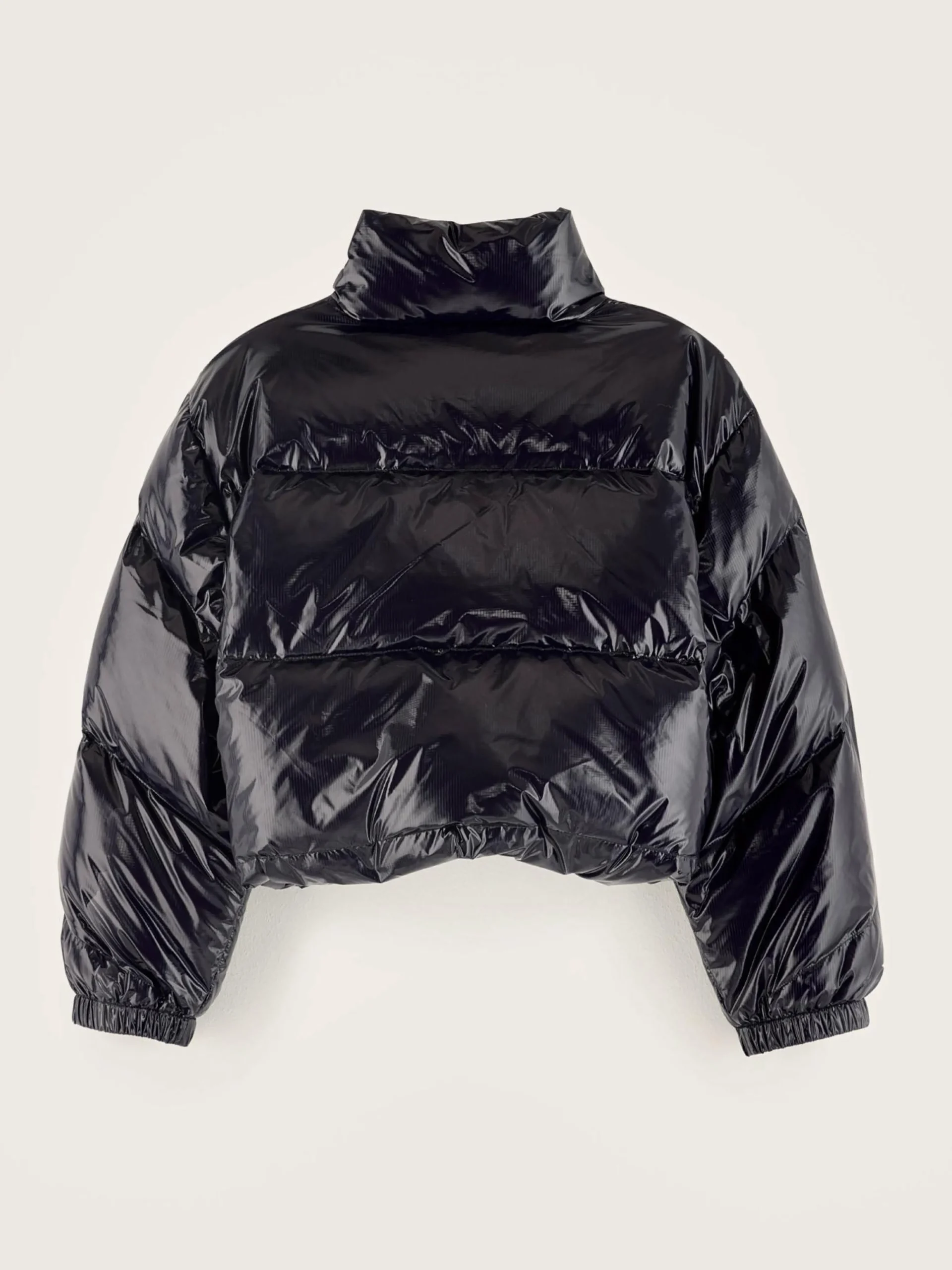 Donkerblauwe pufferjas met ritssluiting vooraan, aanpasbare lengte dankzij drukknopen.