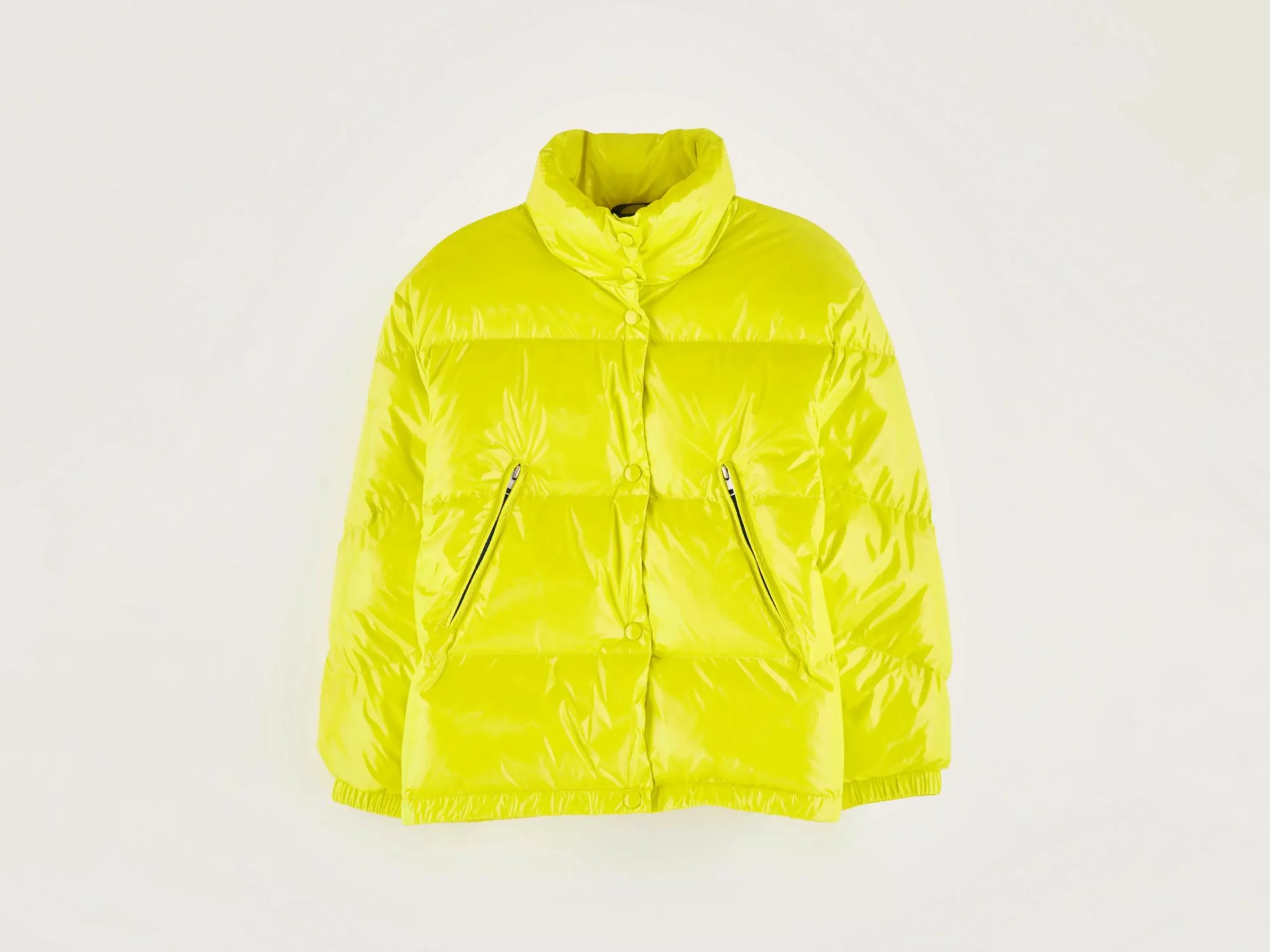 Gloeiend gele pufferjas met ritssluiting vooraan, aanpasbare lengte dankzij drukknopen.