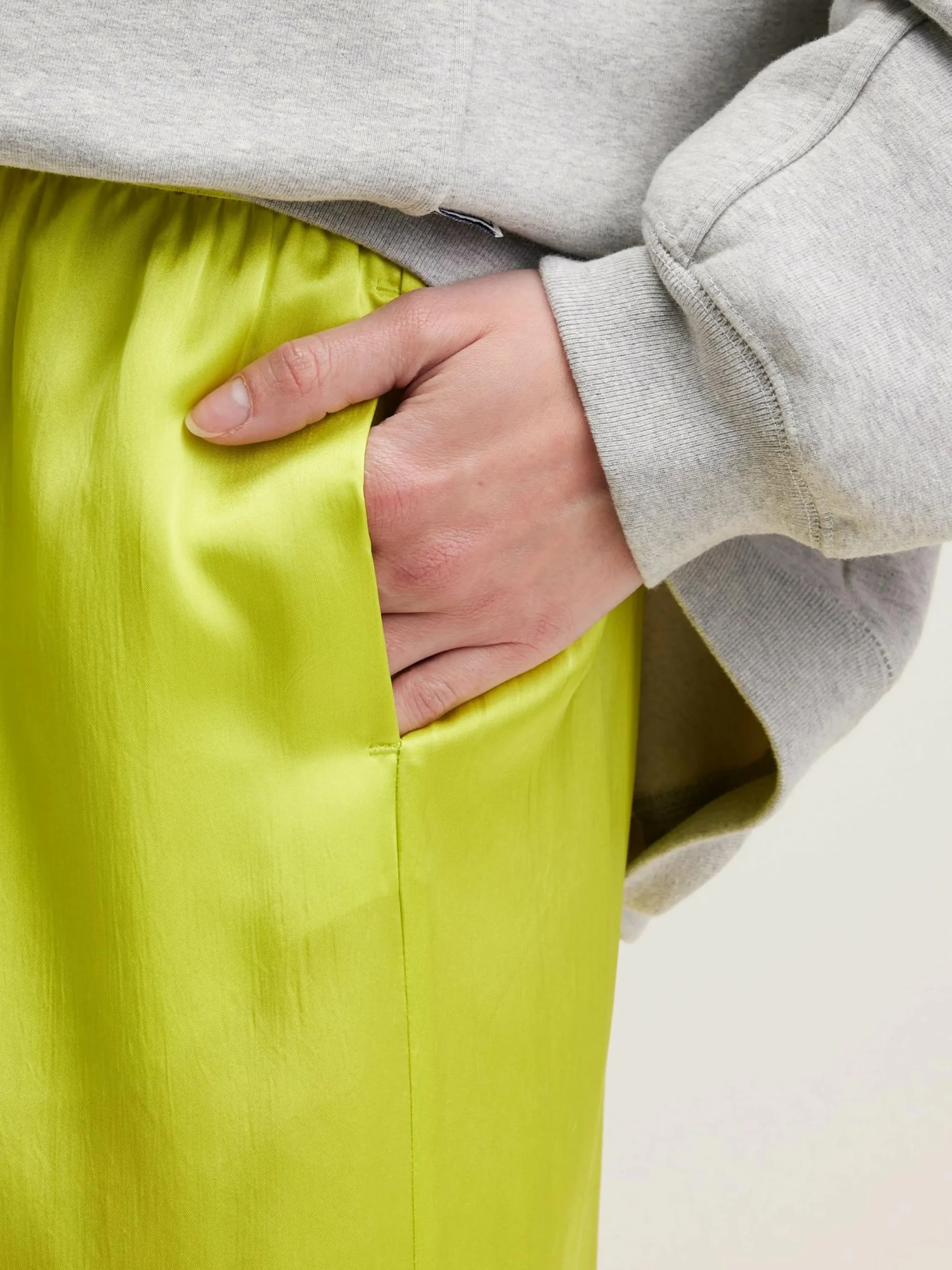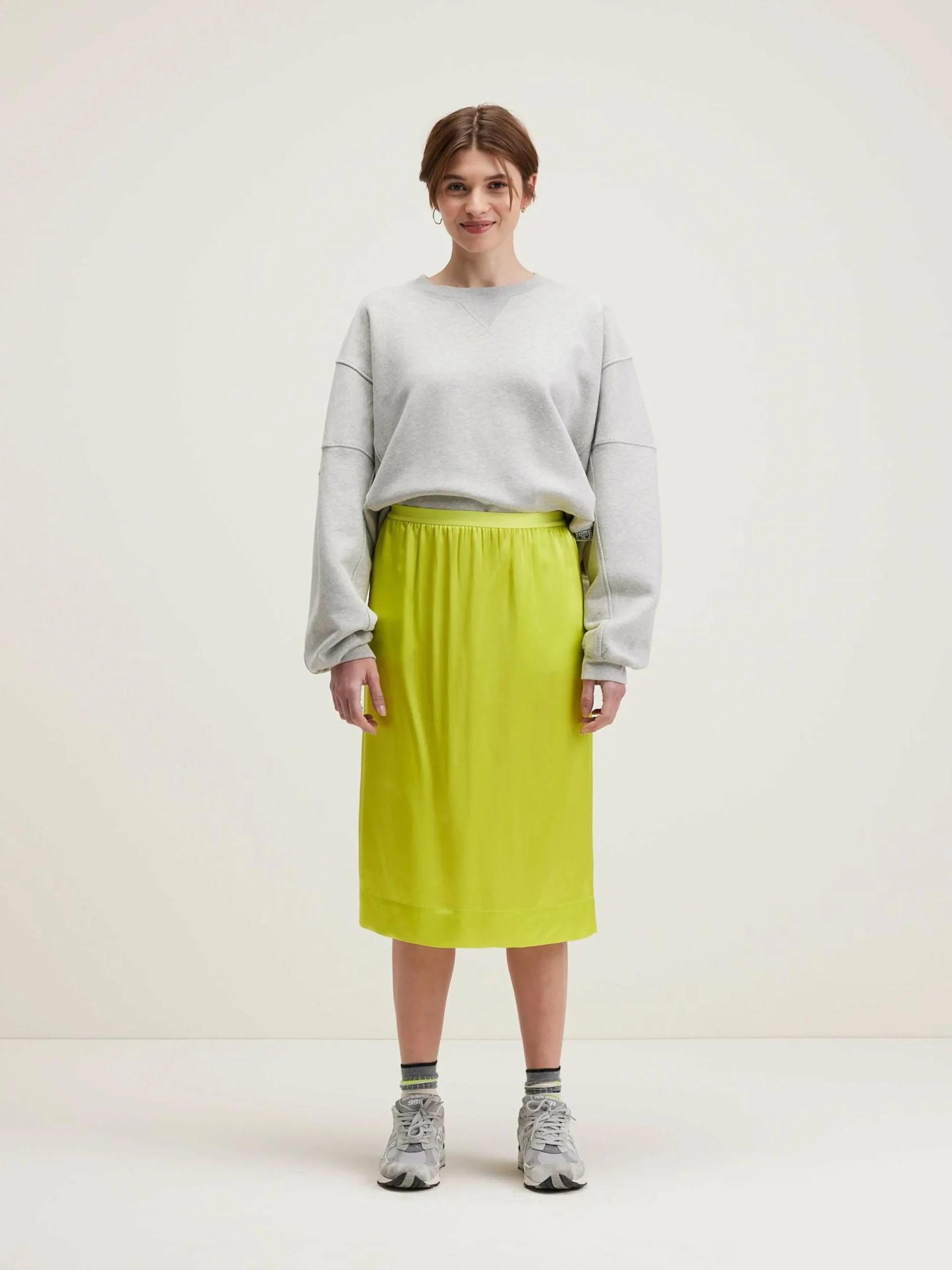 Felgele midi kokerrok met satijnen finish.