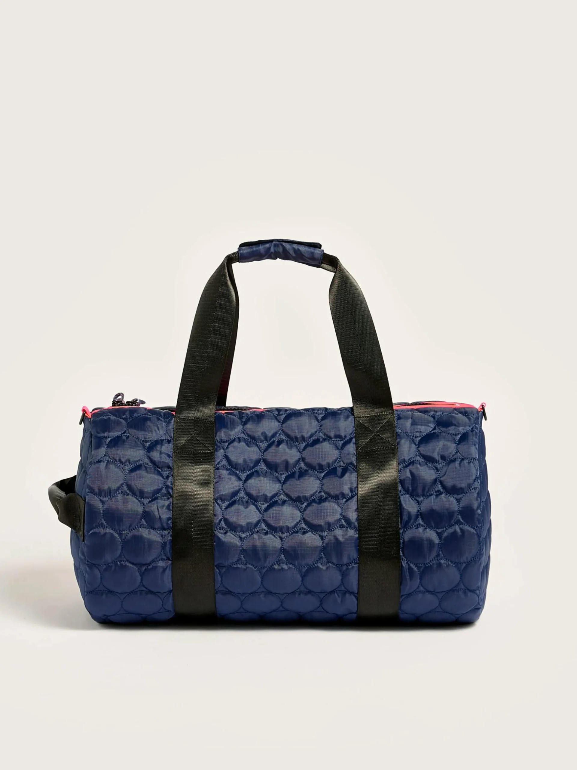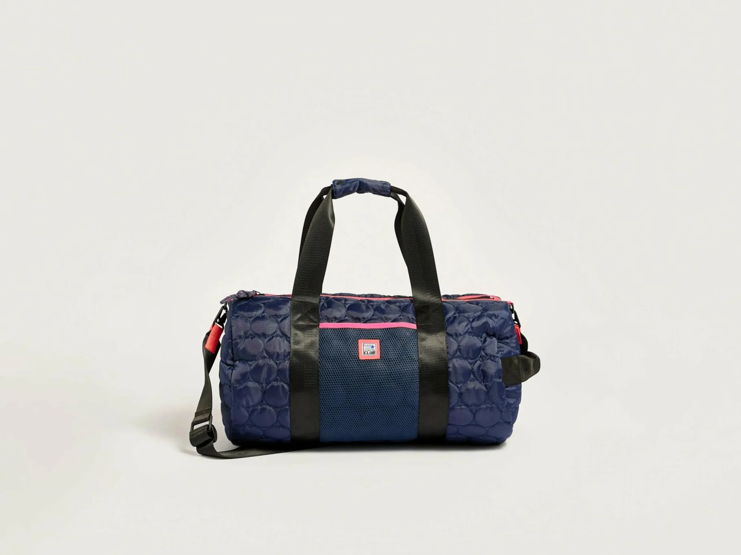 Gewatteerde marineblauwe duffelbag met details als bij klimuitrusting.