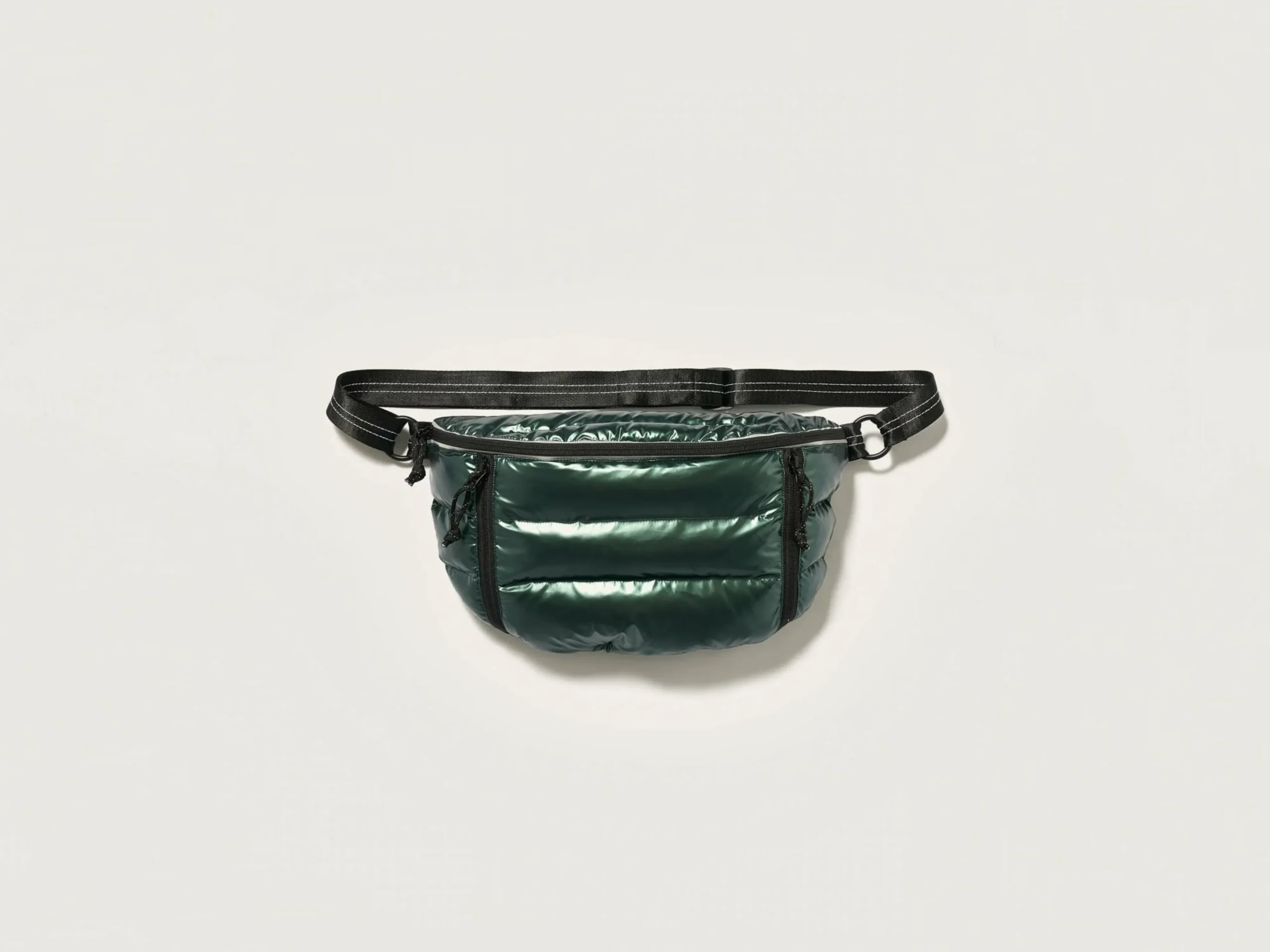 Gewatteerde puffer sling bag van glanzend donkergroen nylon.