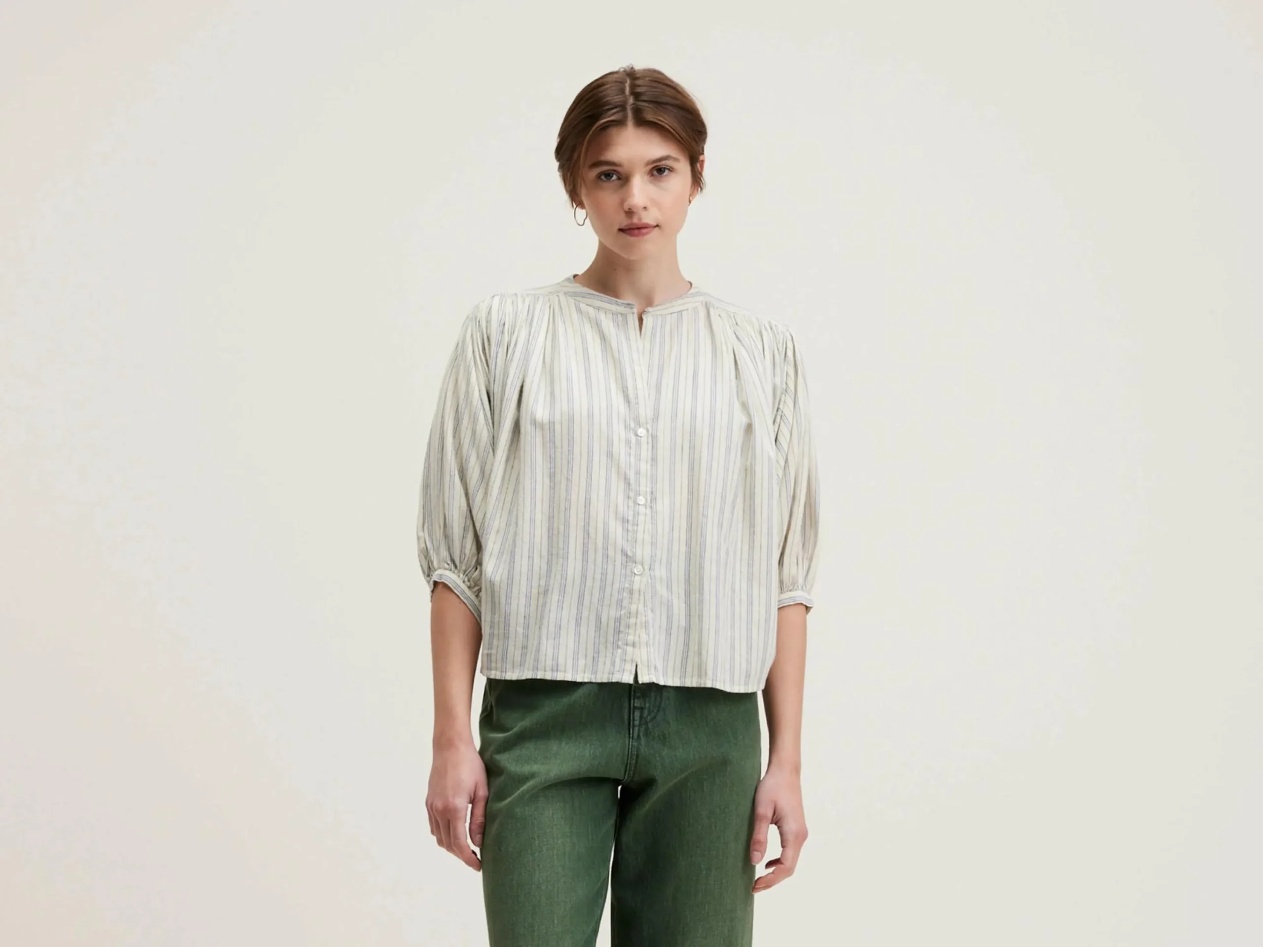 Oversizede, cropped blouse van gestreept katoen, met gefronste details.