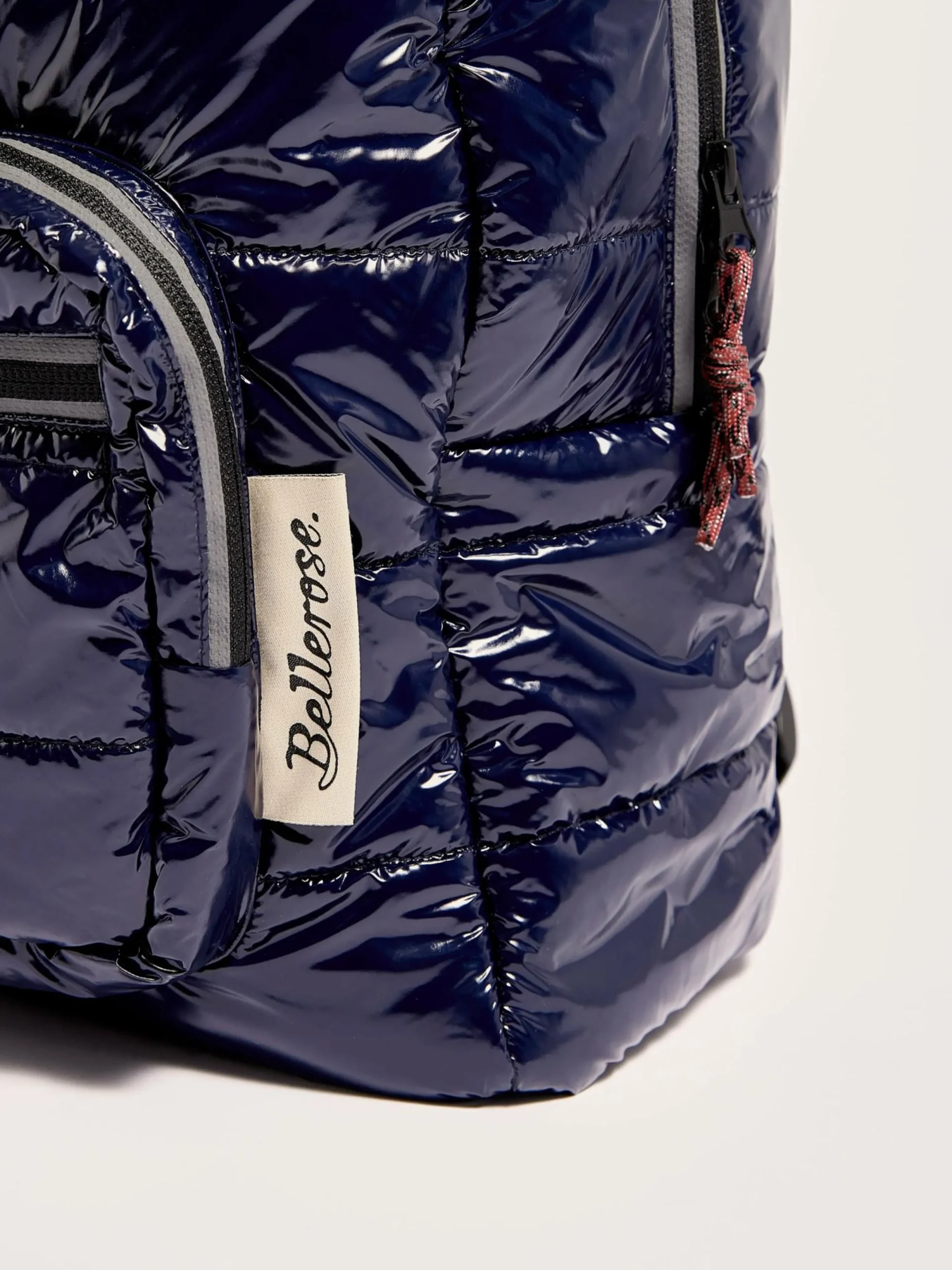 Gewatteerde rugzak van glanzend, marineblauw ripstopmateriaal, met een ritssluiting aan de bovenkant en een voorvak.