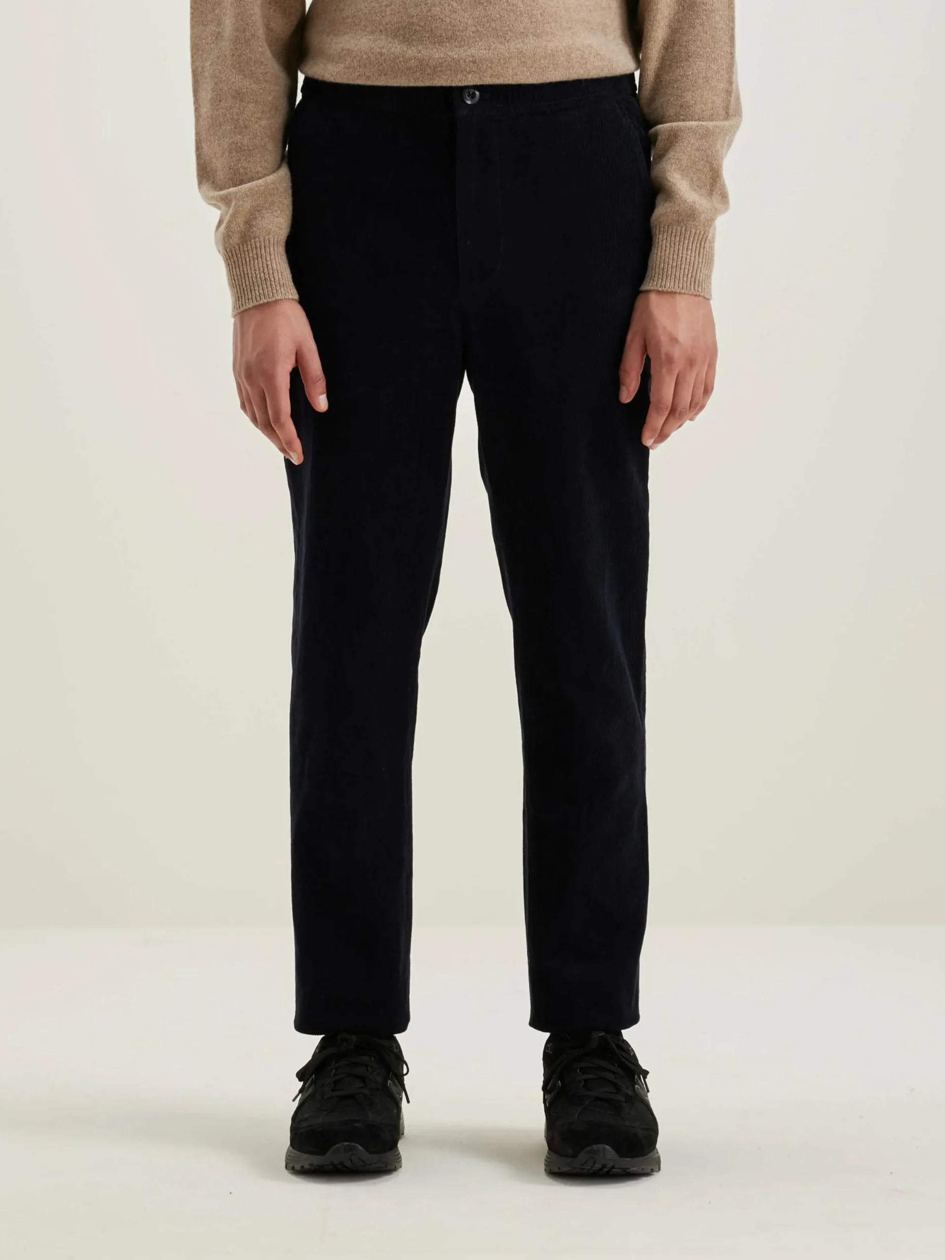 Klassieke chinobroek met rijgkoord aan de taille, van donker olijfgroen corduroykatoen.