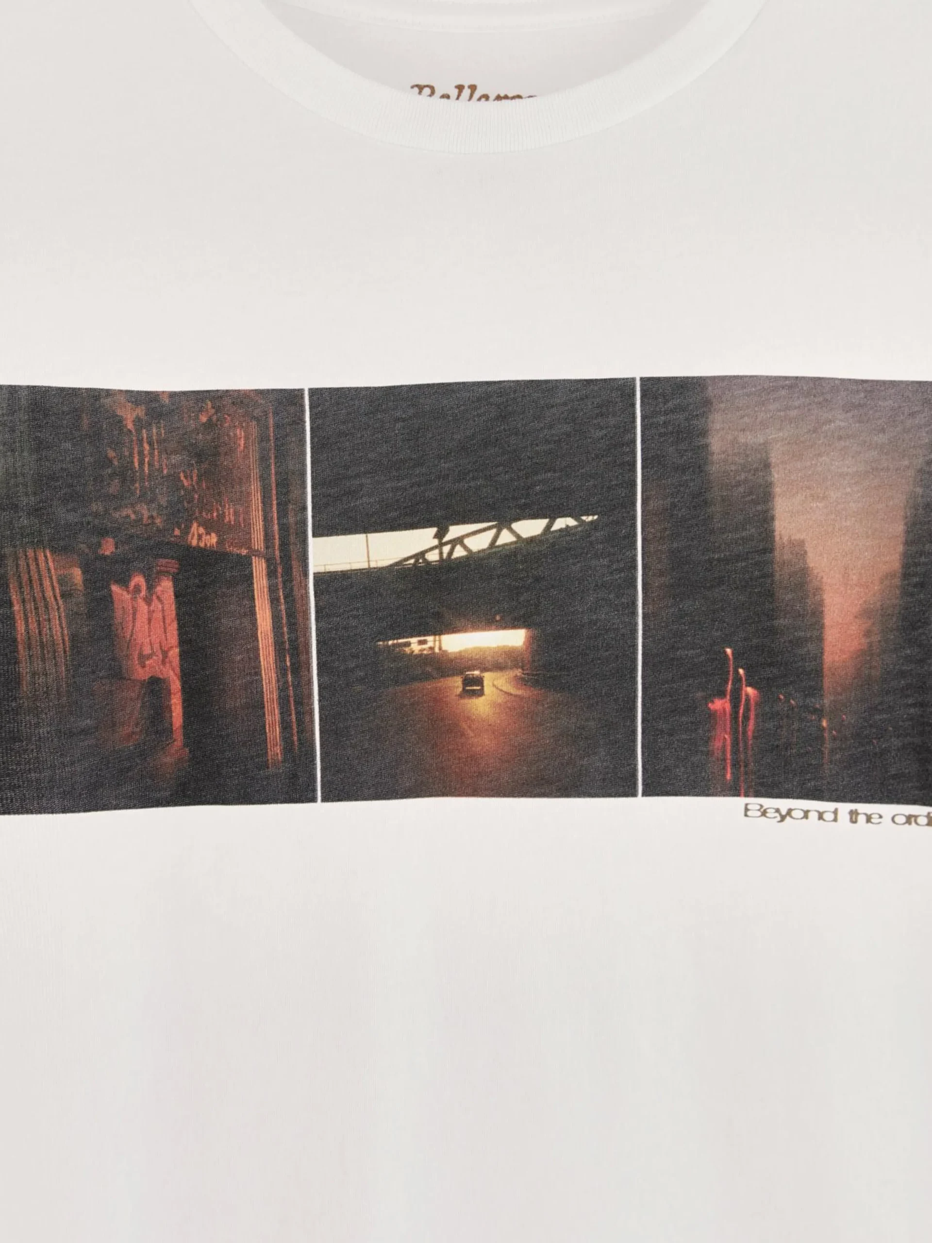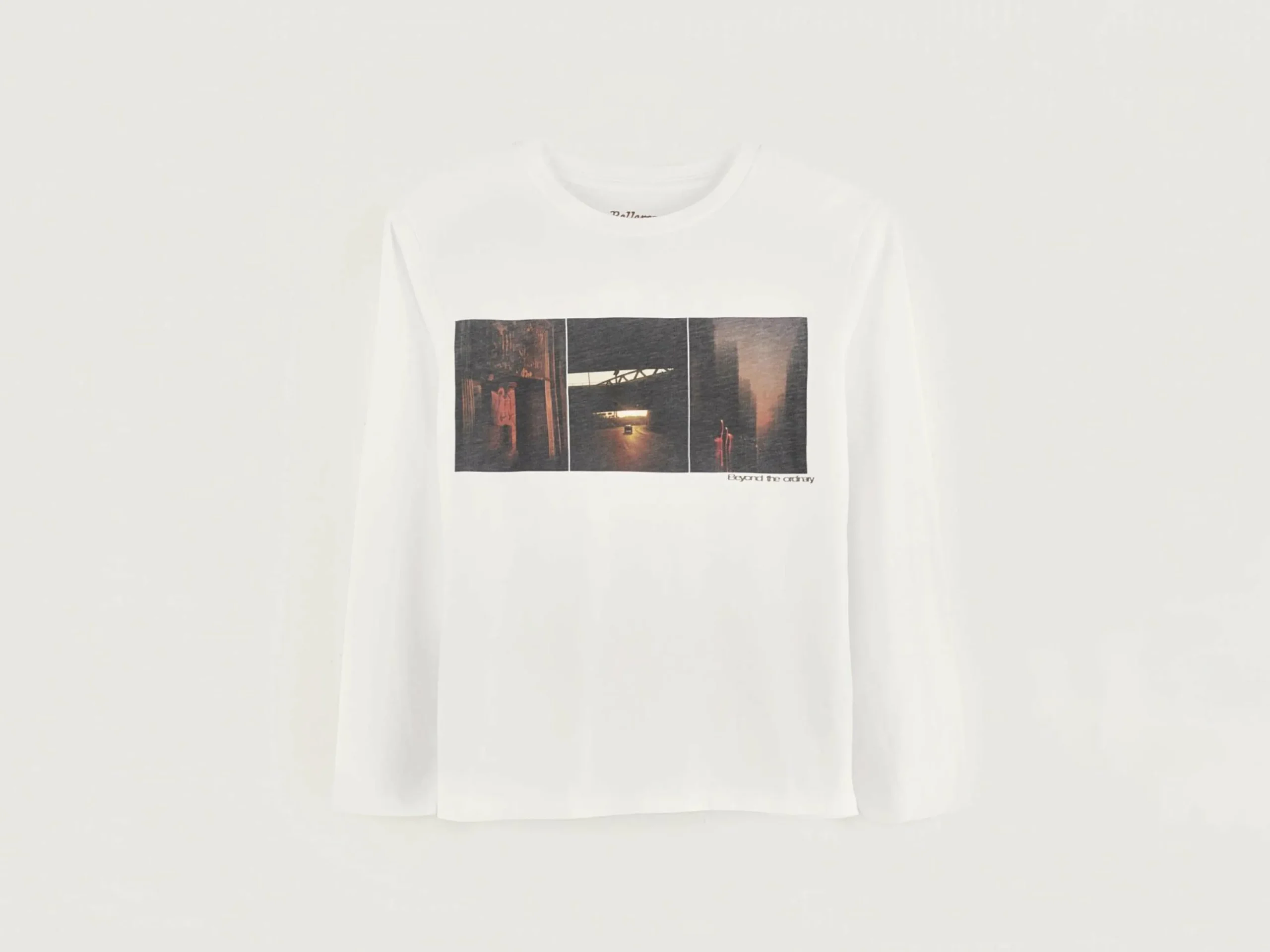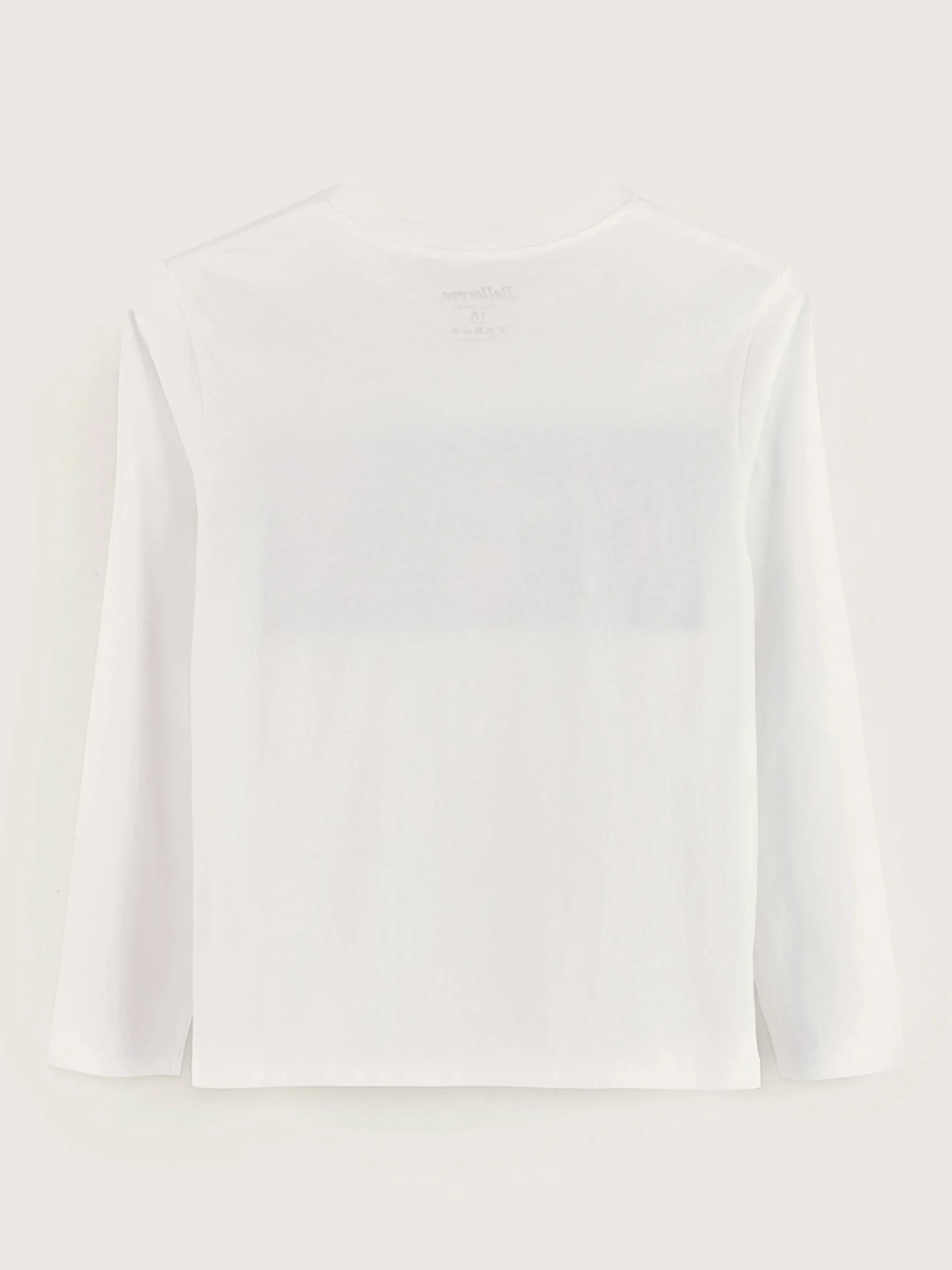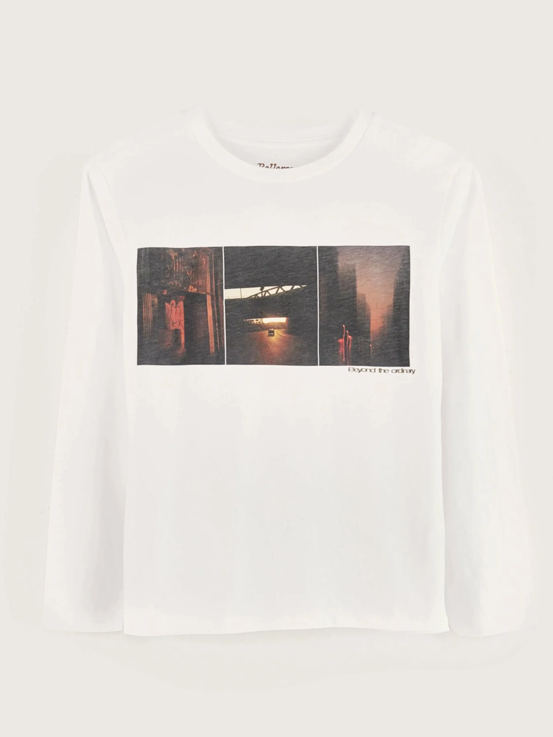 Klassiek wit T-shirt met lange mouwen, van geborsteld katoenjersey, met fototriptiek op de borst.
