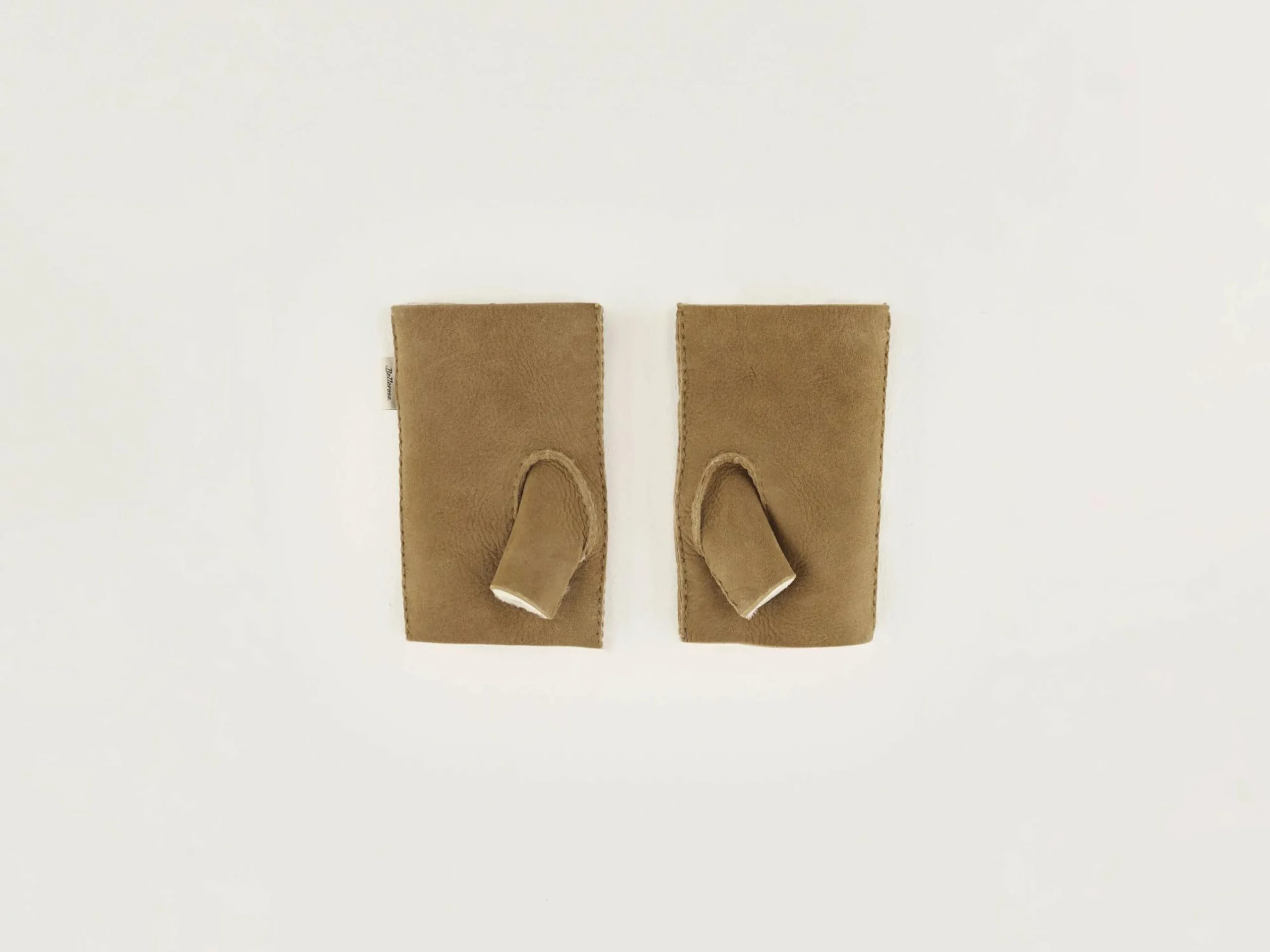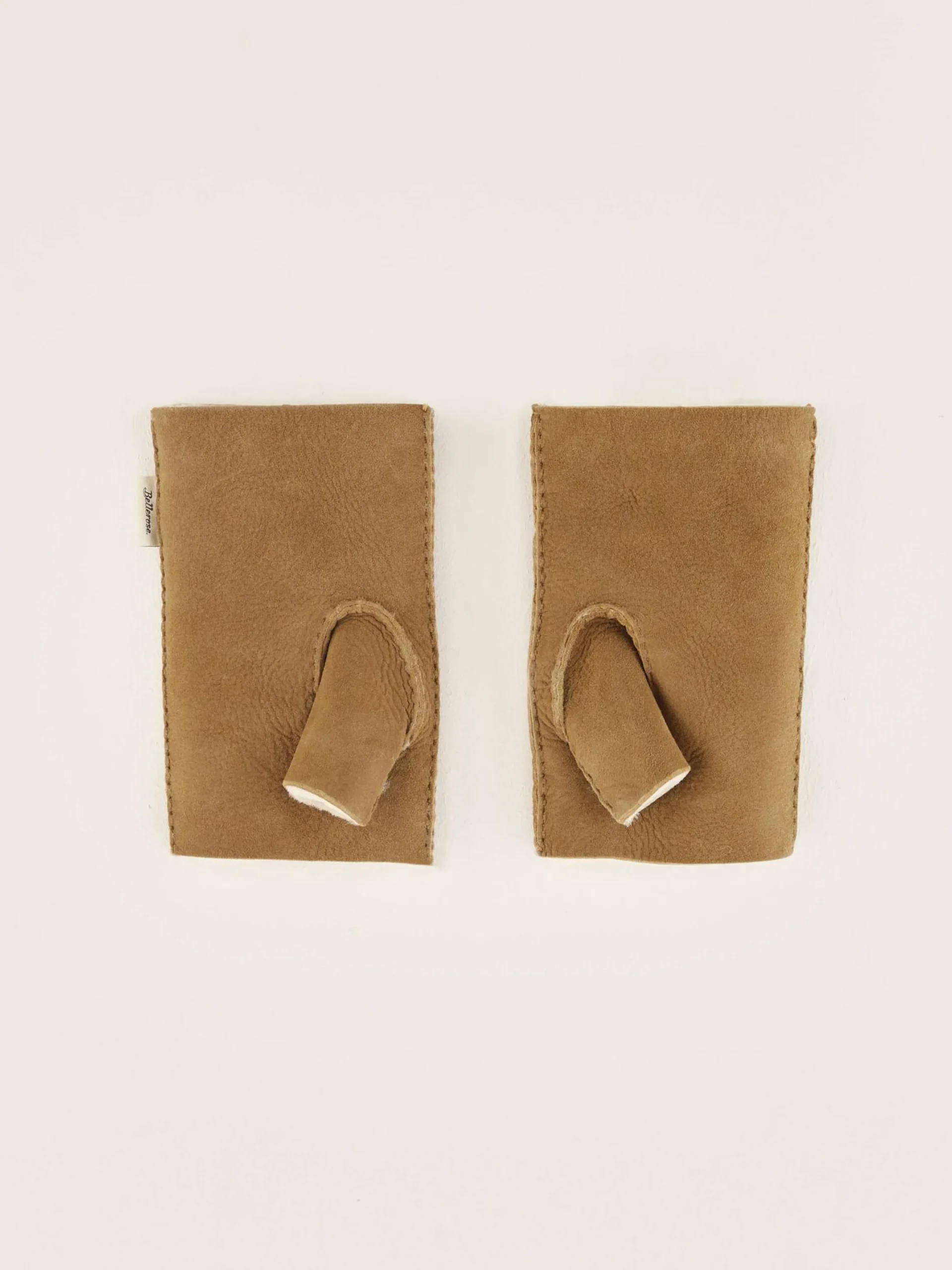 Handschoenen zonder vingers in cognackleurig leer met shearlingwol.