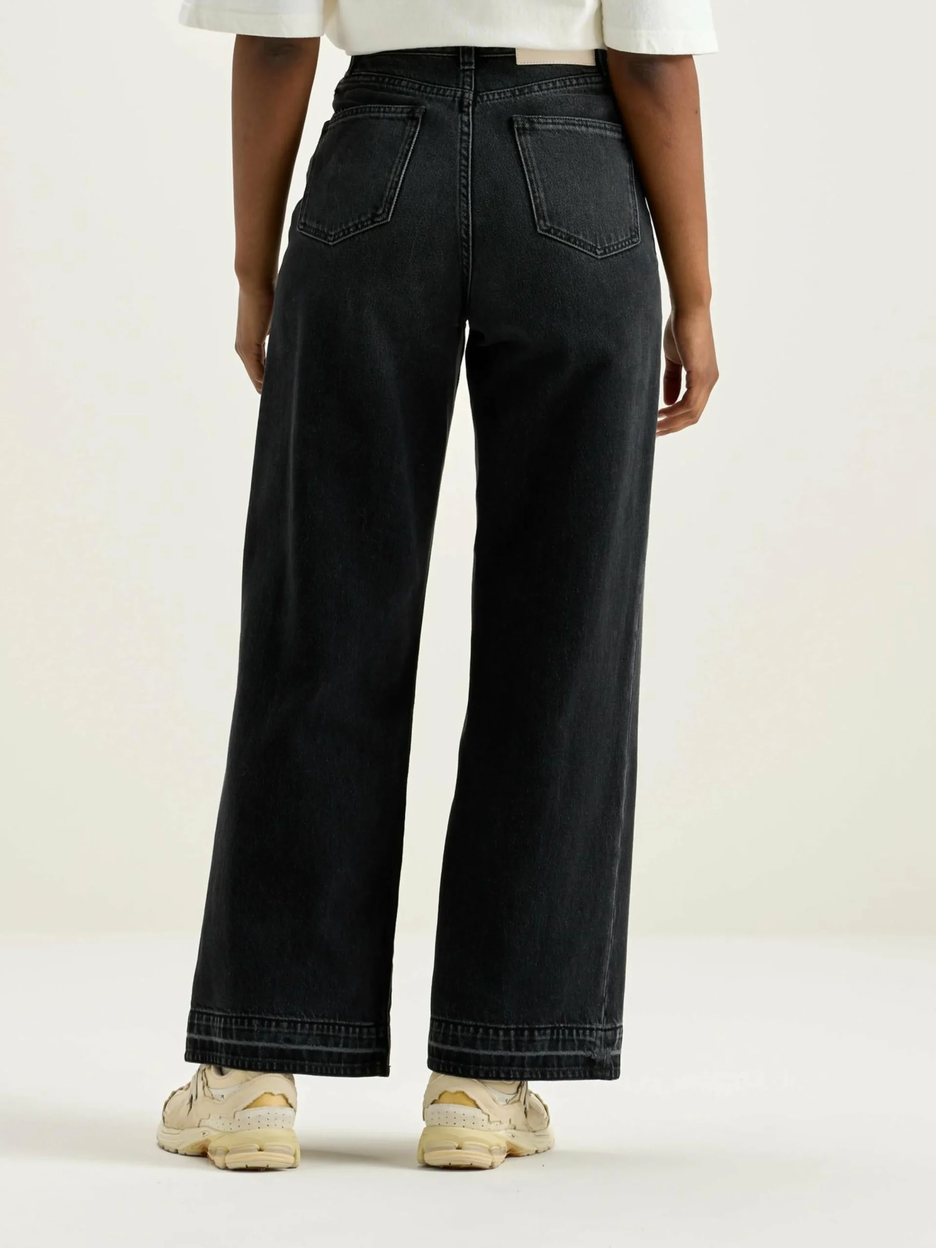High-waist boyfriend jeans met wijde pijpen en gerafelde details op de zoom, van zwart denim met een versleten look.