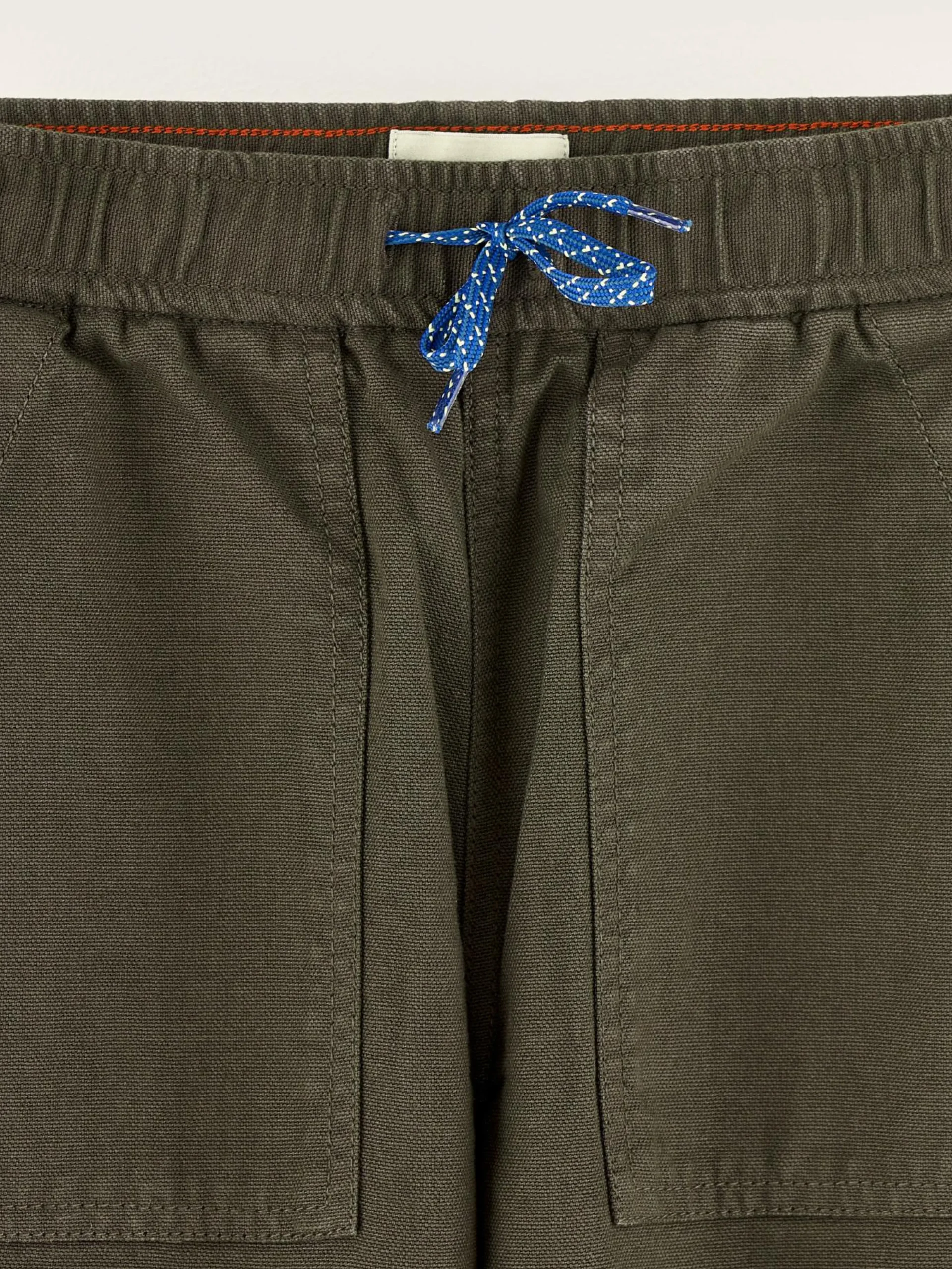 Relaxede, legergroene baggy broek met wijde pijpen en fatigue zakken, van katoencanvas.