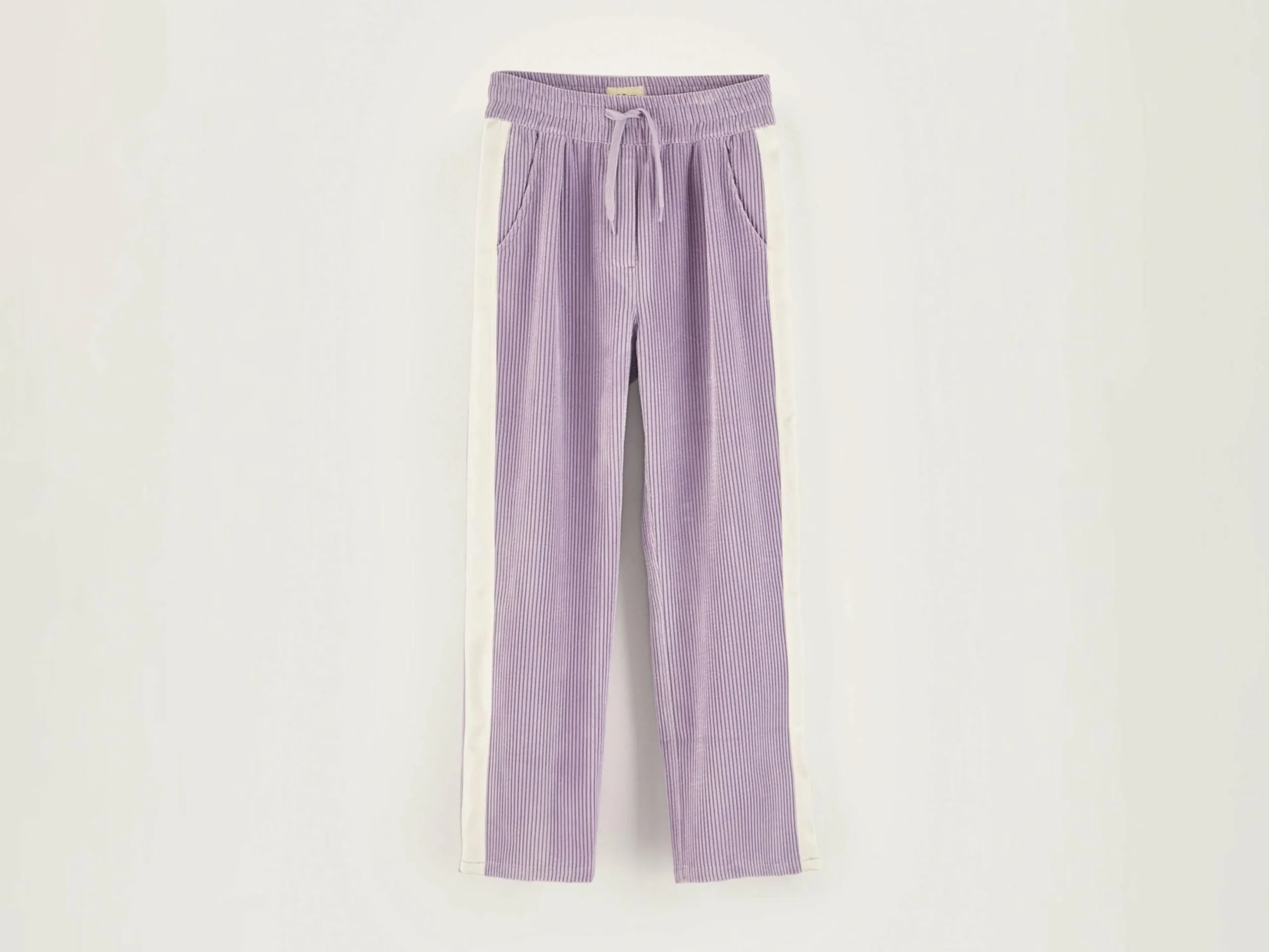 Lavendelkleurige, sportieve broek met hoge taille, van corduroy met brede rib.