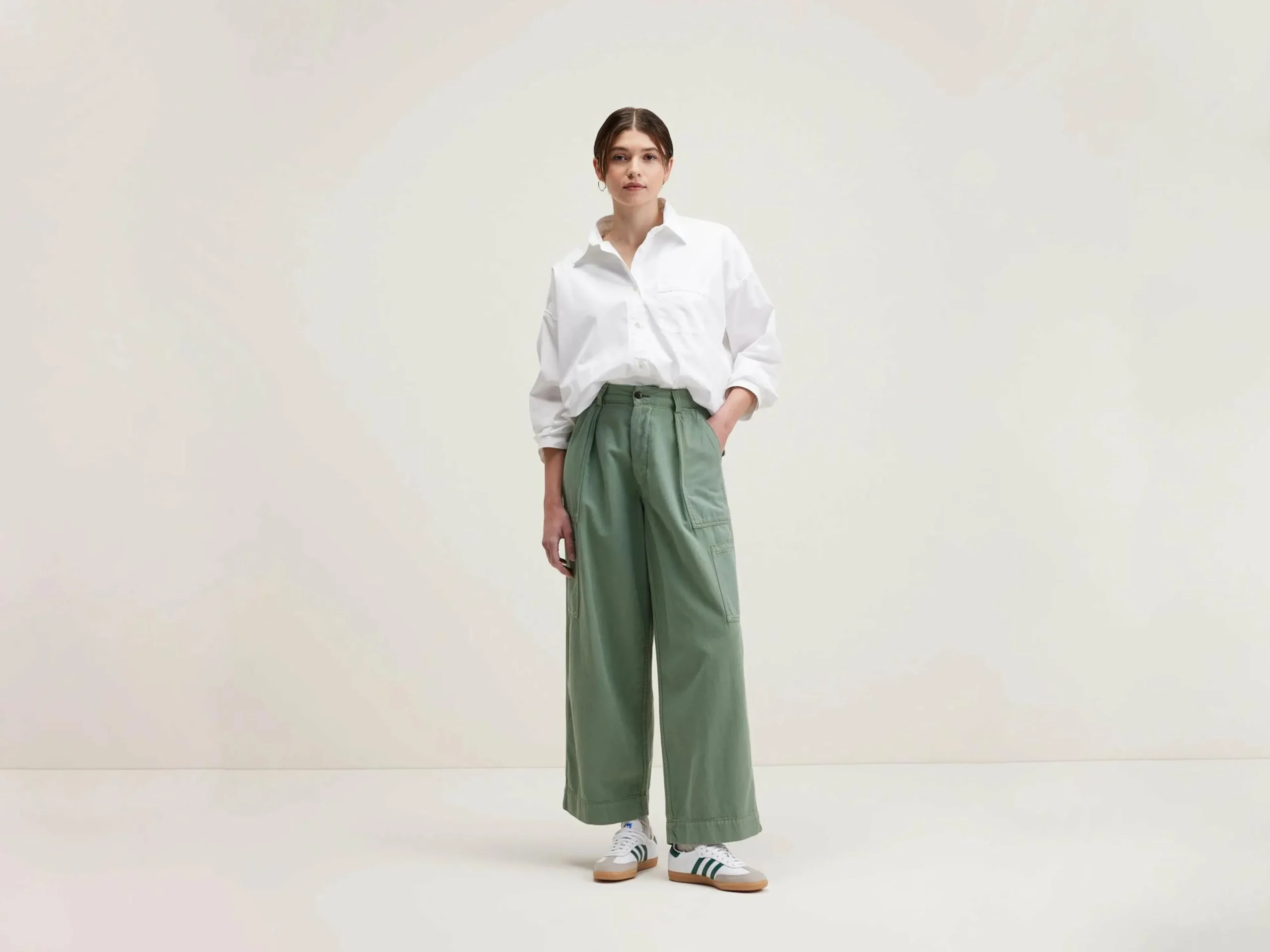 Klassieke cargo broek met wijde pijpen en fatigue-zakken in een eucalyptusgroene katoen en linnenmix.