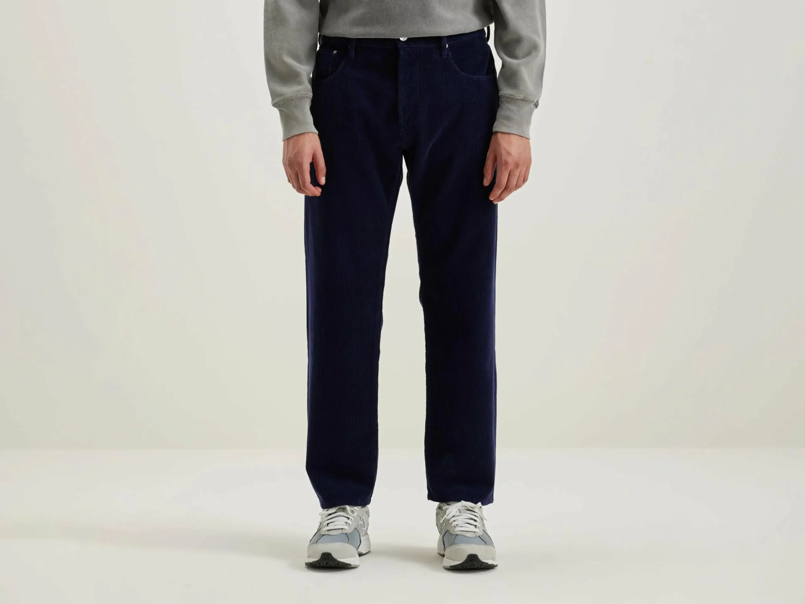 “Dad-style” broek met lage taille en rechte pijpen, in five-pocket uitvoering, van inktblauw corduroy katoen.
