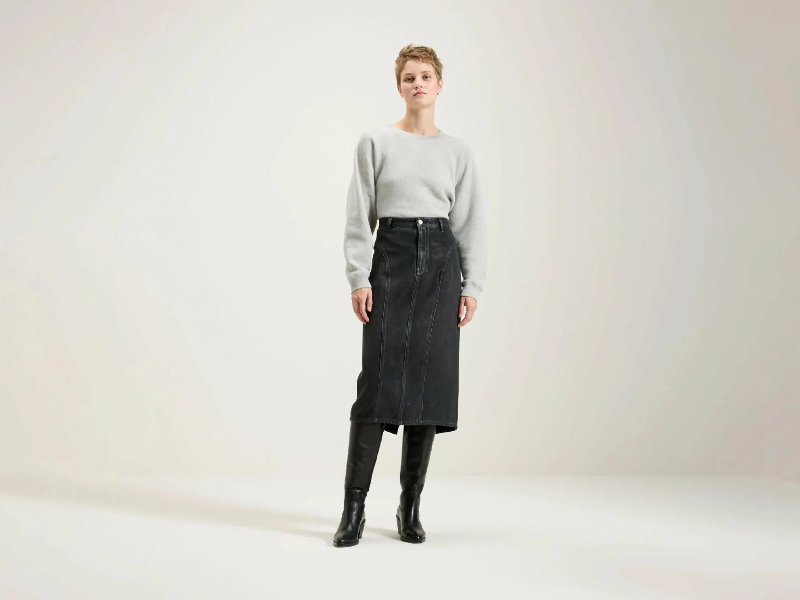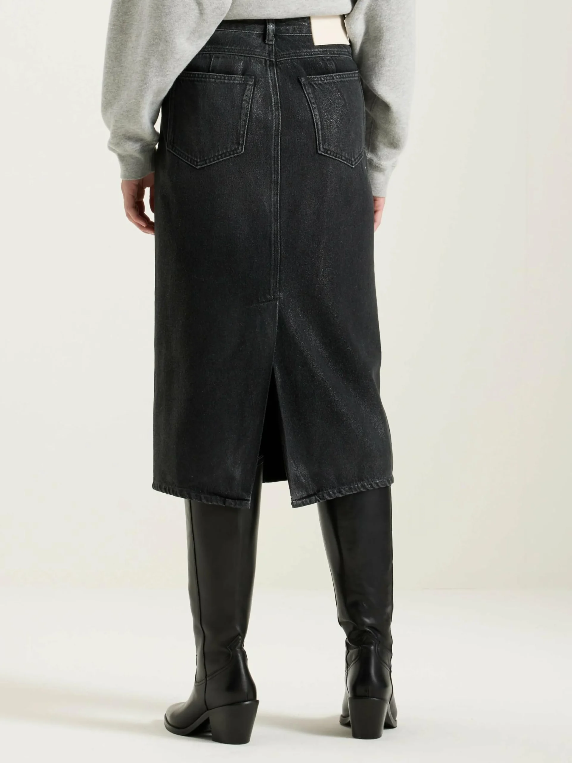 High-waist midikokerrok met gebogen panelen aan de zijkant, gemaakt van licht versleten zwart denim met een glanzend gecoate afwerking.