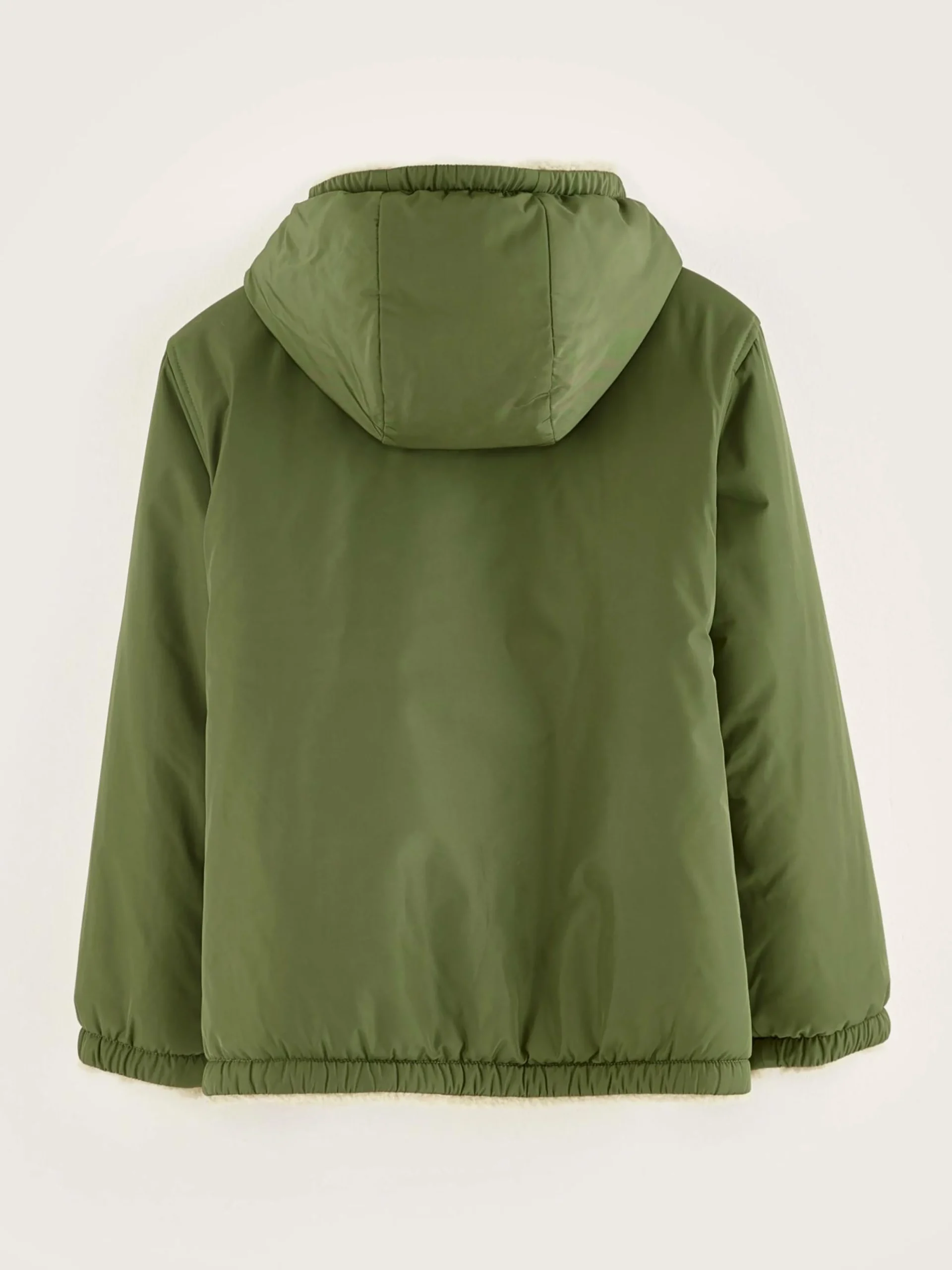Klassieke, omkeerbare jas met capuchon, van waterafstotend groen ripstop textiel en teddystof.