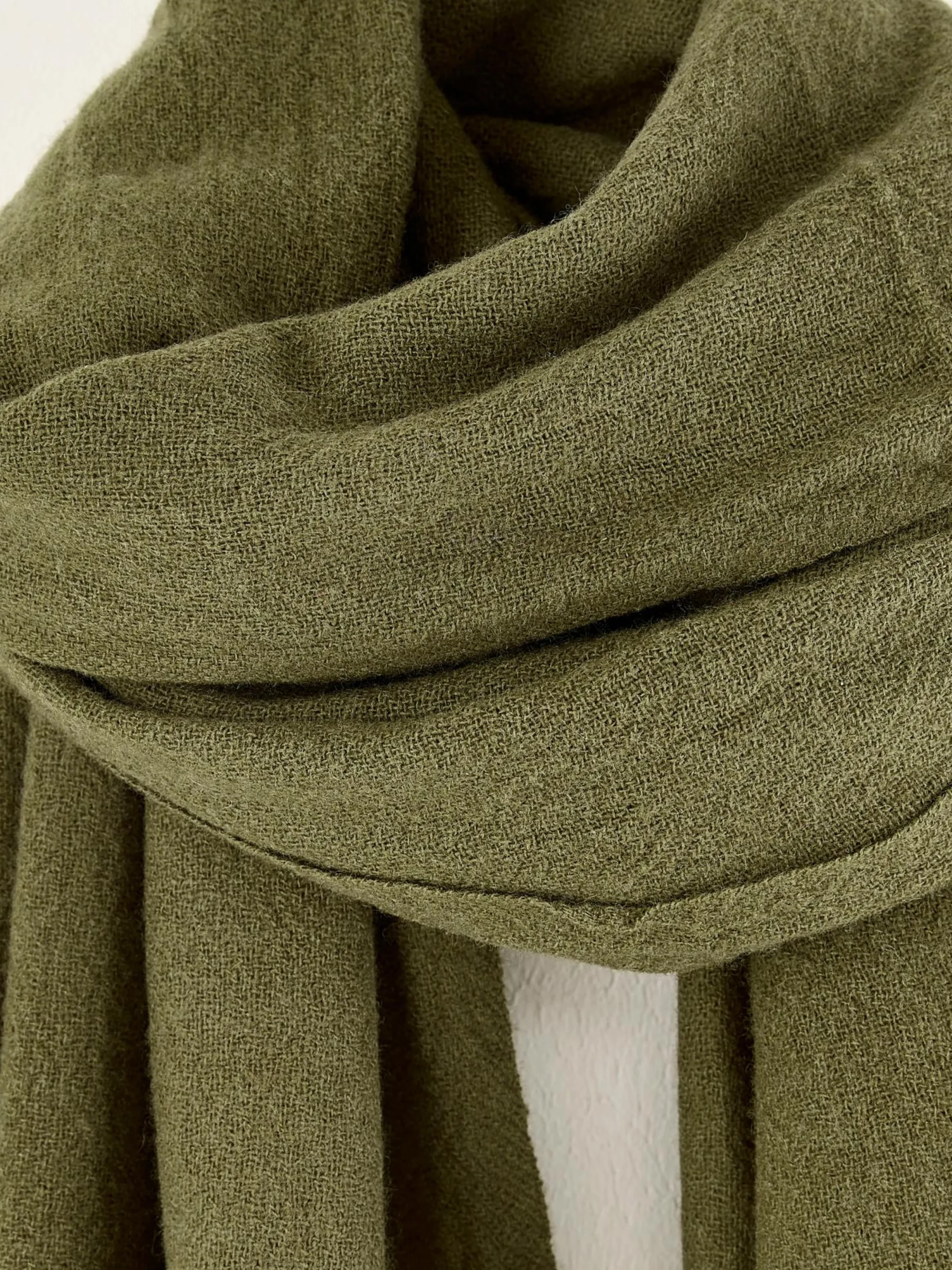 Zachte sjaal in kakigroen, die zowel warmte als stijl biedt voor de koelere dagen.
