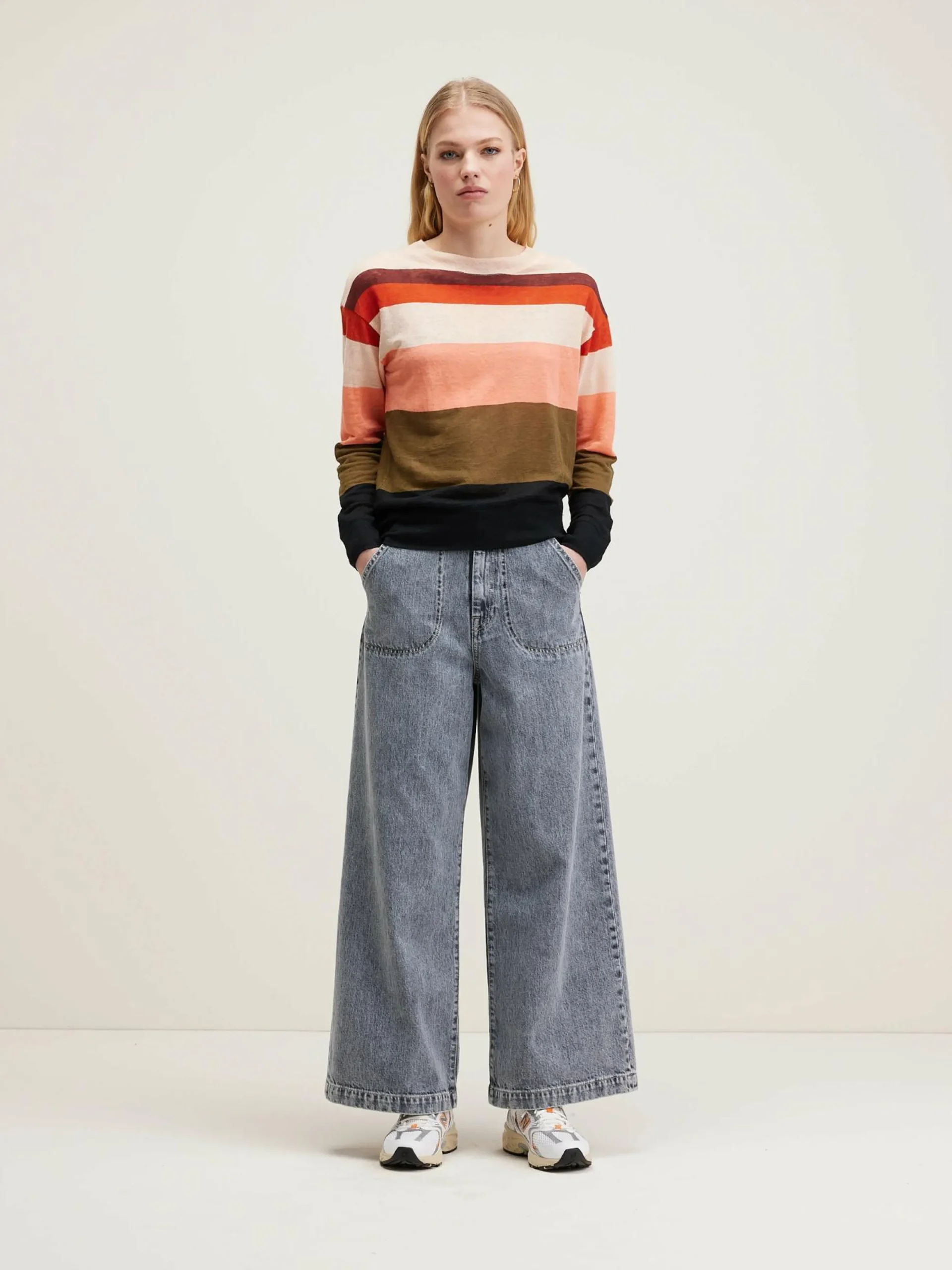 Relaxed T-shirt met lange mouwen, van gestreept linnen.