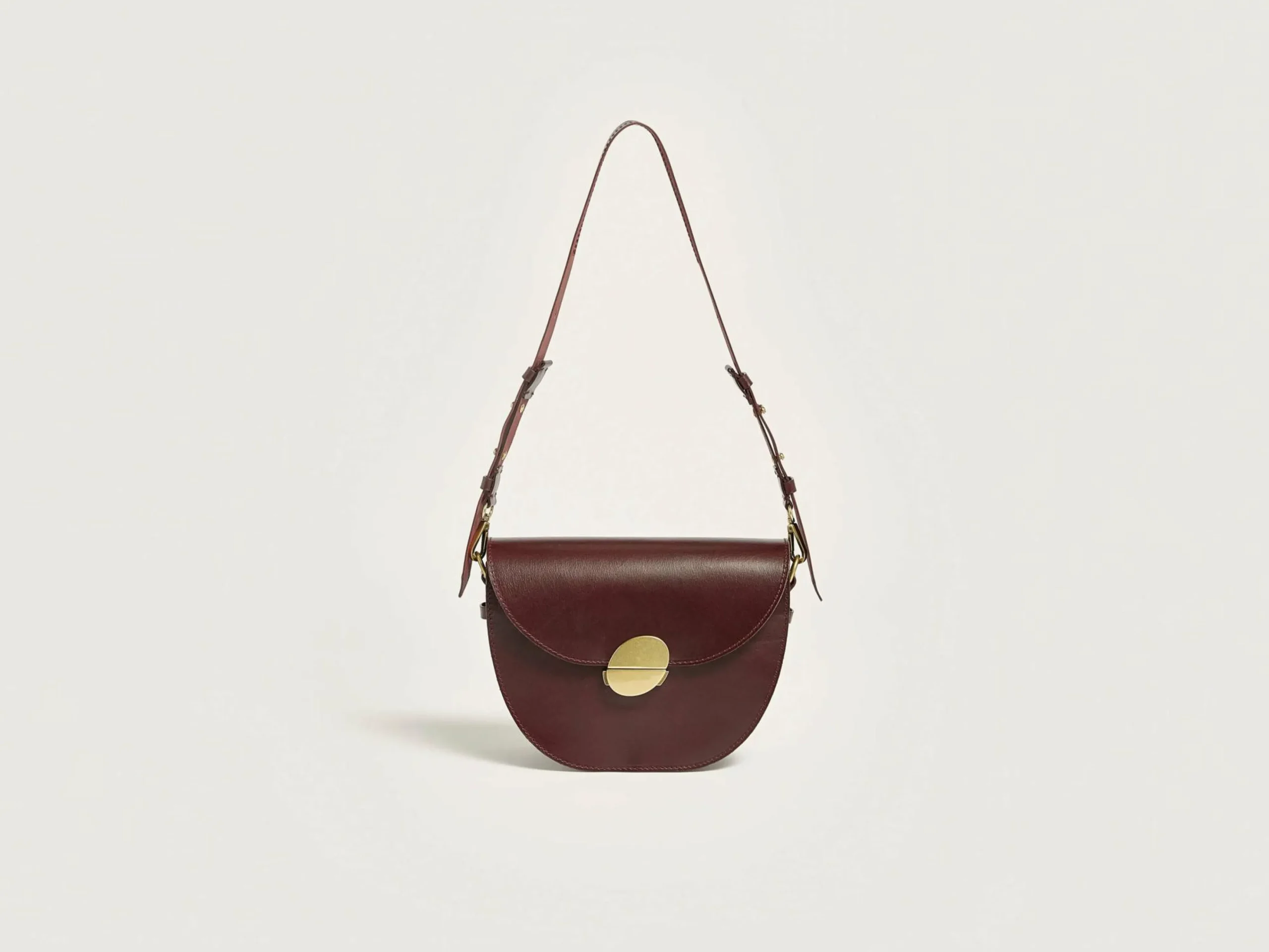 Halvemaanvormige schoudertas met gepolijste gesp, van wijnrood glad leer