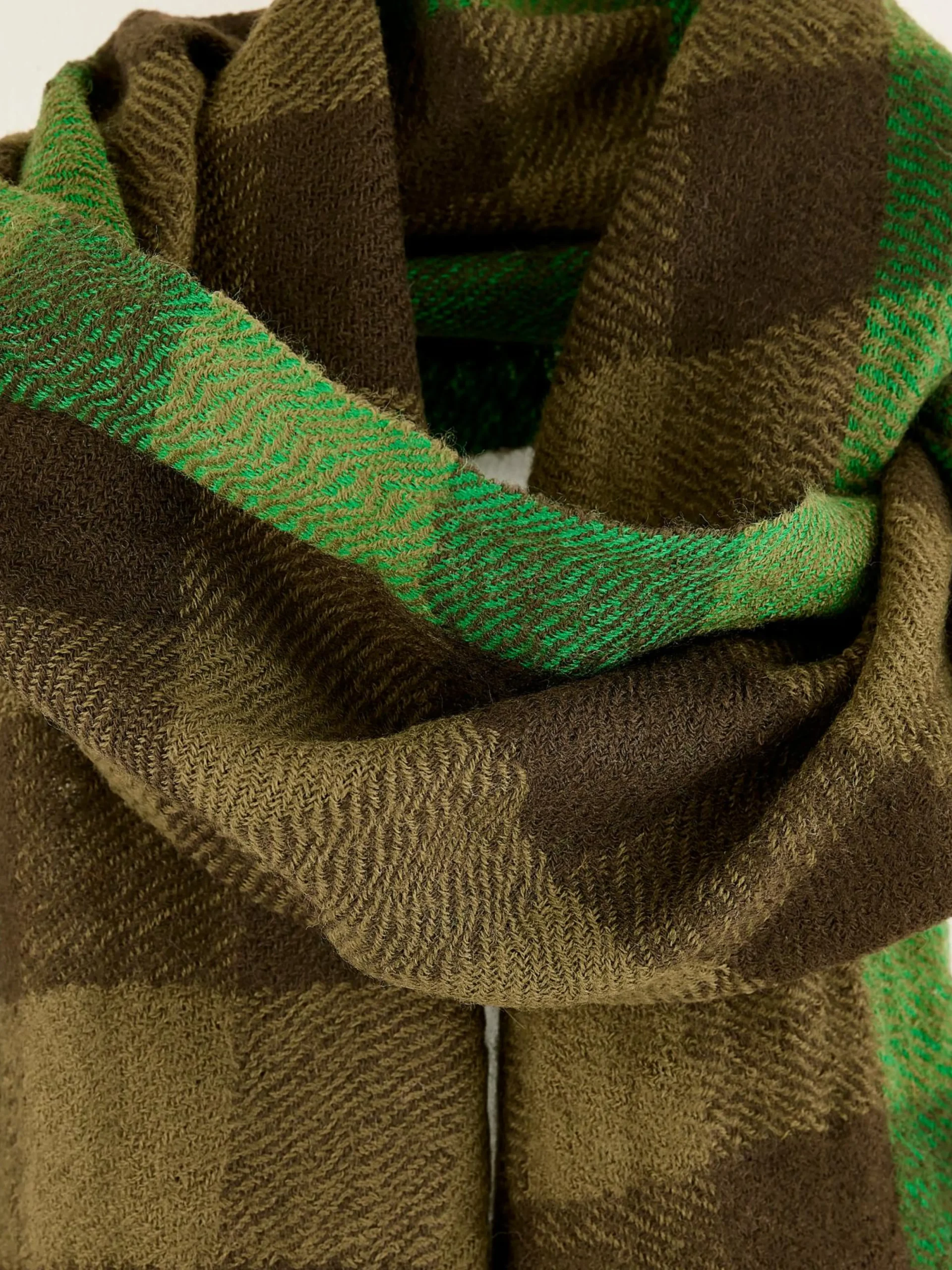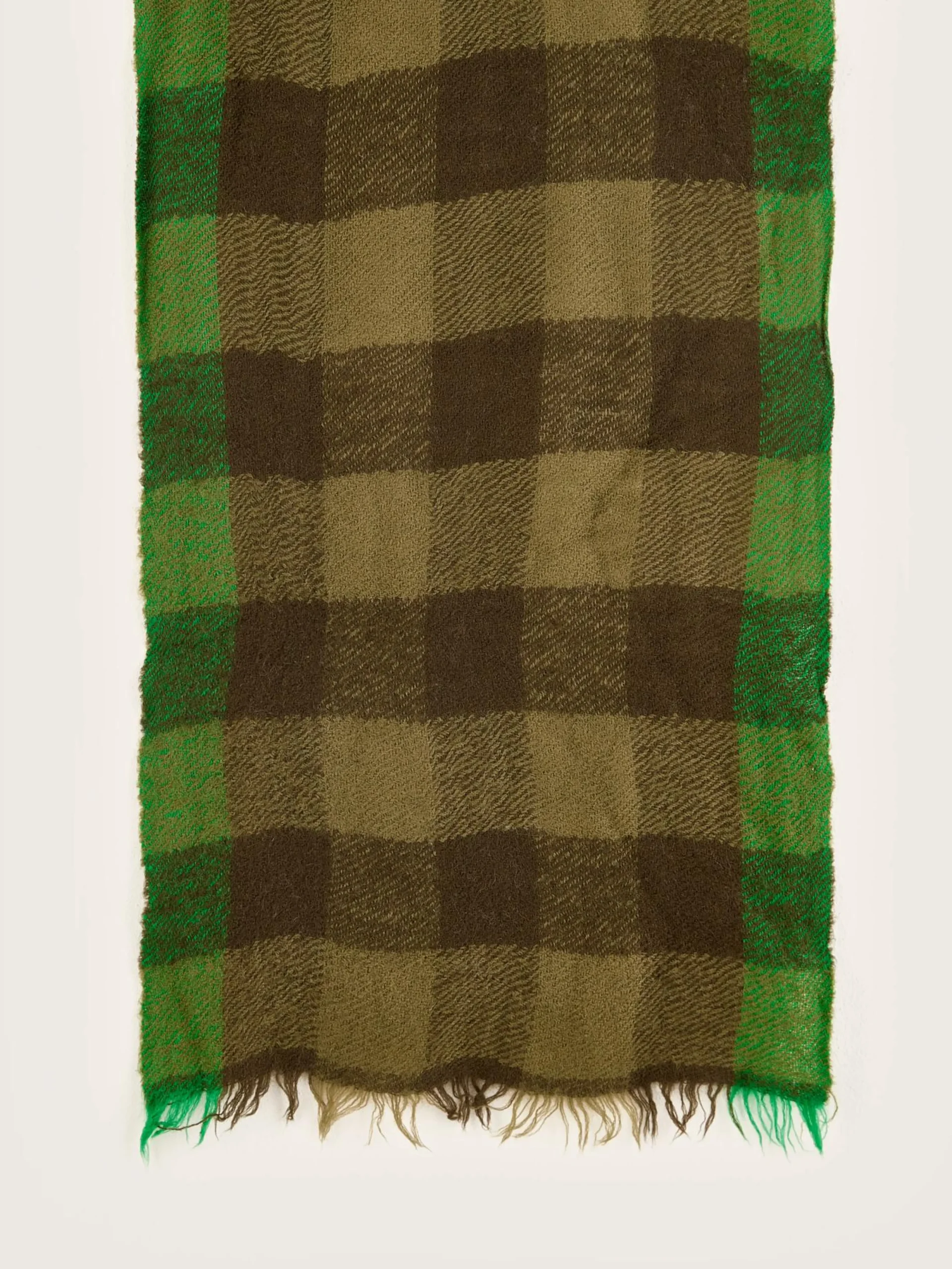 Klassiek geweven wollen sjaal met groene ruiten en franjes aan de randen.