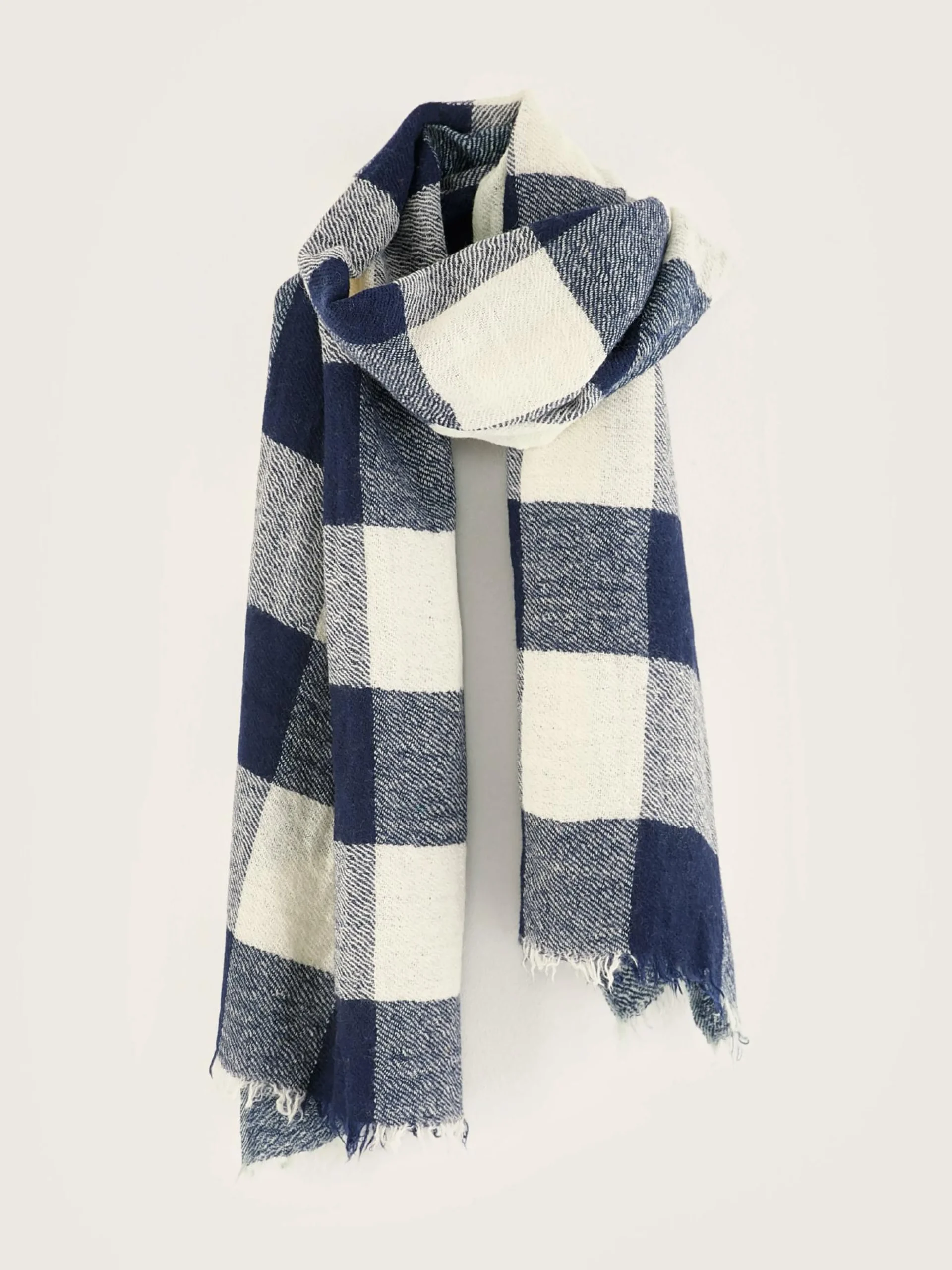 Klassiek geweven wollen sjaal met zwarte en witte ruiten, en franjes aan de randen.