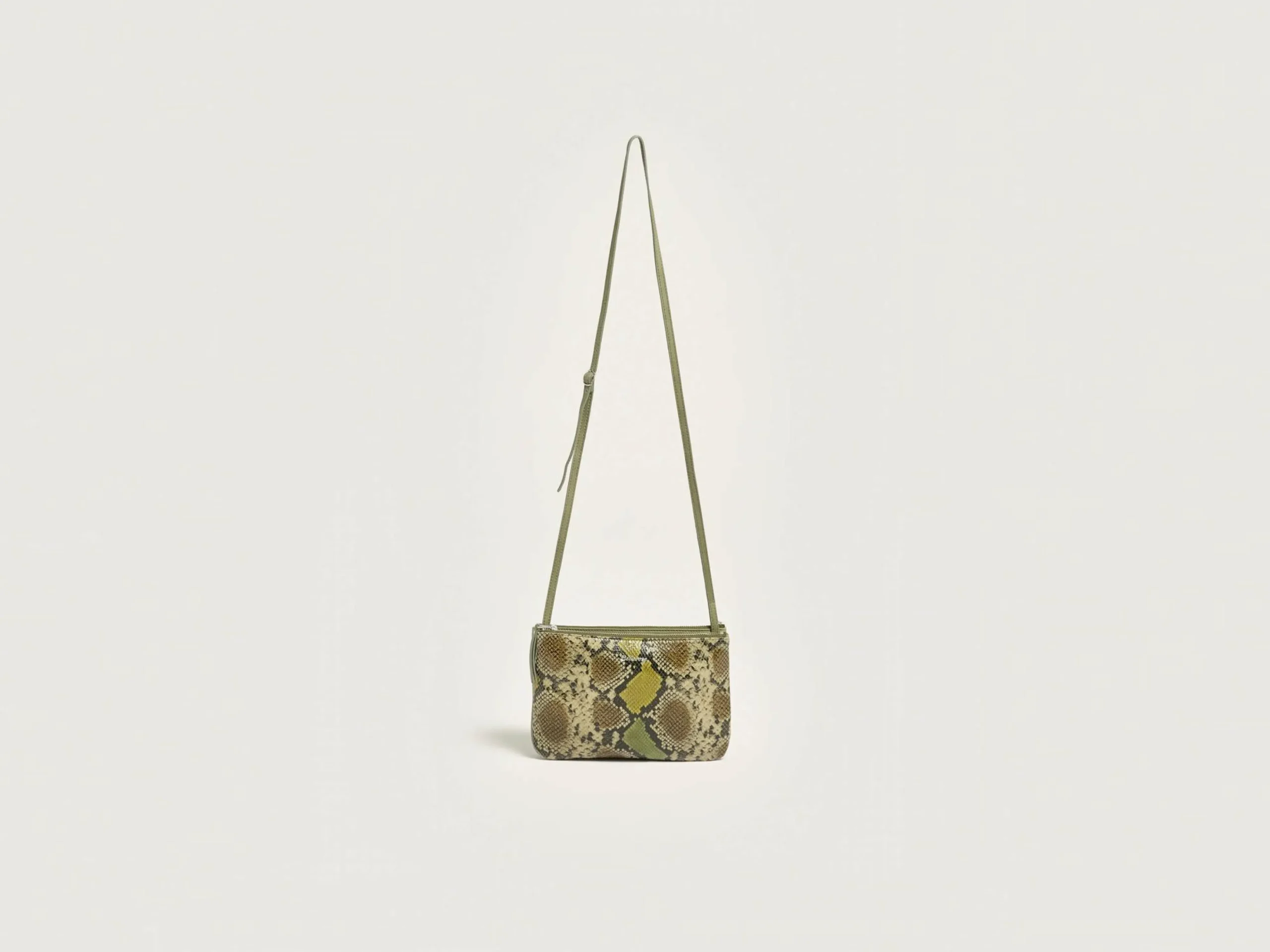 Minimalistische tas met twee vakken, van veelkleurig leer met pythonlook.