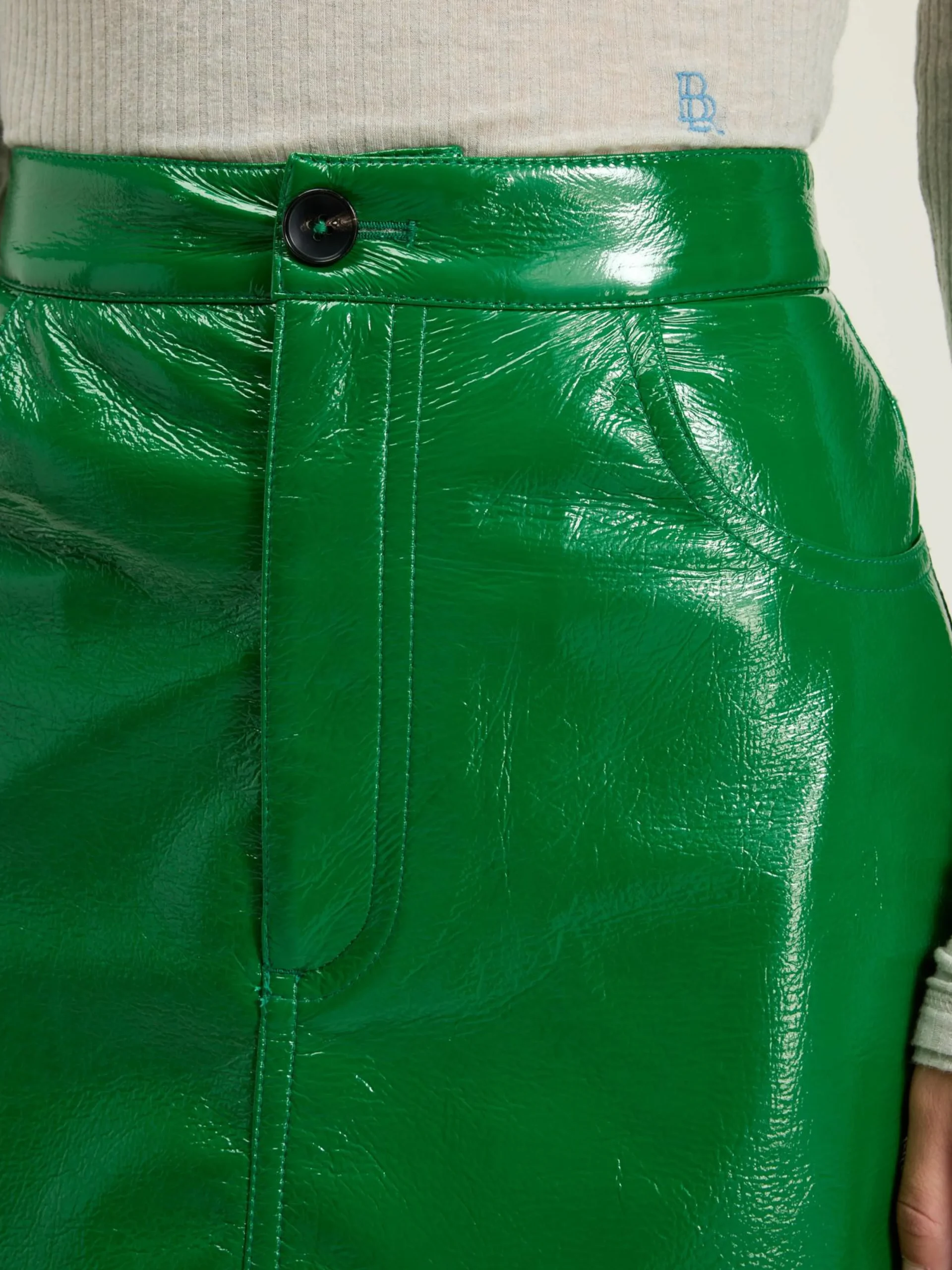 Muntgroen, trapeziumvormige minirok in five-pocketstijl, van imitatieleer.