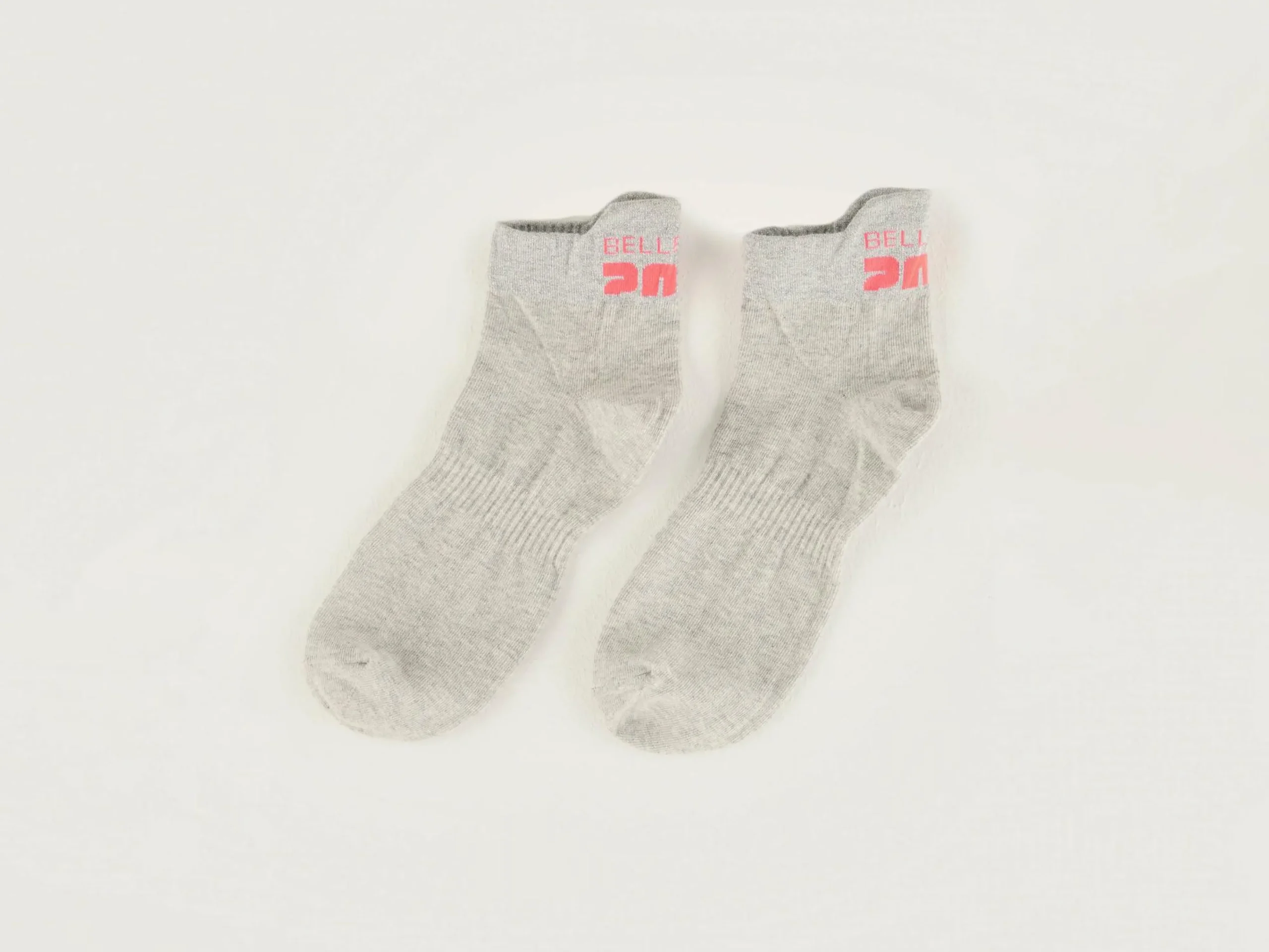 Sportieve grijze enkelsokken met het Bellerose 2024-logo op de hiel.