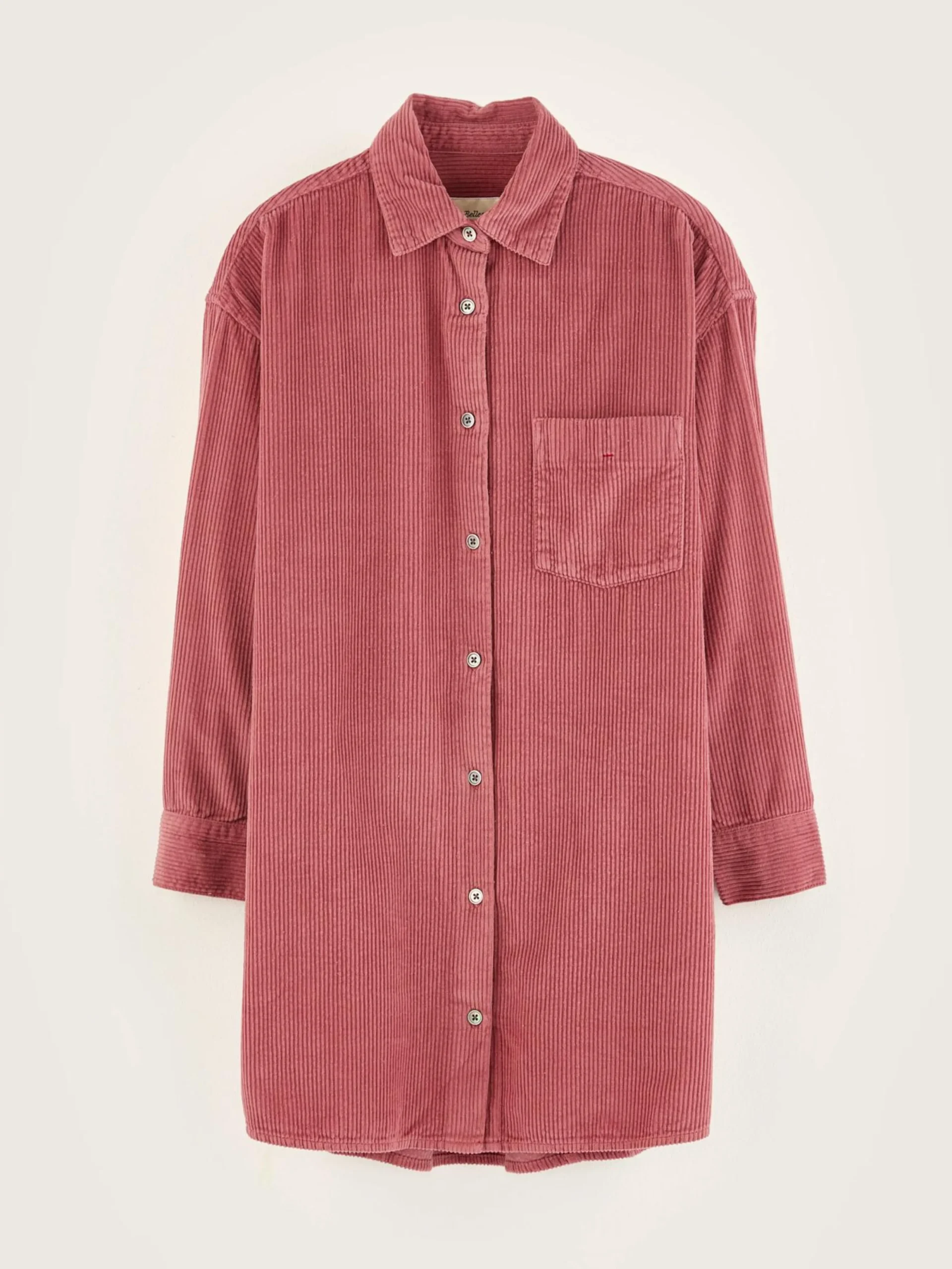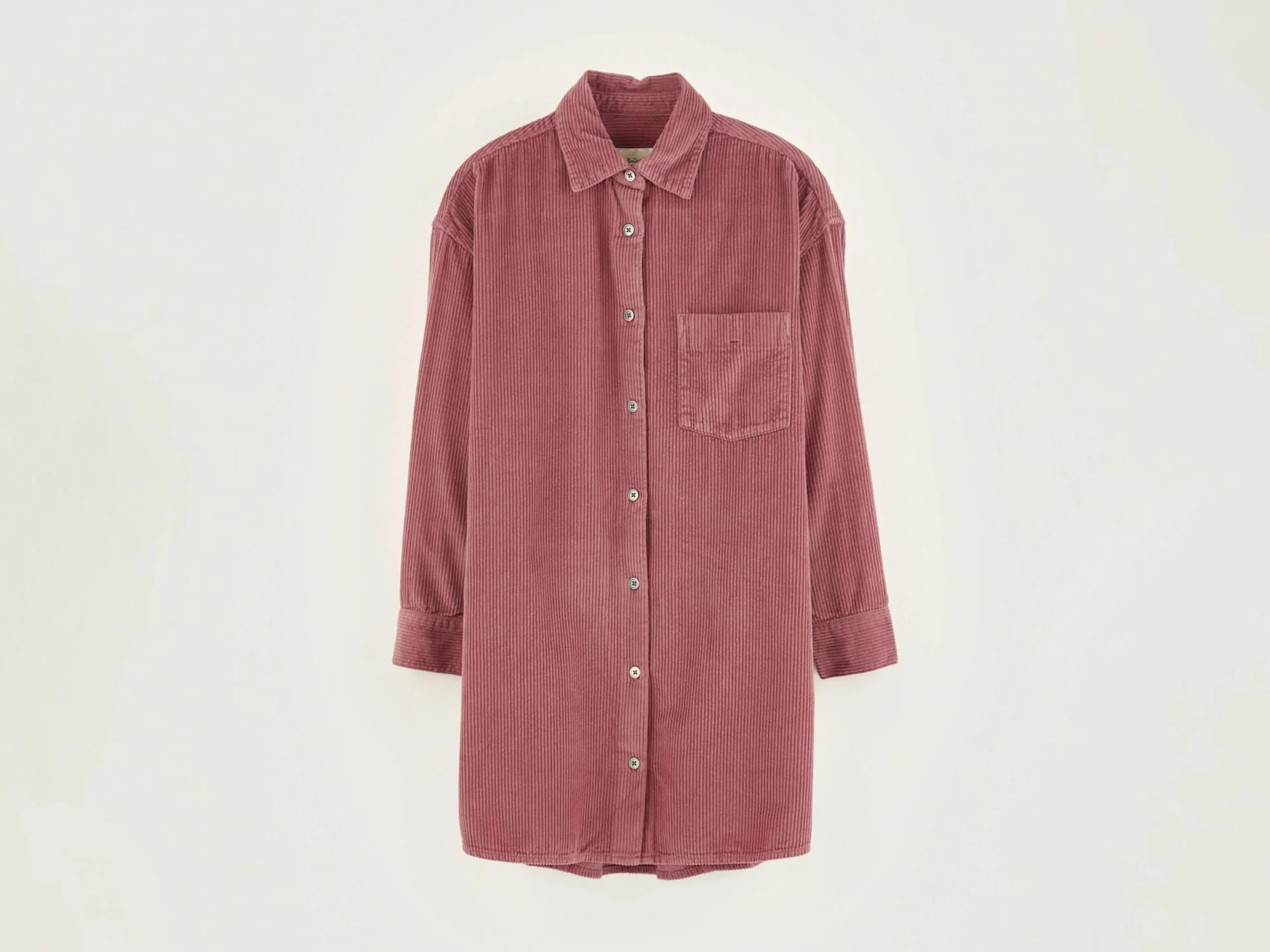 Korte jurk in hemdstijl, van rozekleurig katoenen corduroy.