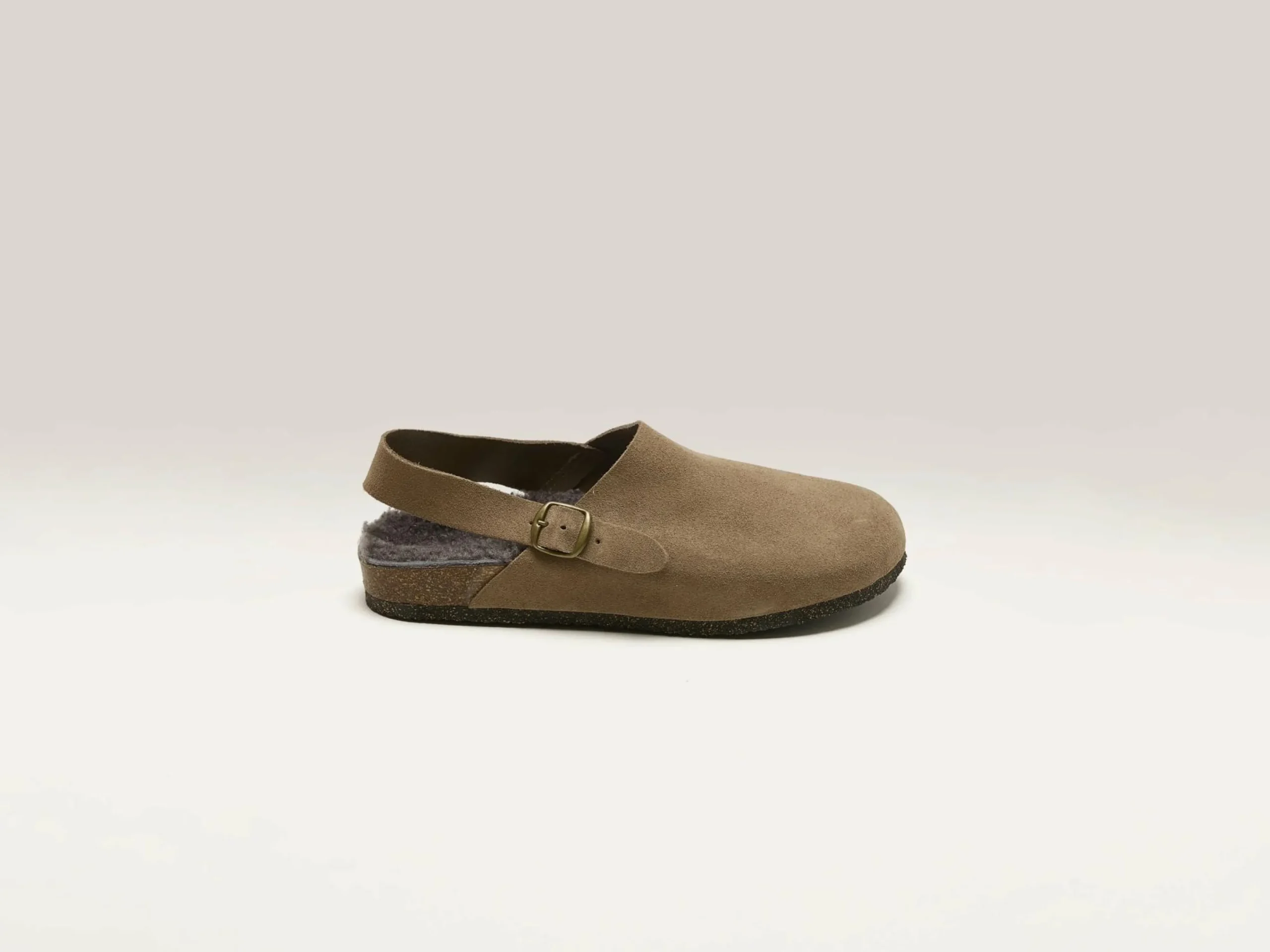De Bosabo Taupe Suède klompen zijn handgemaakt in Frankrijk met een zacht suède bovenwerk en een schapenvacht gevoerd voetbed.