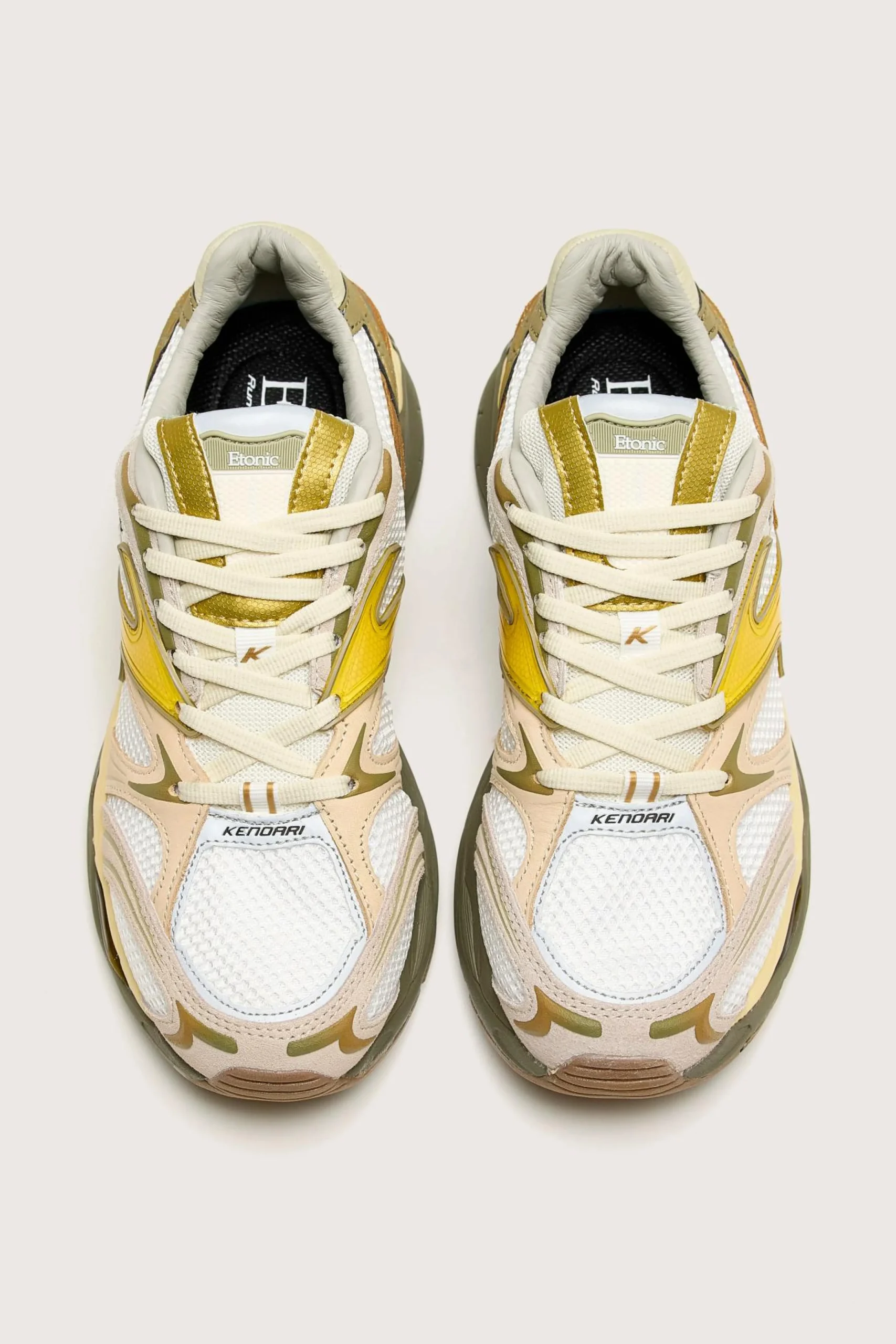 The Etonic Kendari Leaf running sneaker features a technical textile and mesh upper with leather panels, tonal laces, and comfort details.