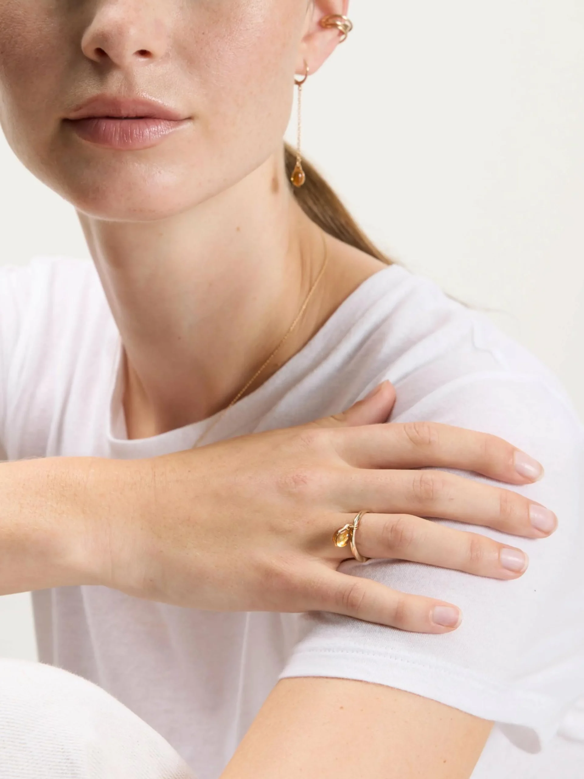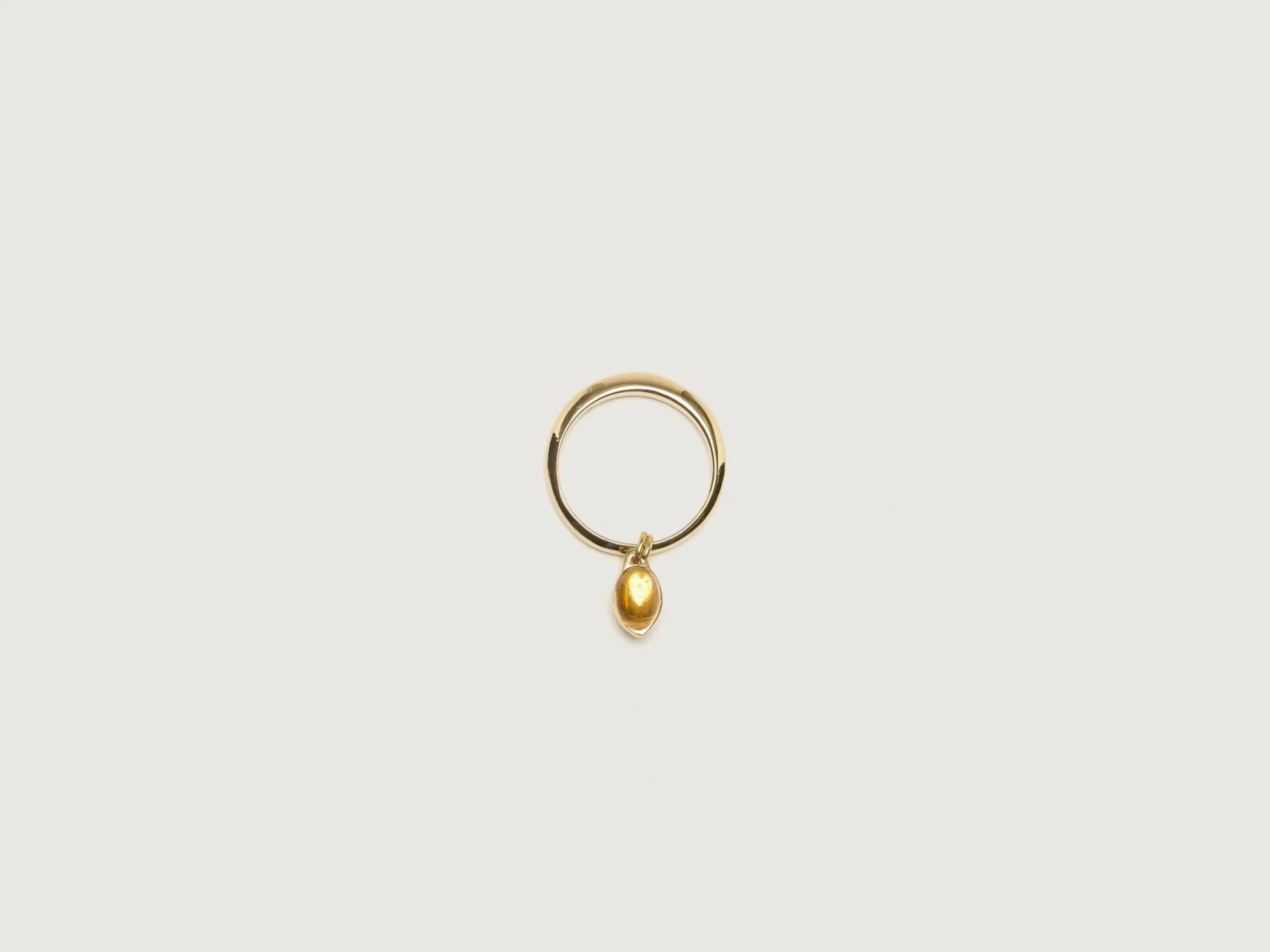 De Helena Rohner Citrine druppelring heeft een citrien edelsteen die aan een 18k vergulde band hangt.