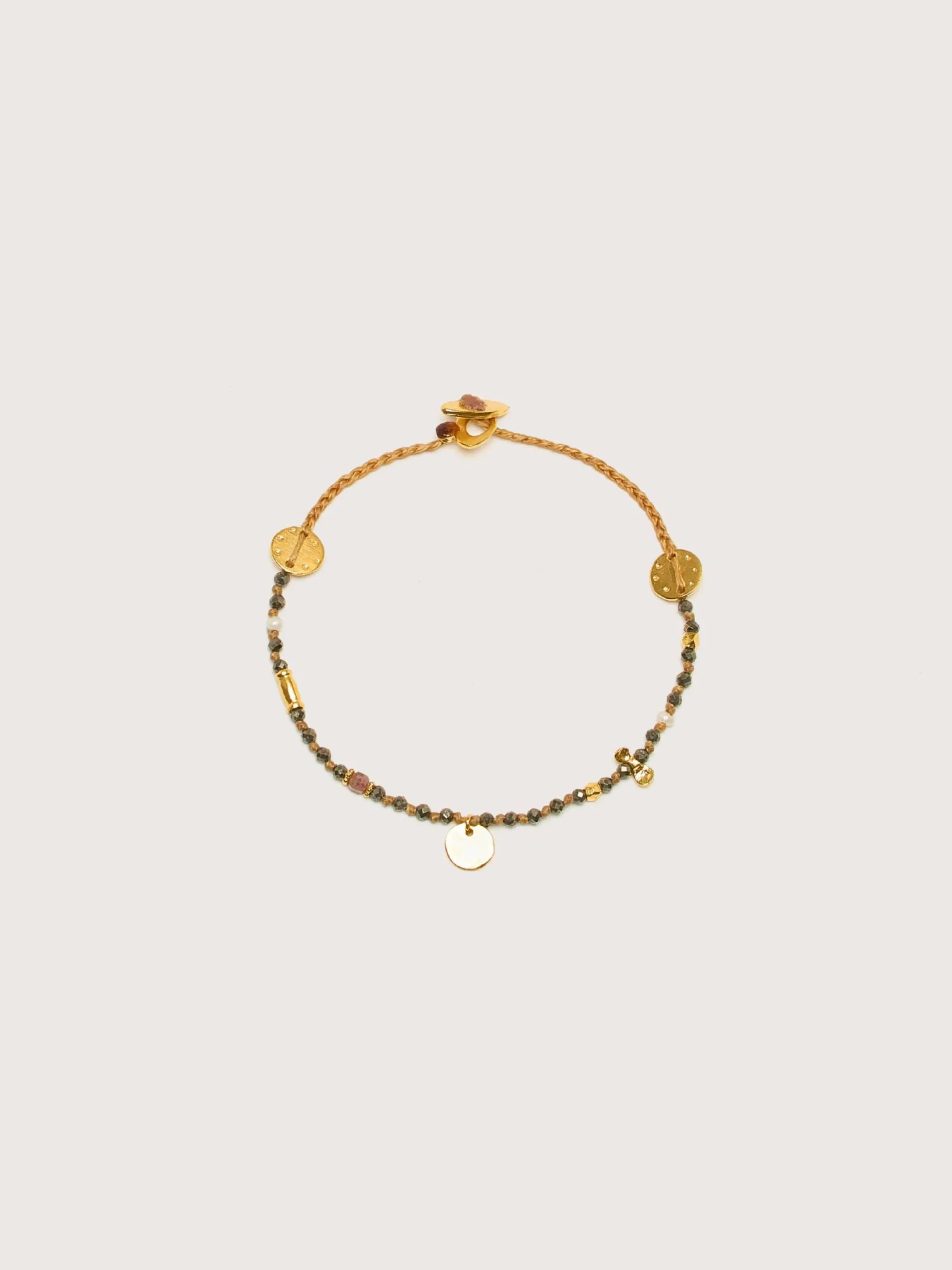 The Mary Gaitani Pyrite bracelet is handmade in Greece with pyrite stones and 18k gold-plated charms on a waxed cord.